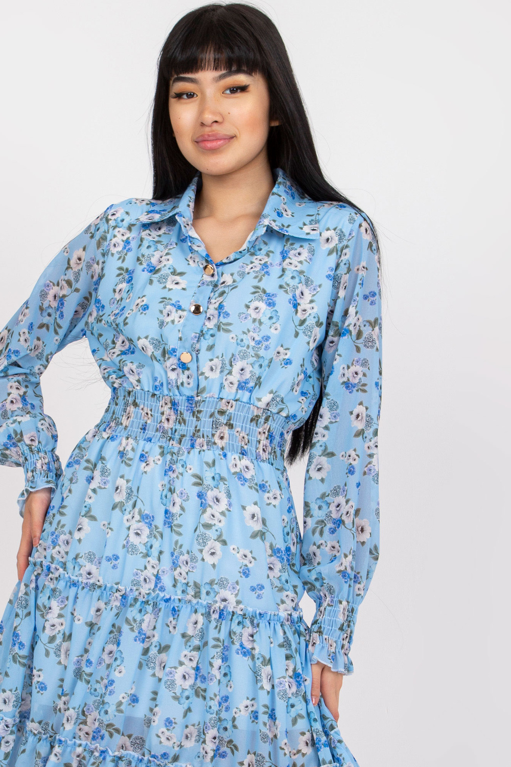 Mėlynos spalvos suknelė su gėlių raštais ir apykakle.