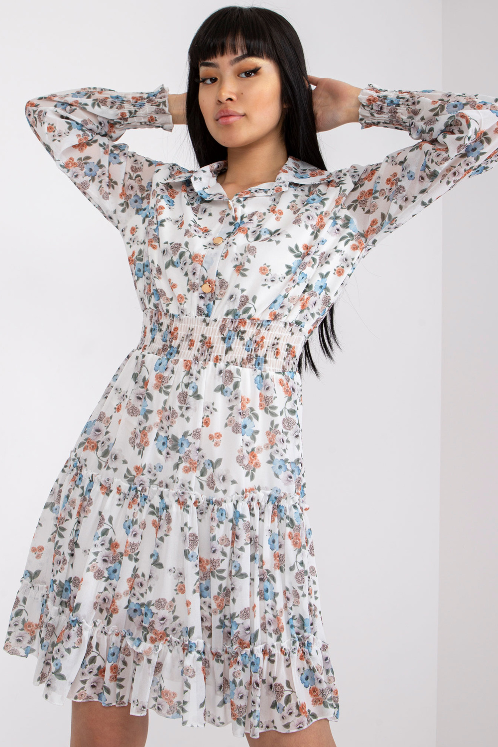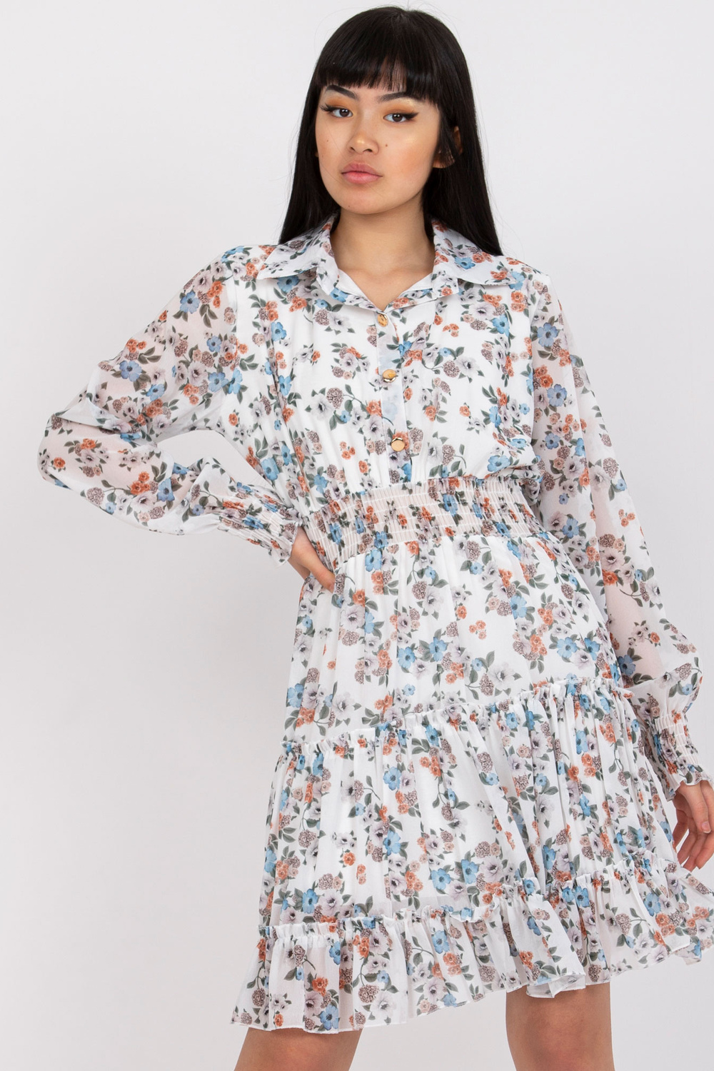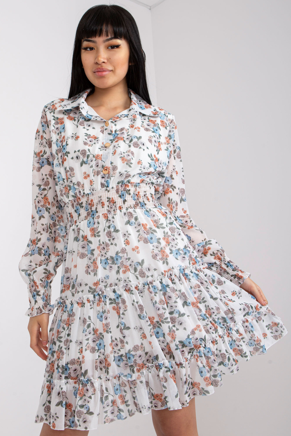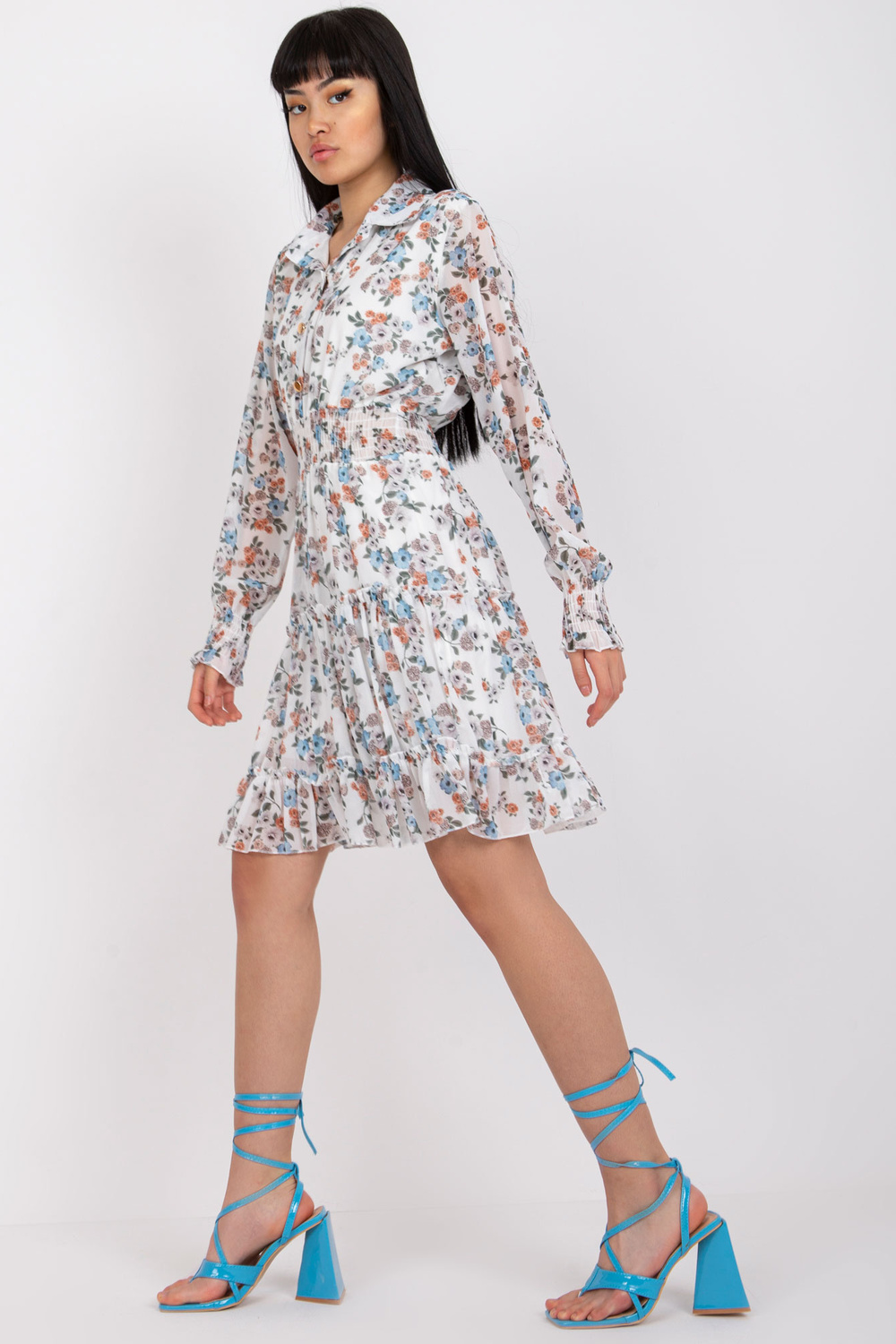 Balta suknelė su gėlėmis ir ilgomis rankovėmis.