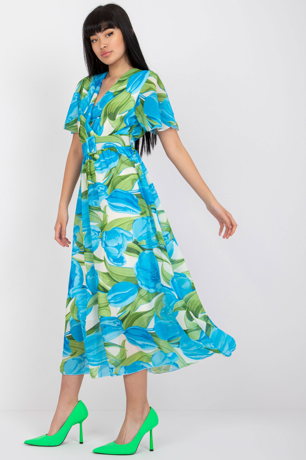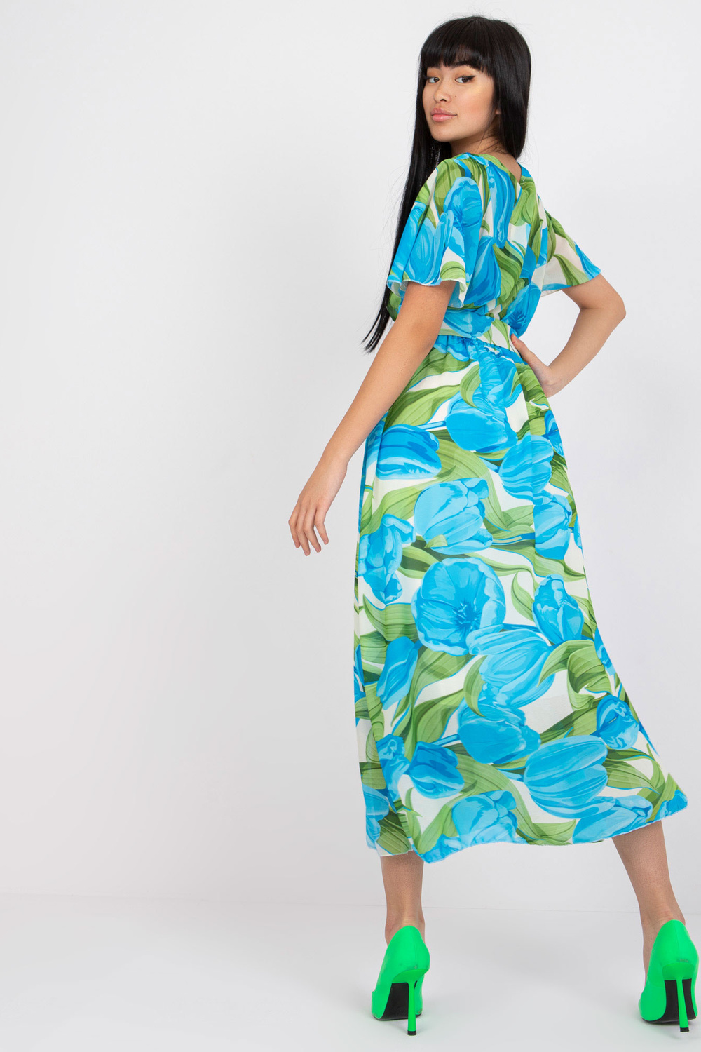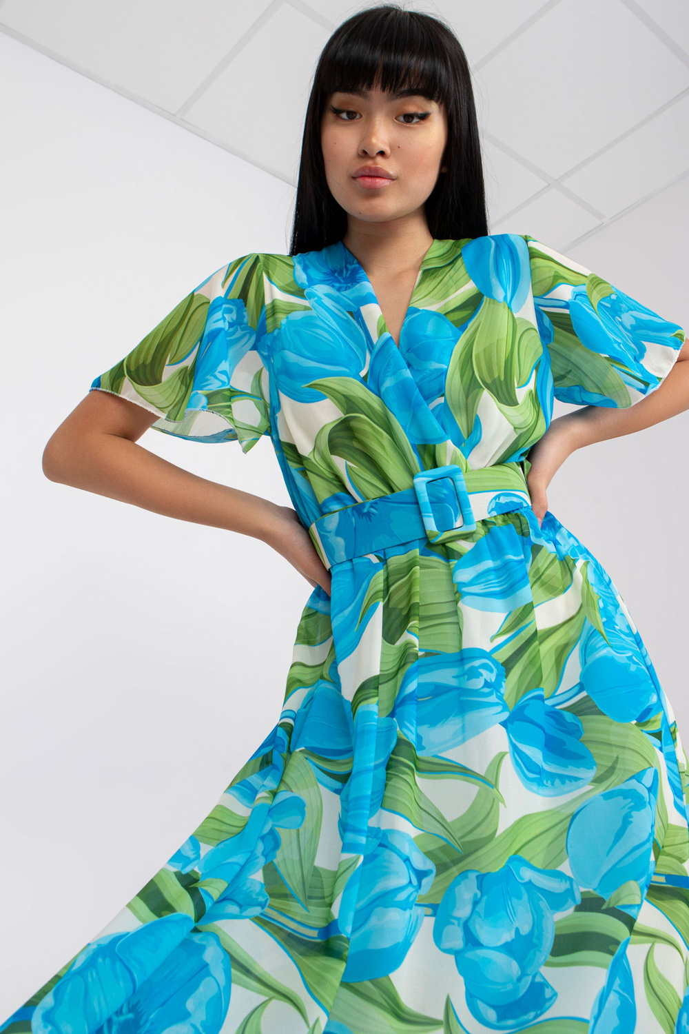 Mėlynos ir žalios spalvos įvyniojama suknelė su raštais ir trumpomis rankovėmis . priedai: pamušalas, dirželio medžiagasudėtis: 95% poliesteris, 5% elastanas skalbimo būdas: skalbimas mašinoje 30°C Gaminio kodas: DHJ-SK-15967.54P dominuojantis raštas: gėlės Stilius: laisvalaikio galimybė: skirta