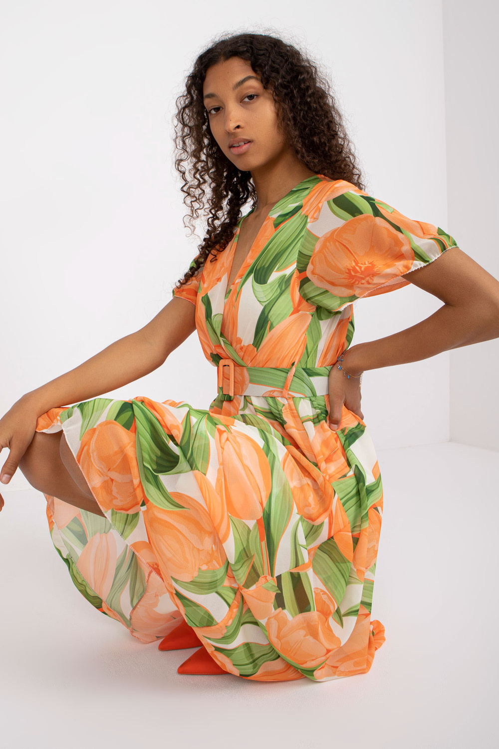 Oranžinės-žalia-midi ilgio suknelė su raštais. aksesuarai: pamušalas, dirželio medžiagasudėtis: 95% poliesteris, 5% elastanas skalbimo būdas: skalbimas mašinoje 30°C Gaminio kodas: DHJ-SK-15967.54P dominuojantis raštas: gėlės Stilius: laisvalaikio galimybė: miestui, tinka