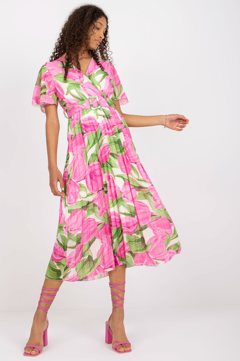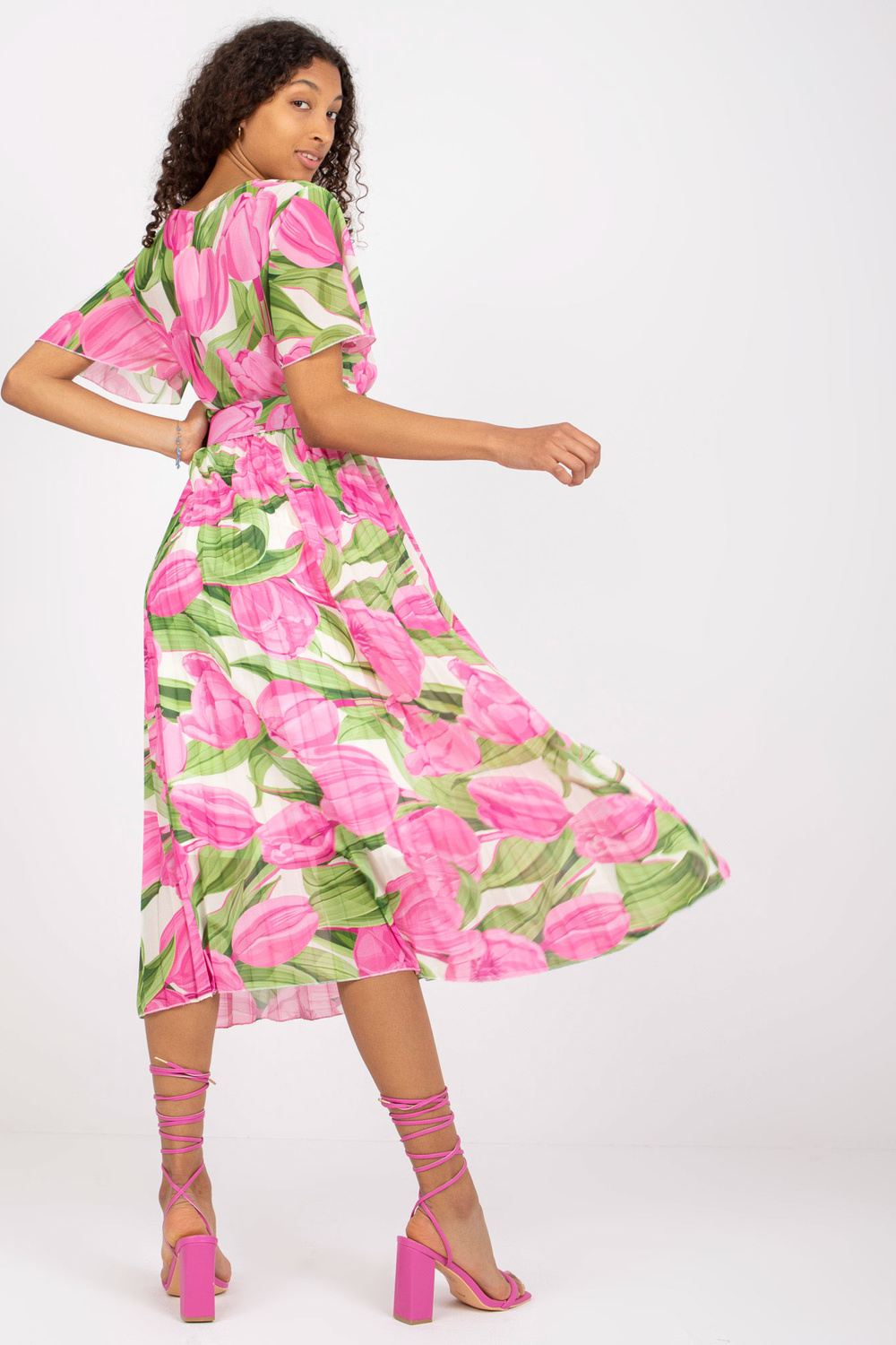 Rožinės spalvos klostuota vieno dydžio suknelė su gėlių raštu .