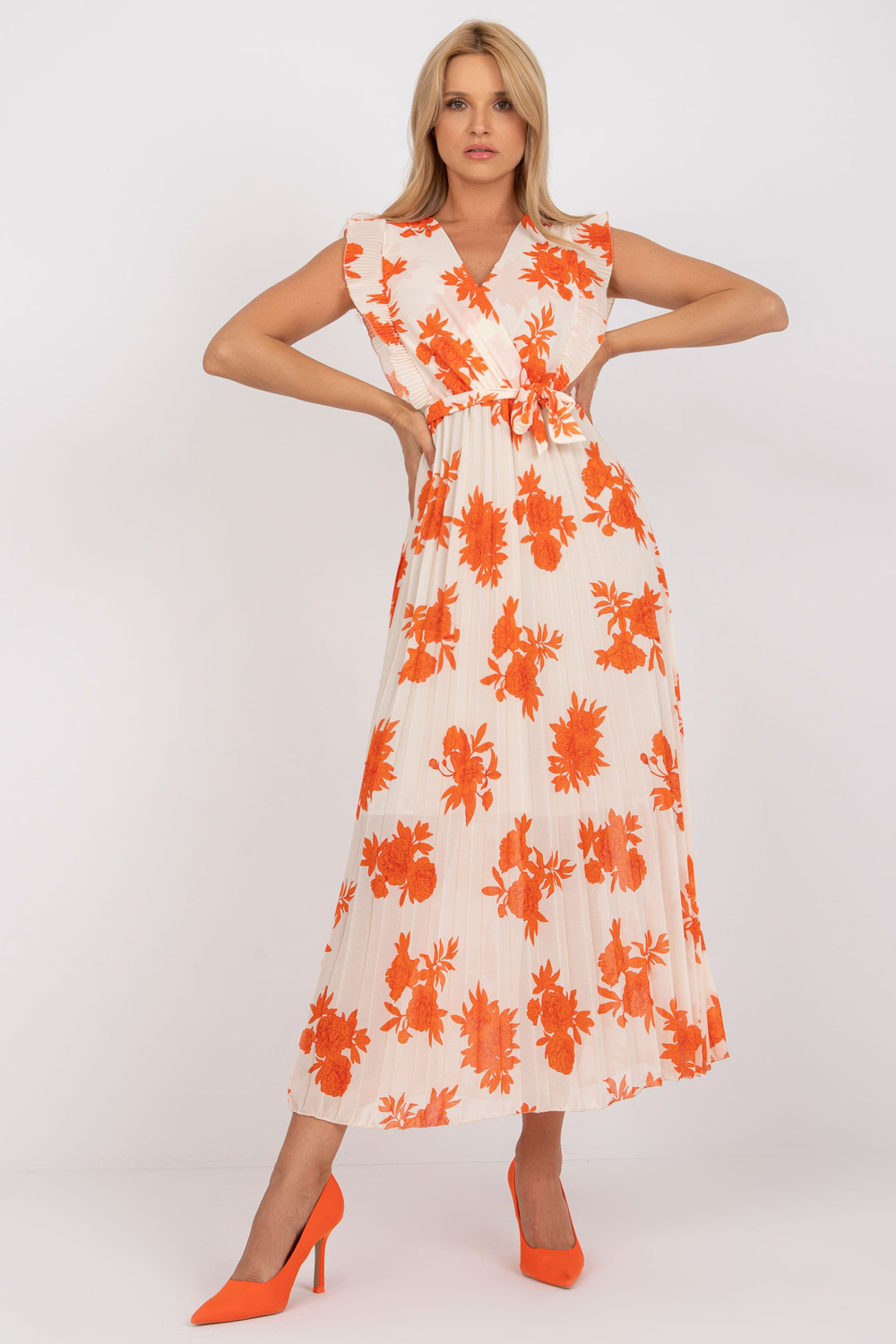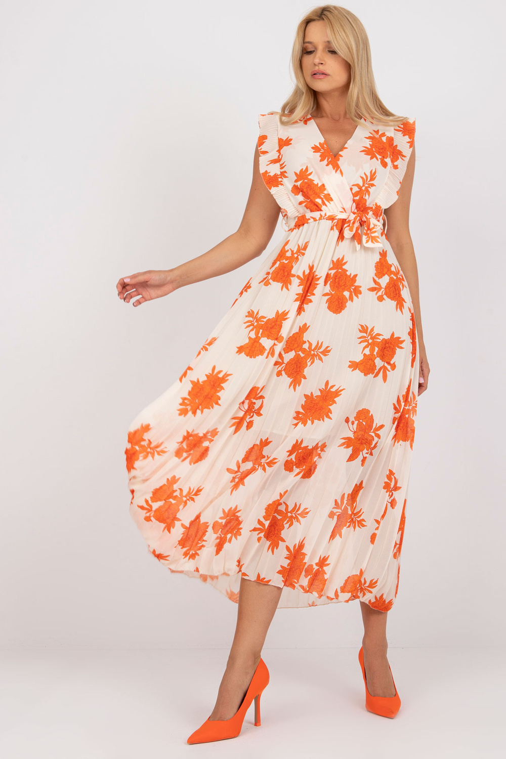 Smėlio ir oranžinės spalvos ilga klostuota suknelė su raštais .