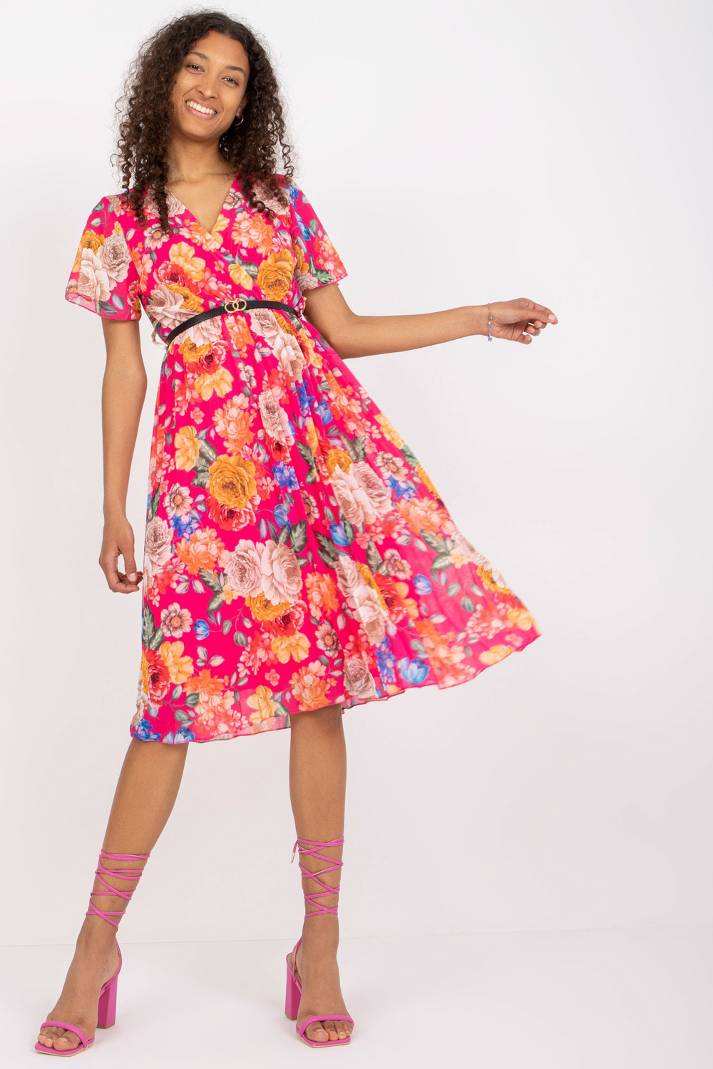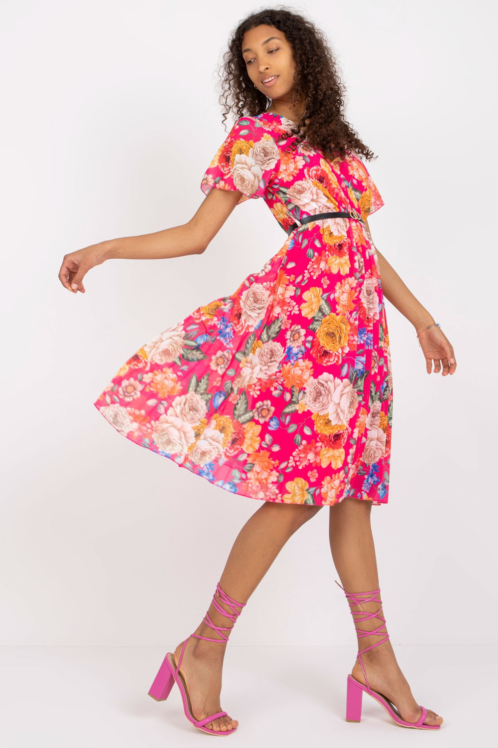 Rožinė, klostuota, gėlėta suknelė trumpomis rankovėmis