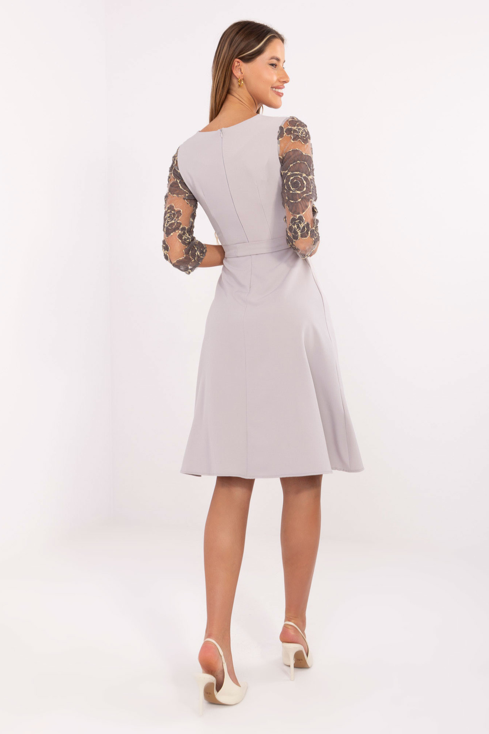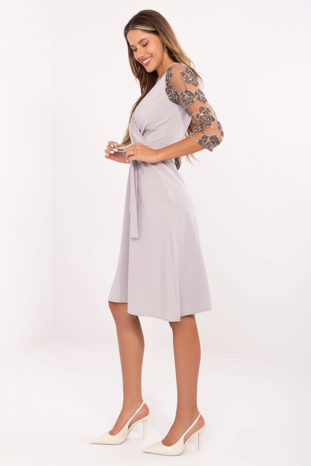 Pilka midi kokteilinė suknelė su įvyniojama iškirpte