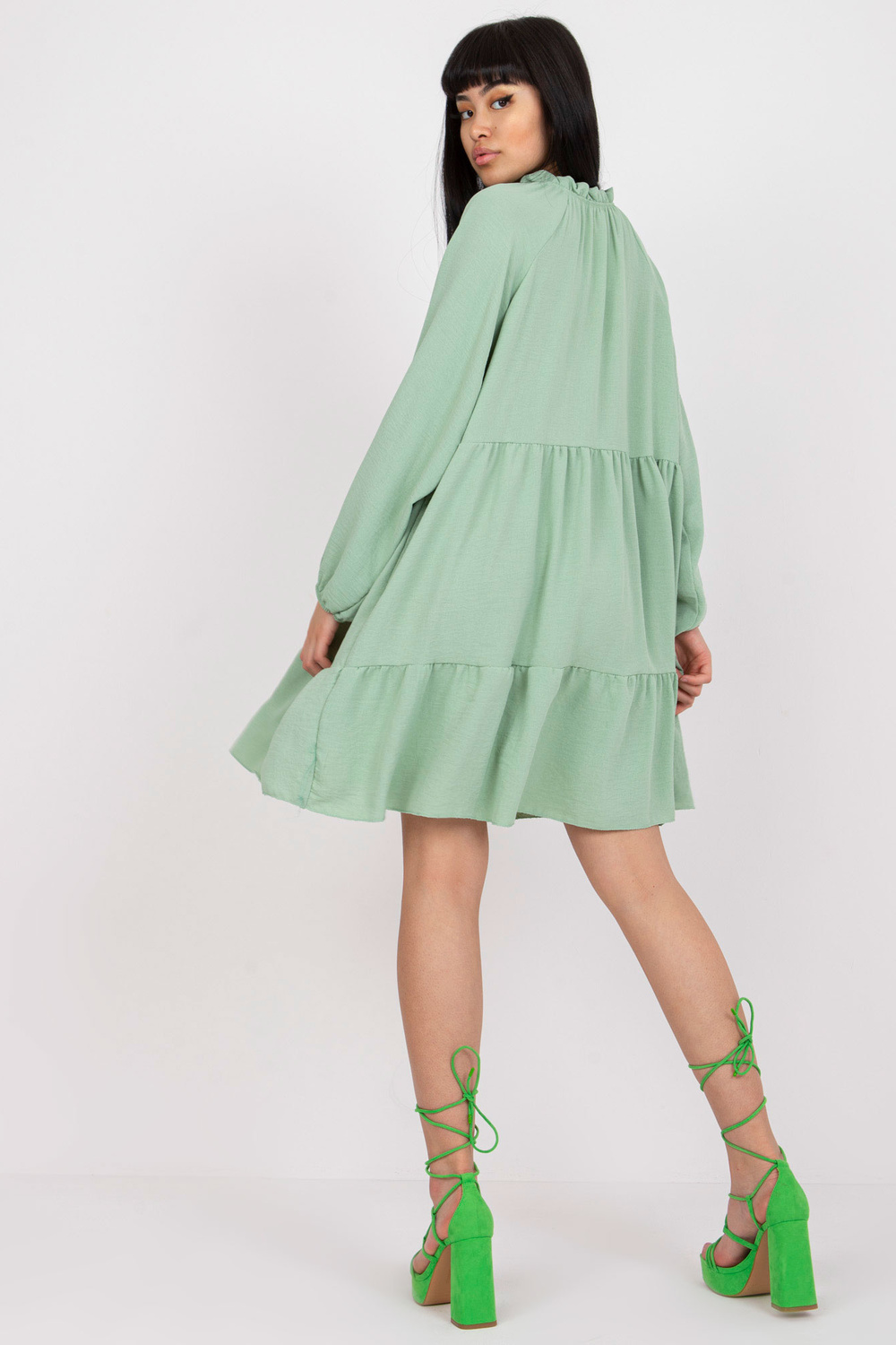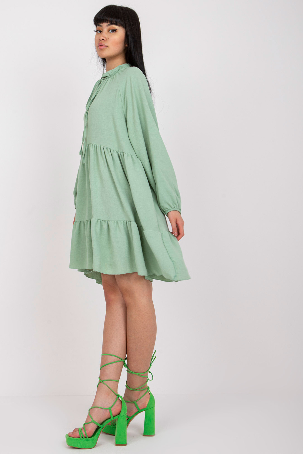 Šviesiai žalia boho stiliaus suknelė su pūkuotėmis.