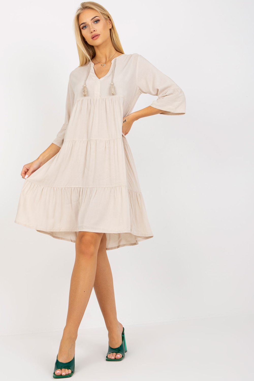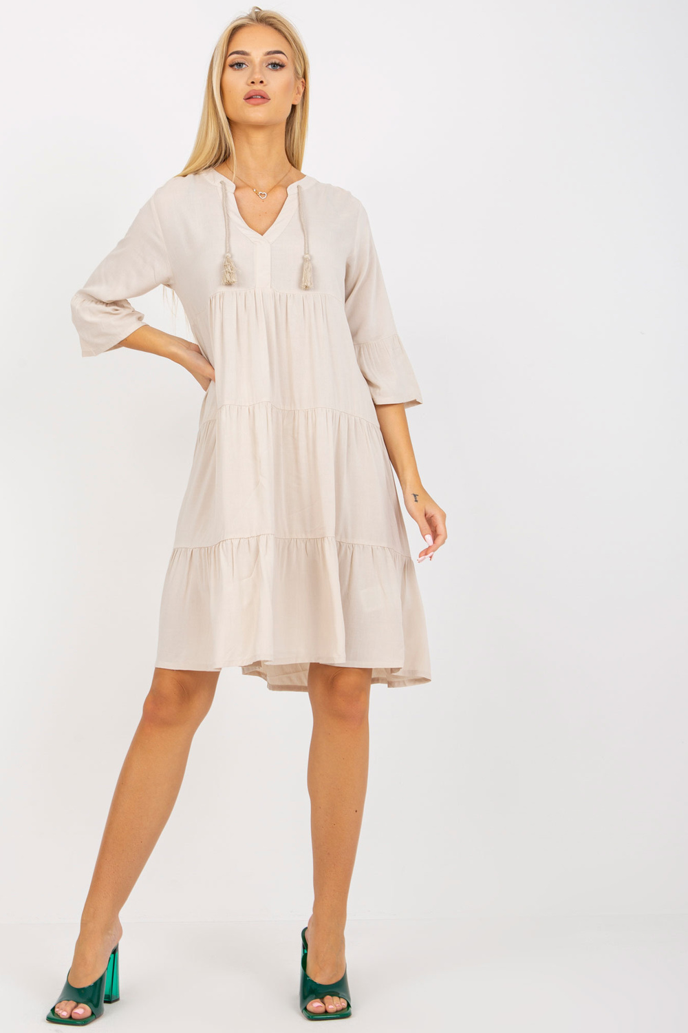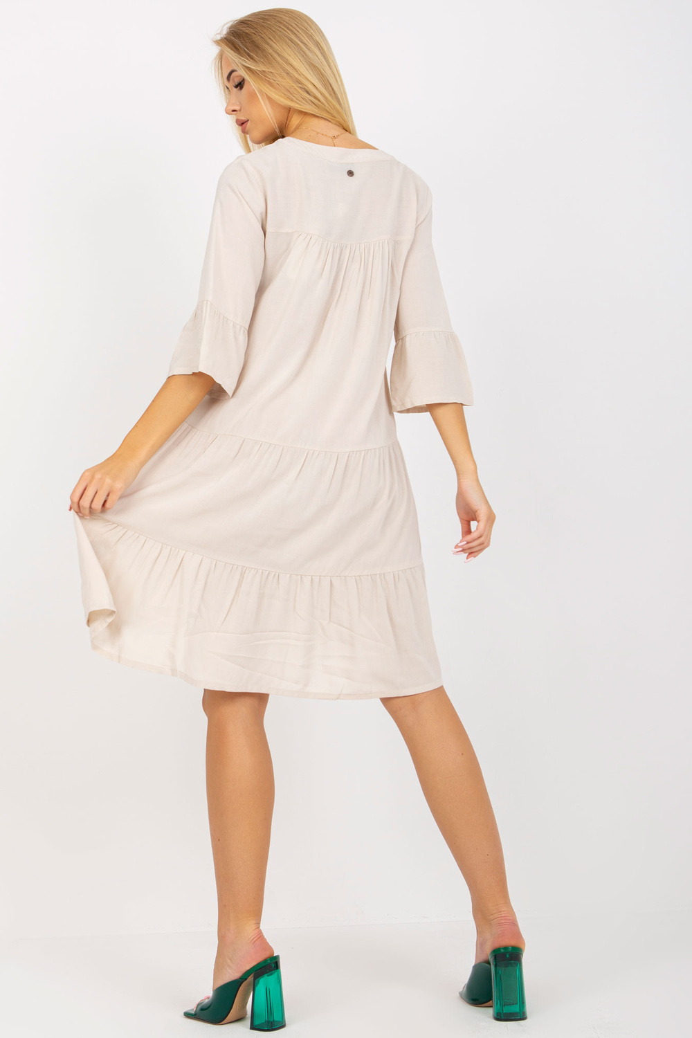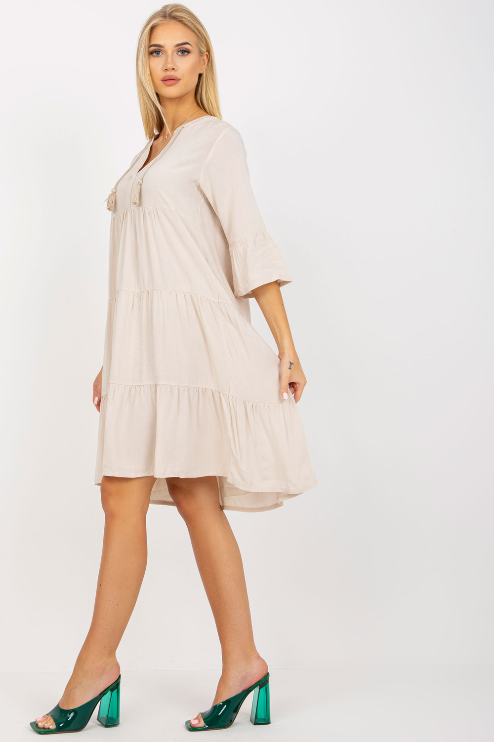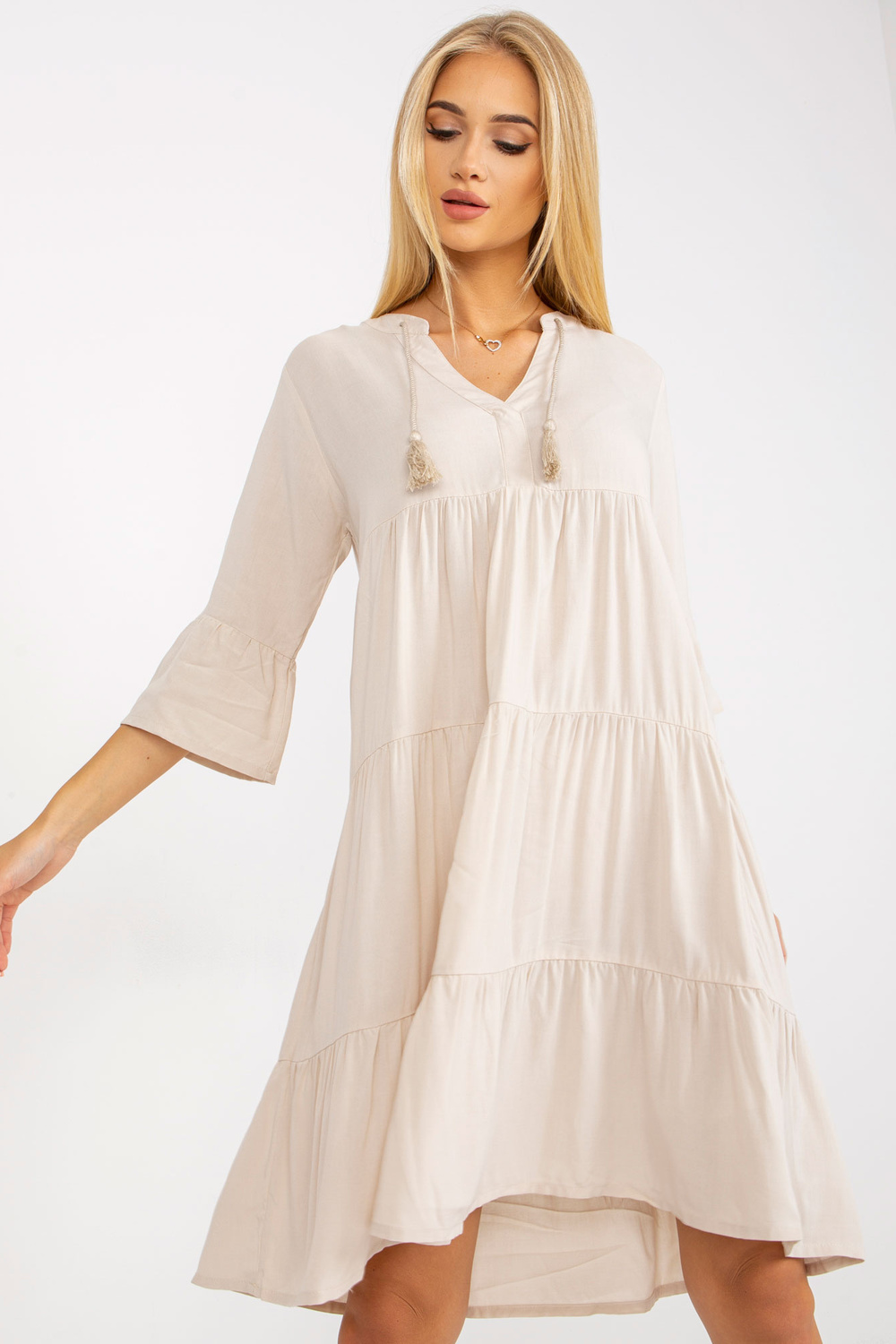 Šviesiai smėlio spalvos oversize suknelė su raukiniais ir 3/4 rankovėmis .