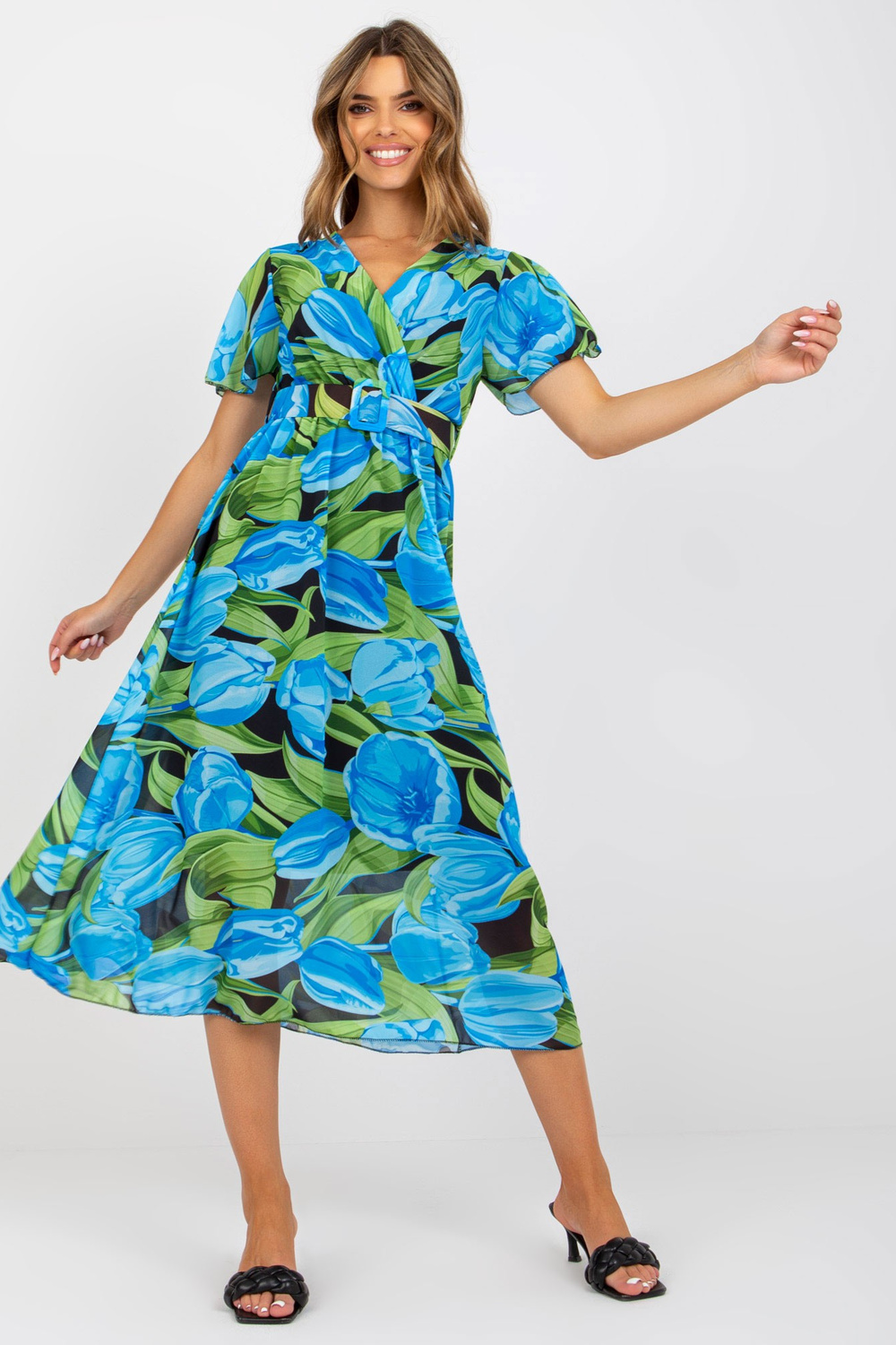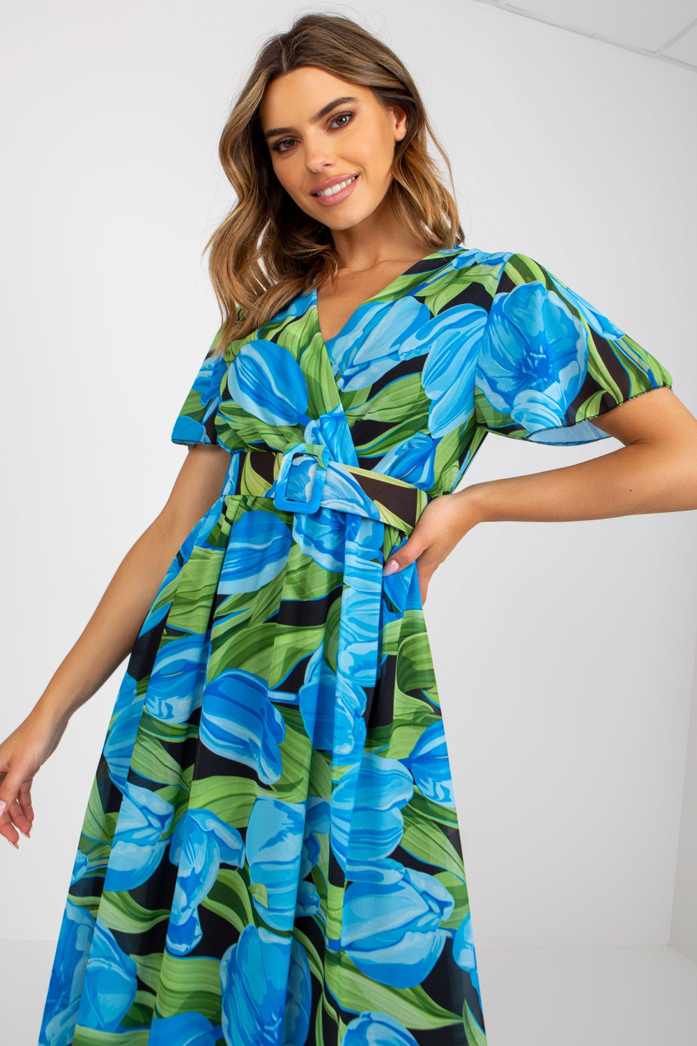 Mėlynos ir juodos spalvos midi suknelė su diržu .