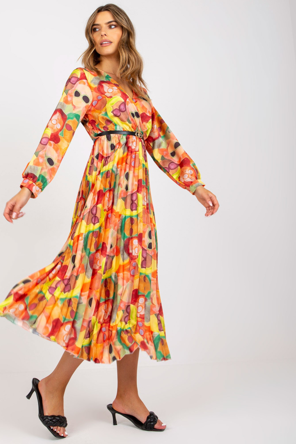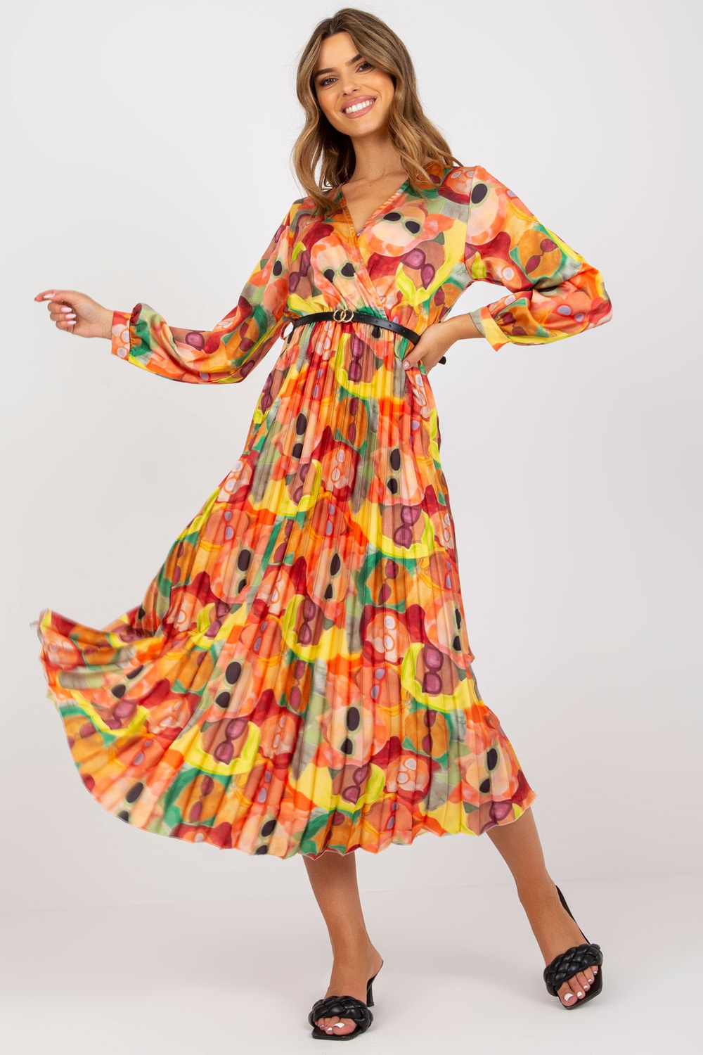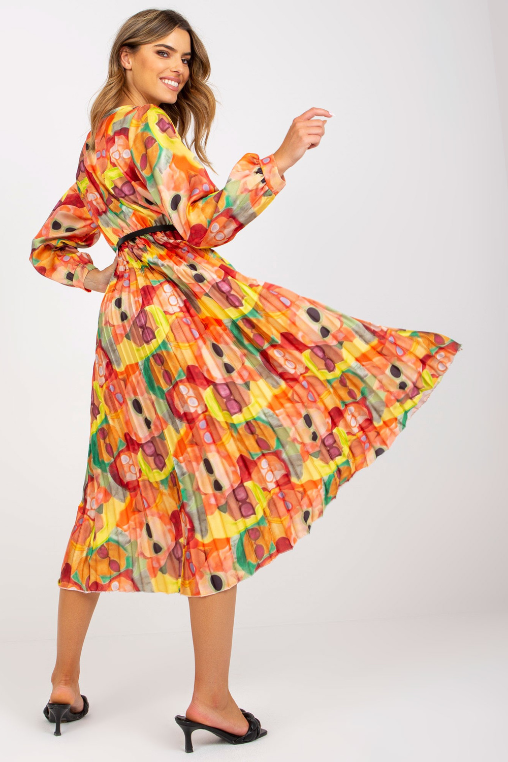 Oranžinė klostuota suknelė su spalvingais raštais .