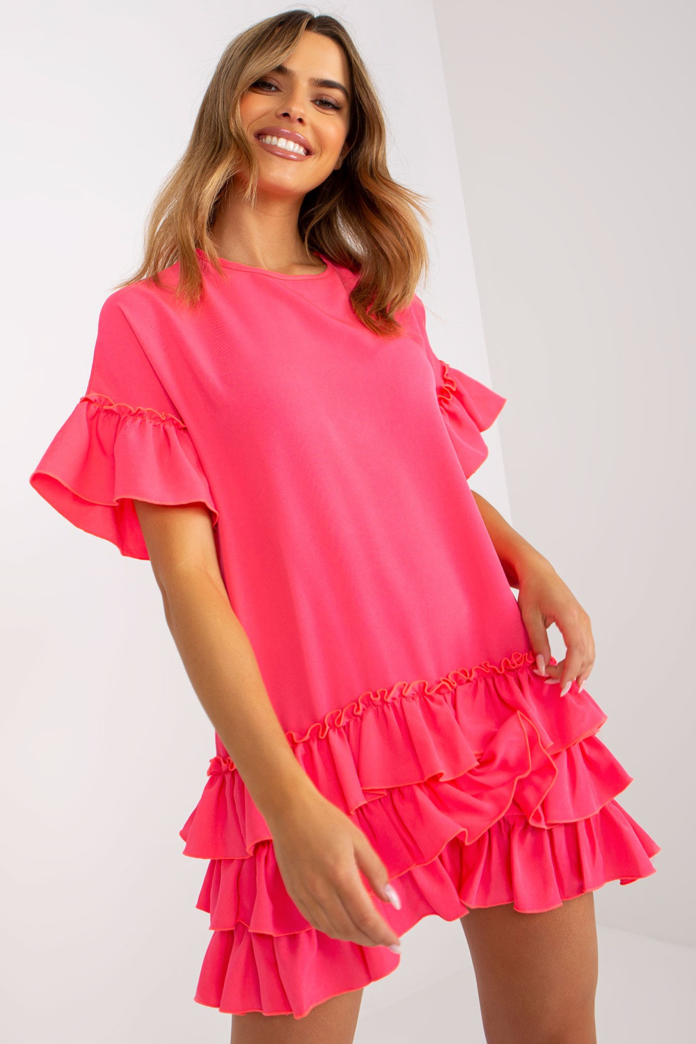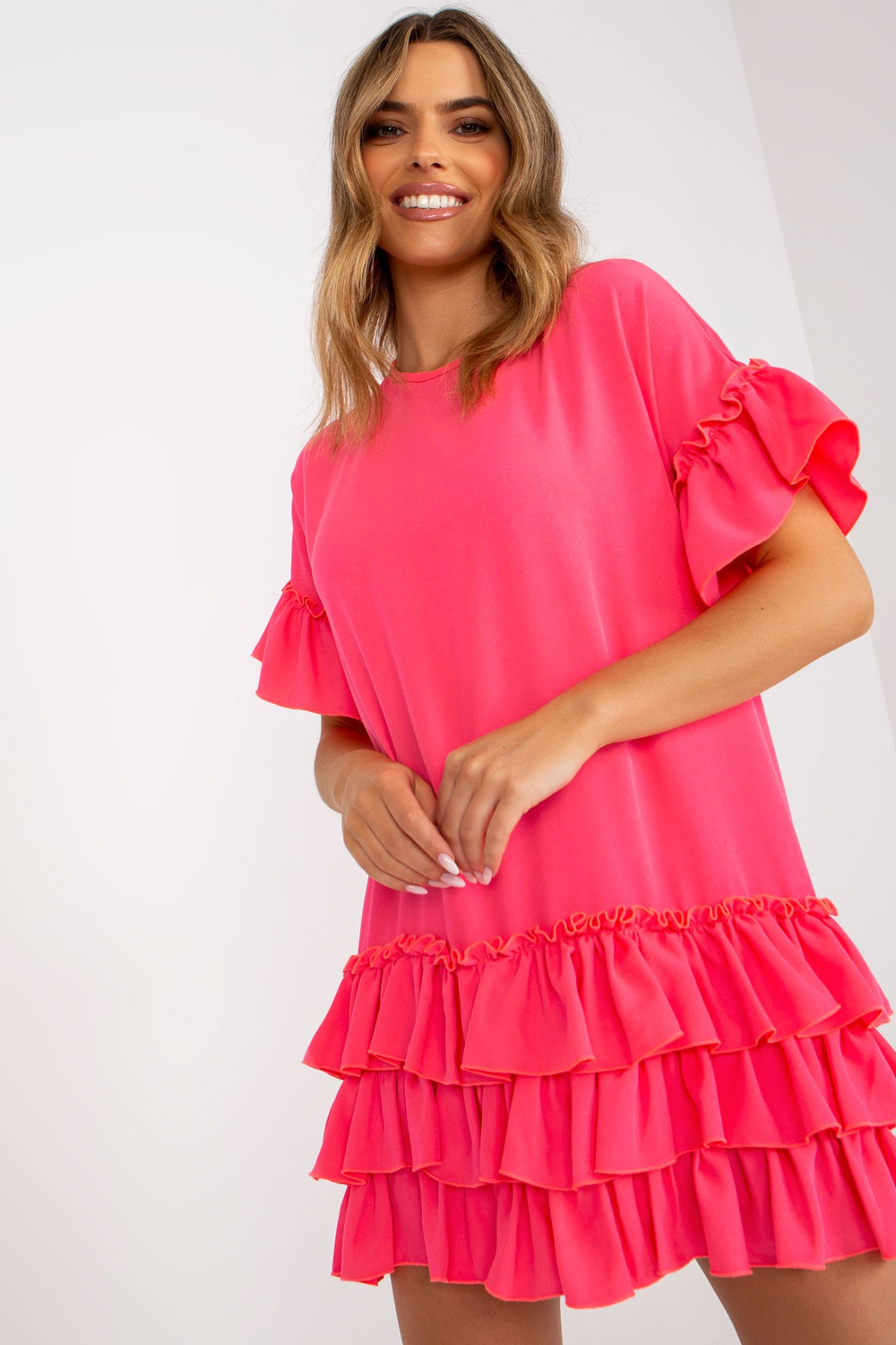 Fluopink suknelė su raukšlėmis ir trumpomis rankovėmis RUE PARIS .