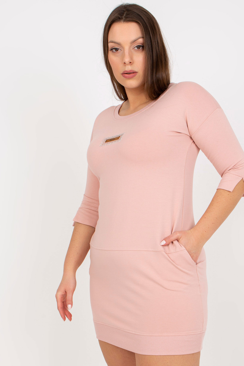 Nešvarios rožinės spalvos prigludusi mini suknelė su aplikacijomis.