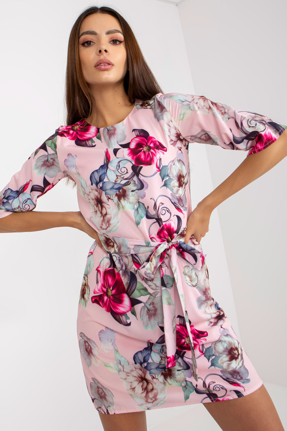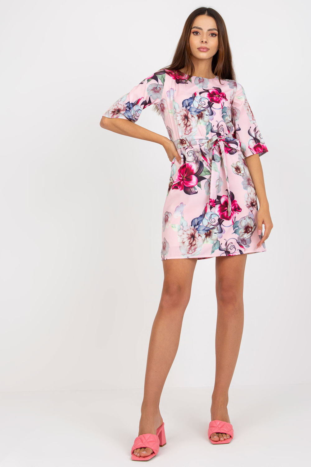 Šviesiai rožinė trumpa kokteilinė suknelė su diržu . aksesuarai: medžiaginė juostelė, pamušalas, nugaroje įsiūtas užtrauktukas medžiagasudėtis: 75% poliesteris, 15% viskozė, 10% elastanas skalbimo būdas: skalbimas mašinoje 30°C Gaminio kodas: LK-SK-507529.67P dominuojantis raštas: flo