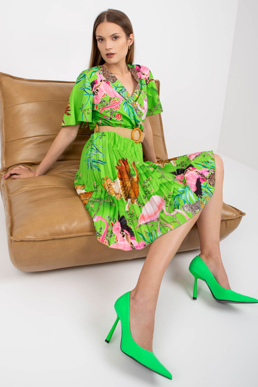Šviesiai žalia suknelė su raštais ir pintu diržu .