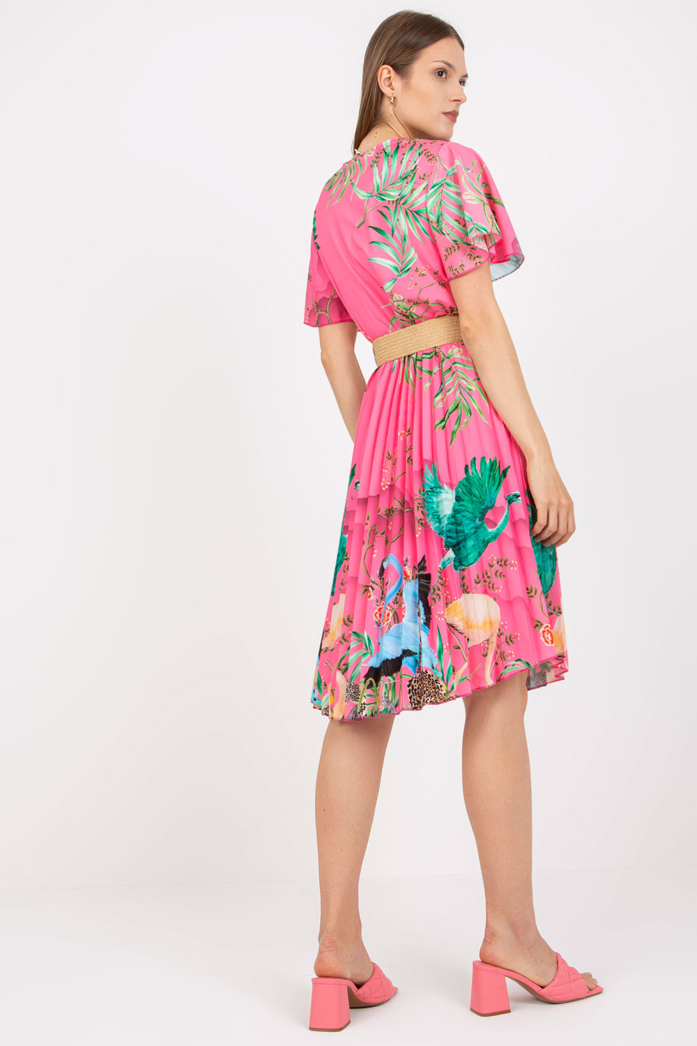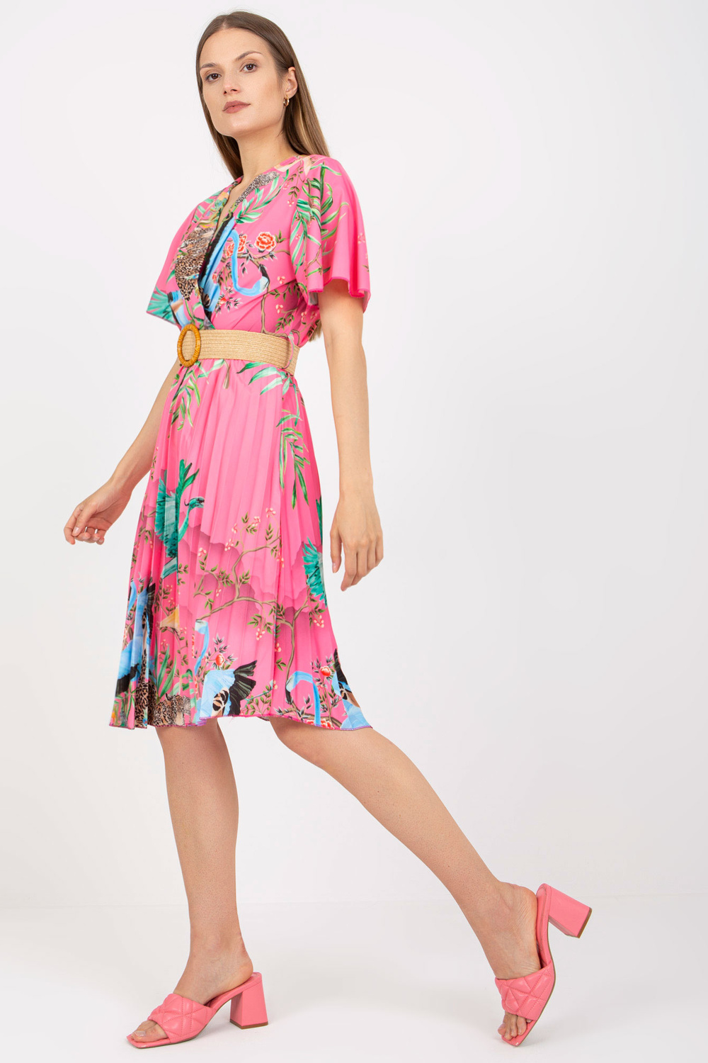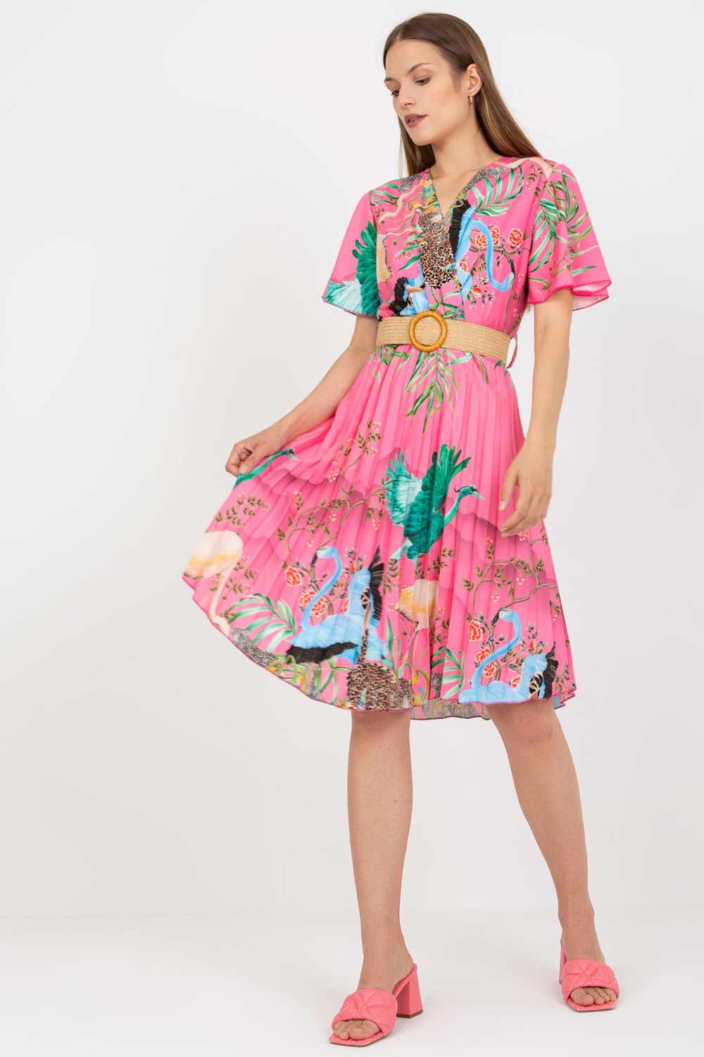 Rožinė vasaros suknelė su raštais ir klostėmis . aksesuarai: pinto diržo medžiagasudėtis: 50% poliesteris, 45% viskozė, 5% elastanas skalbimo būdas: skalbimas skalbimo mašinoje 30°C Gaminio kodas: DHJ-SK-15817.32 dominuojantis raštas: spauda Stilius: laisvalaikis: kasdienis, f