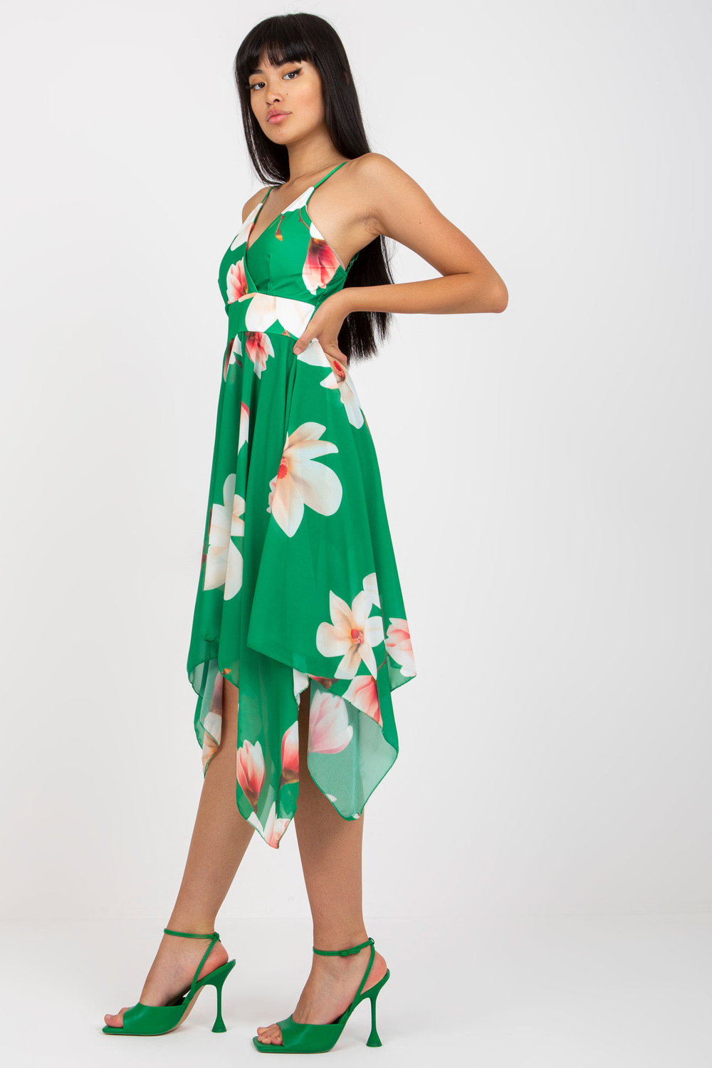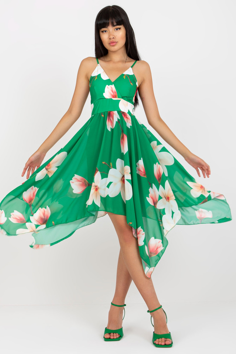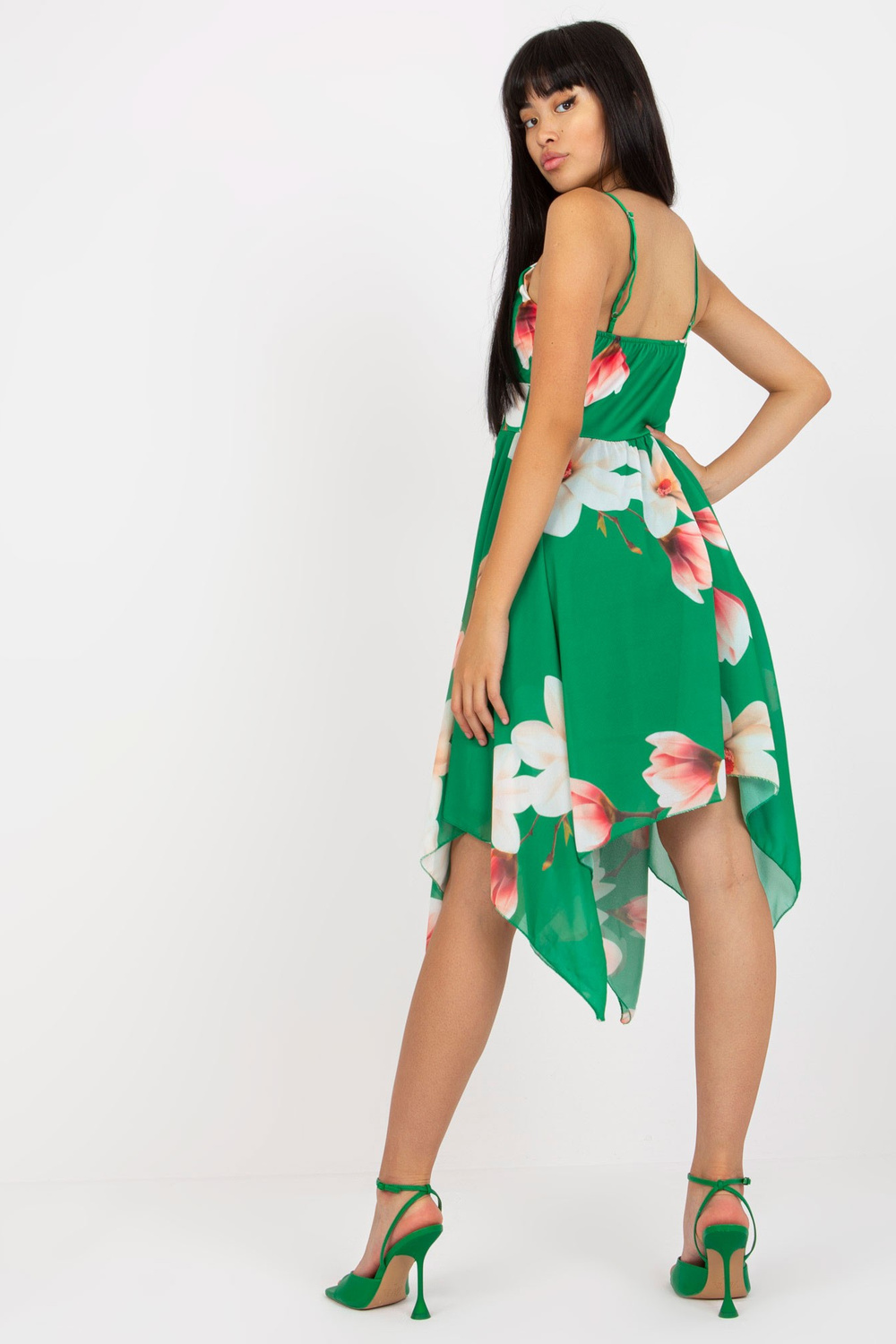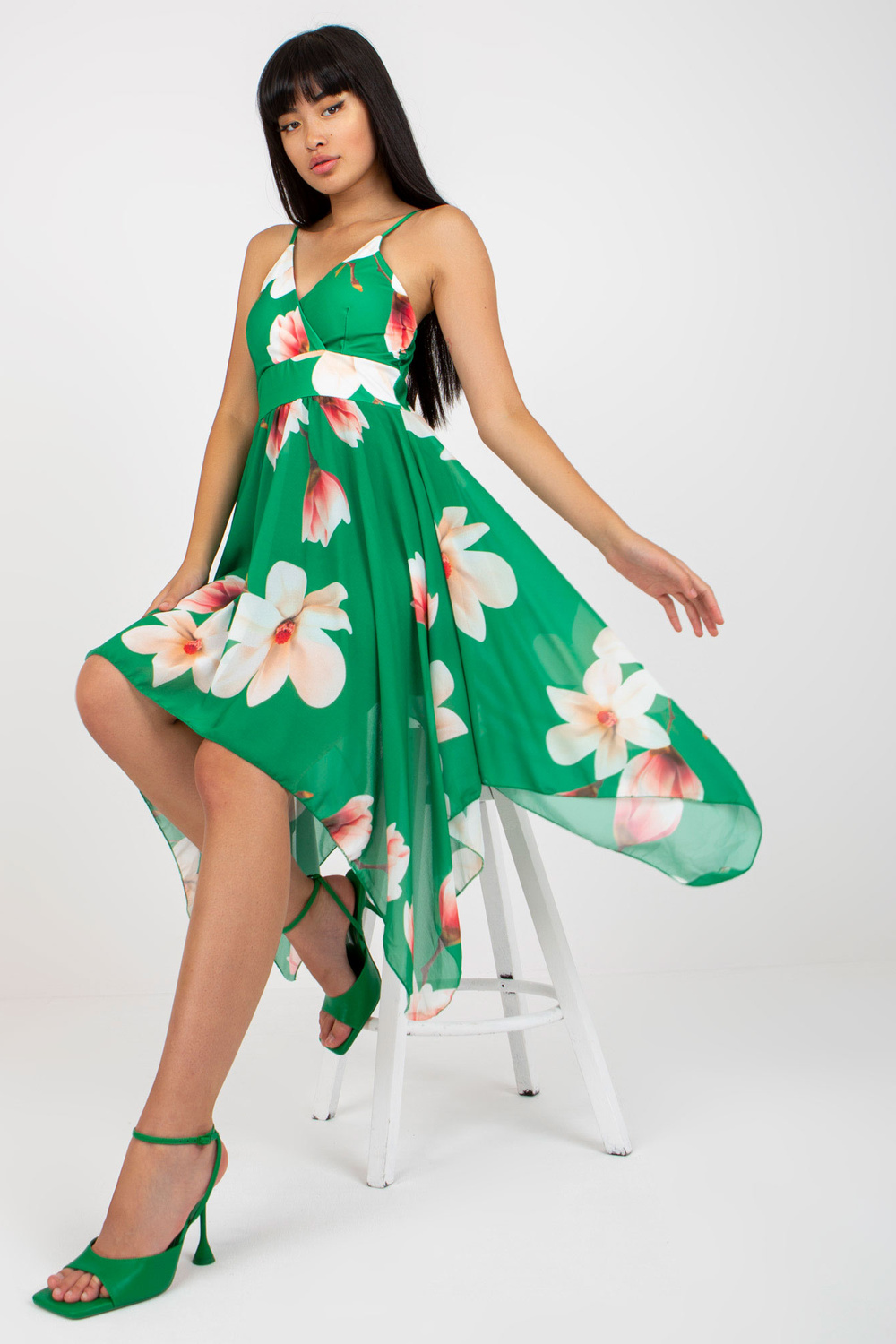 Žalia simetriška suknelė su petnešėlėmis su raštu .