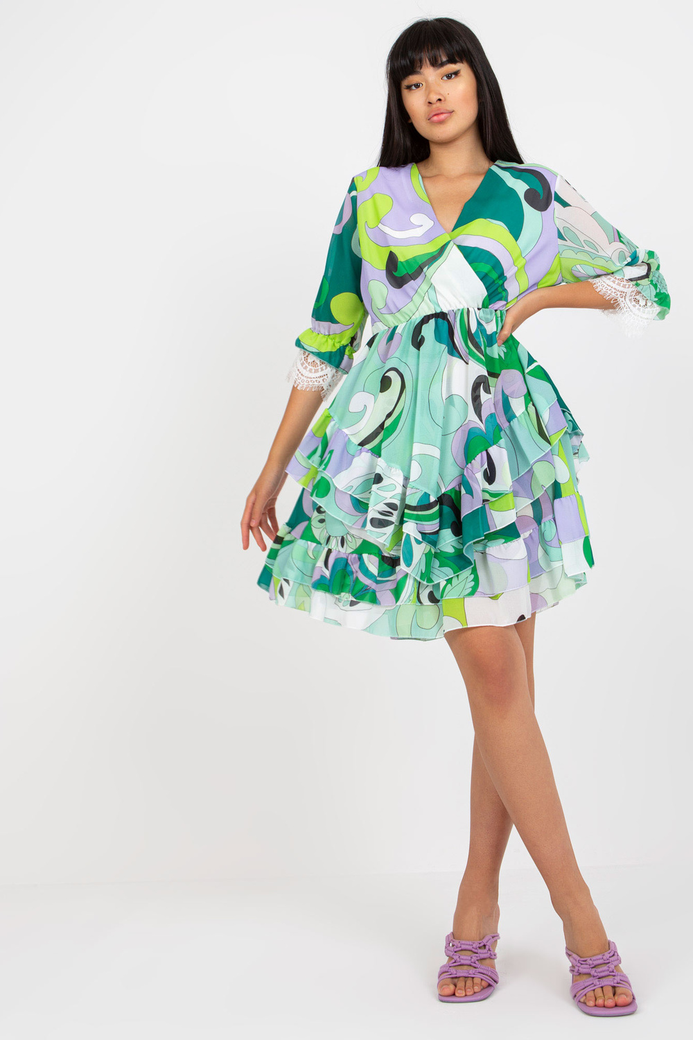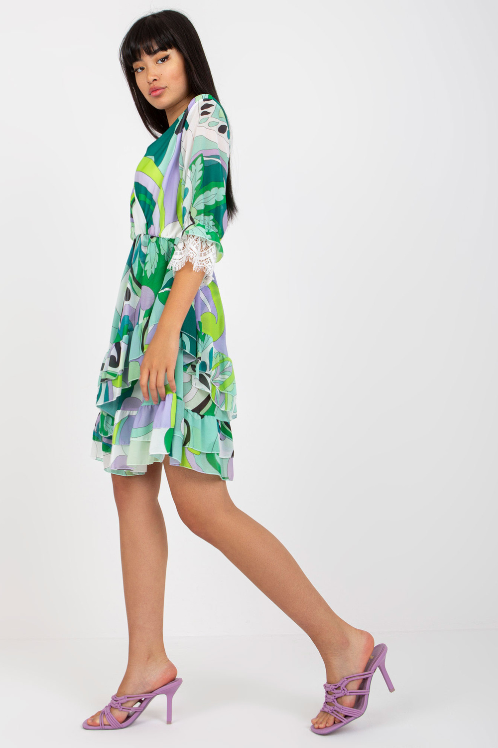 Žalia ir violetinė vokinė suknelė su raukiniais ir 3/4 rankovėmis font> .