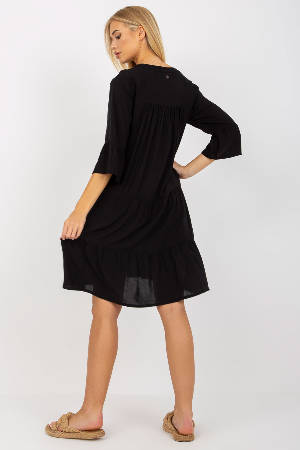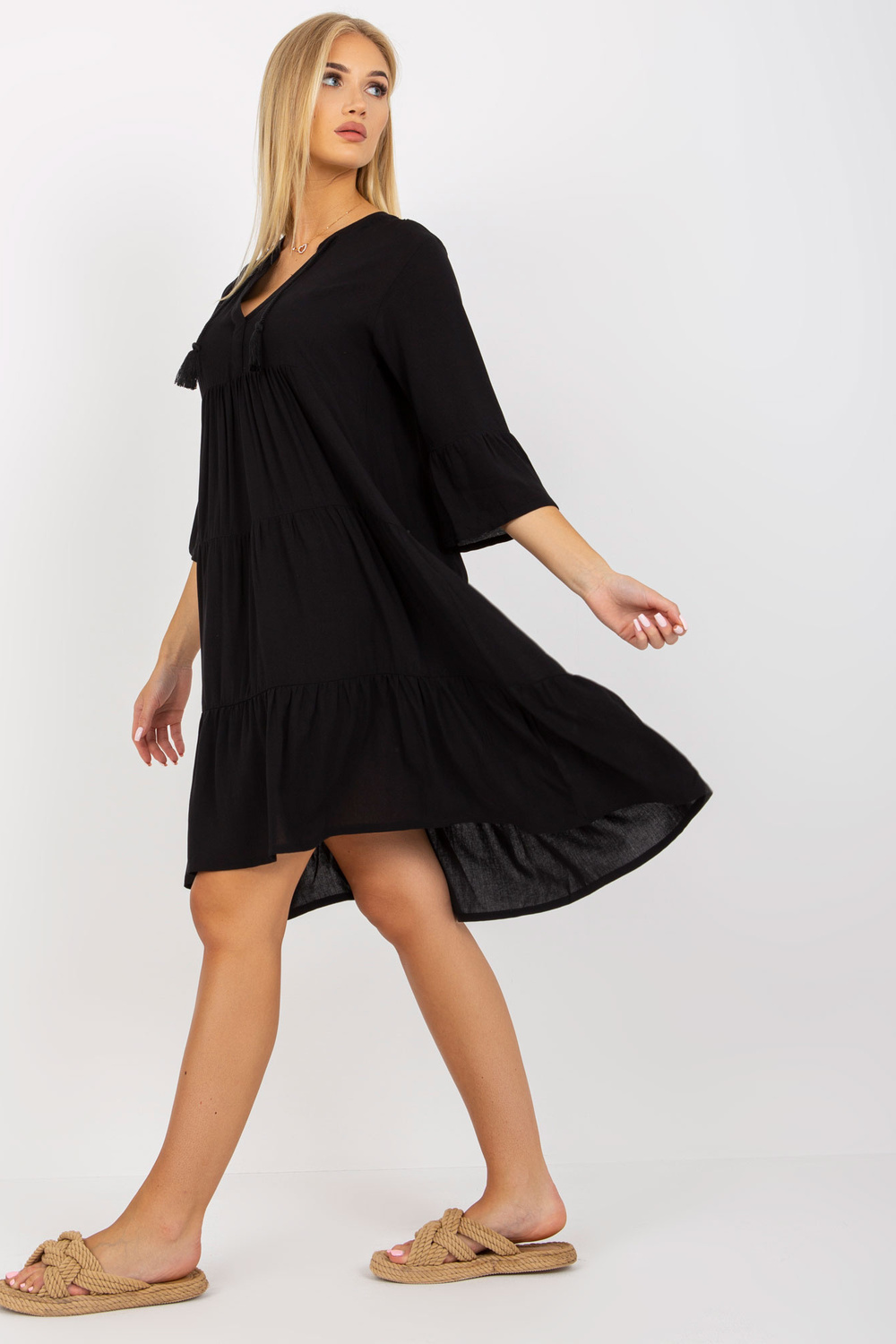 Juoda viskozės boho suknelė su raukiniais ir V formos iškirpte .