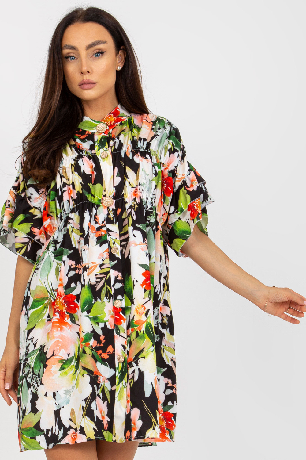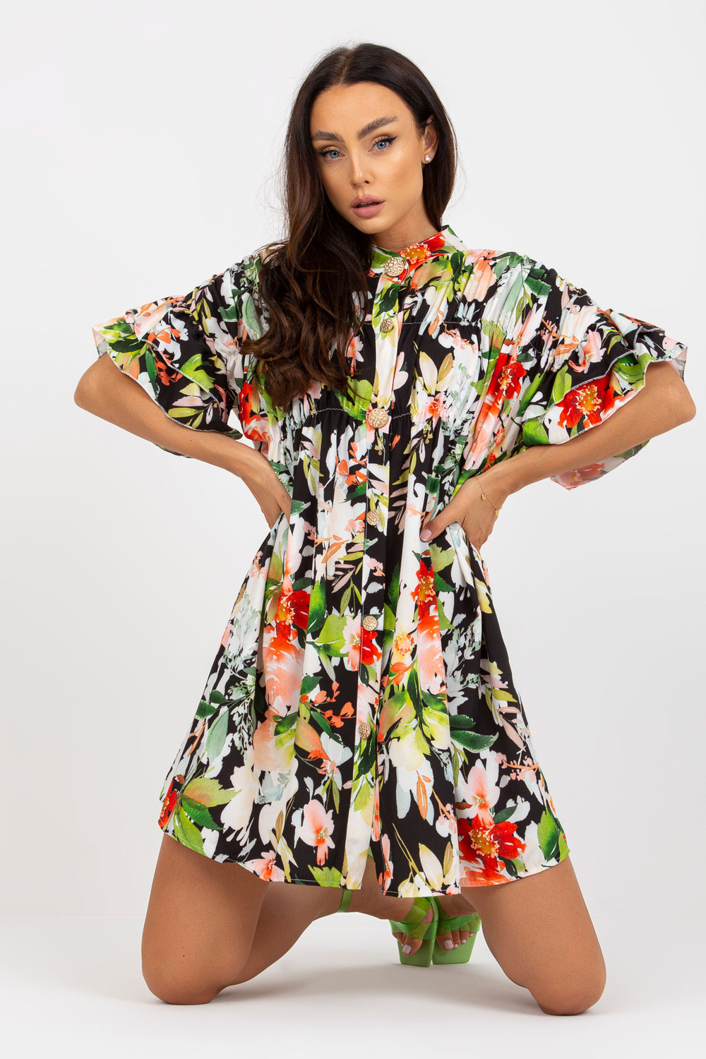Juoda gėlėta suknelė su raukiniais .