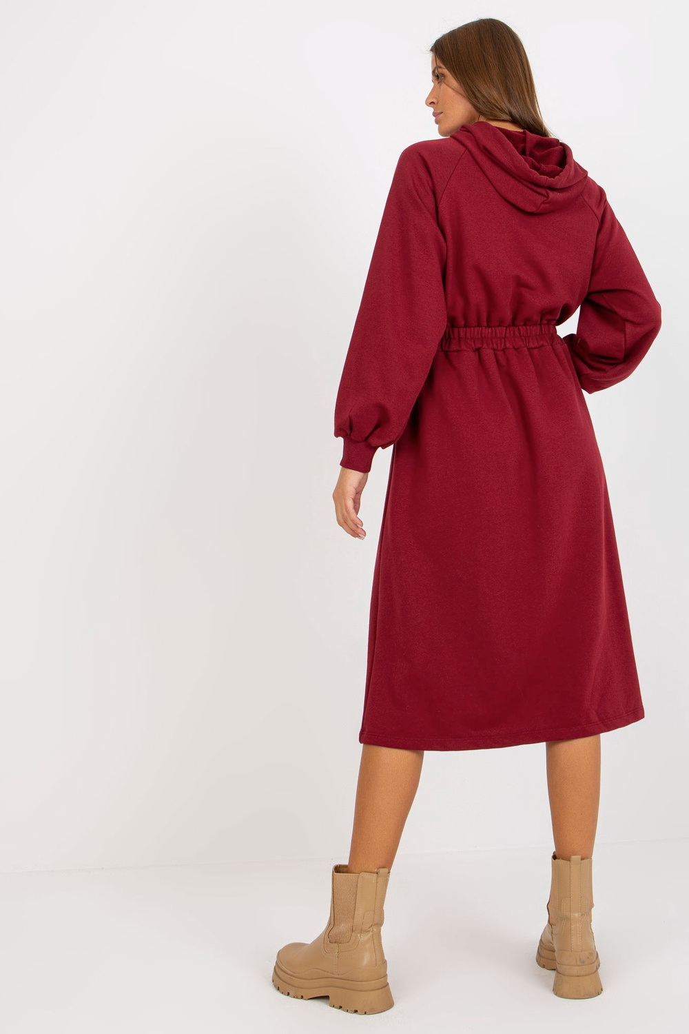 Burgunderfarbenes ausgestelltes Sweatshirtkleid mit Kapuze.