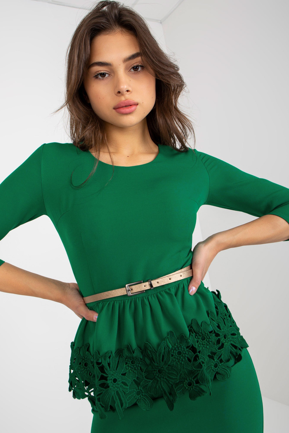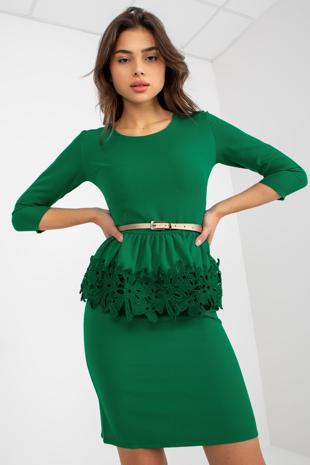 Žalia prigludusi kokteilinė suknelė su basku ir diržu.