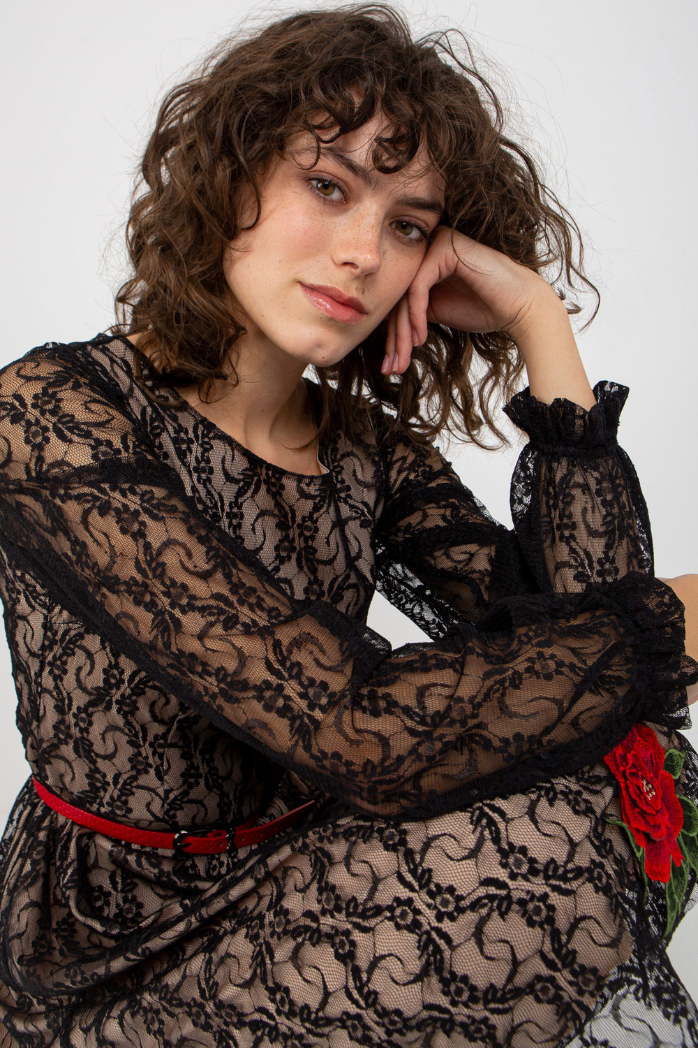 Juoda nėriniuota kokteilinė suknelė su dryžiais.