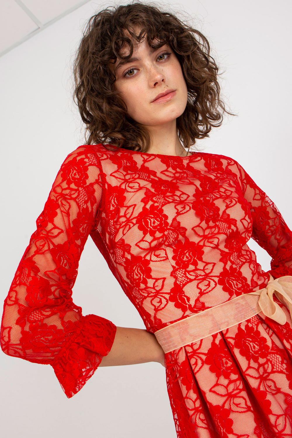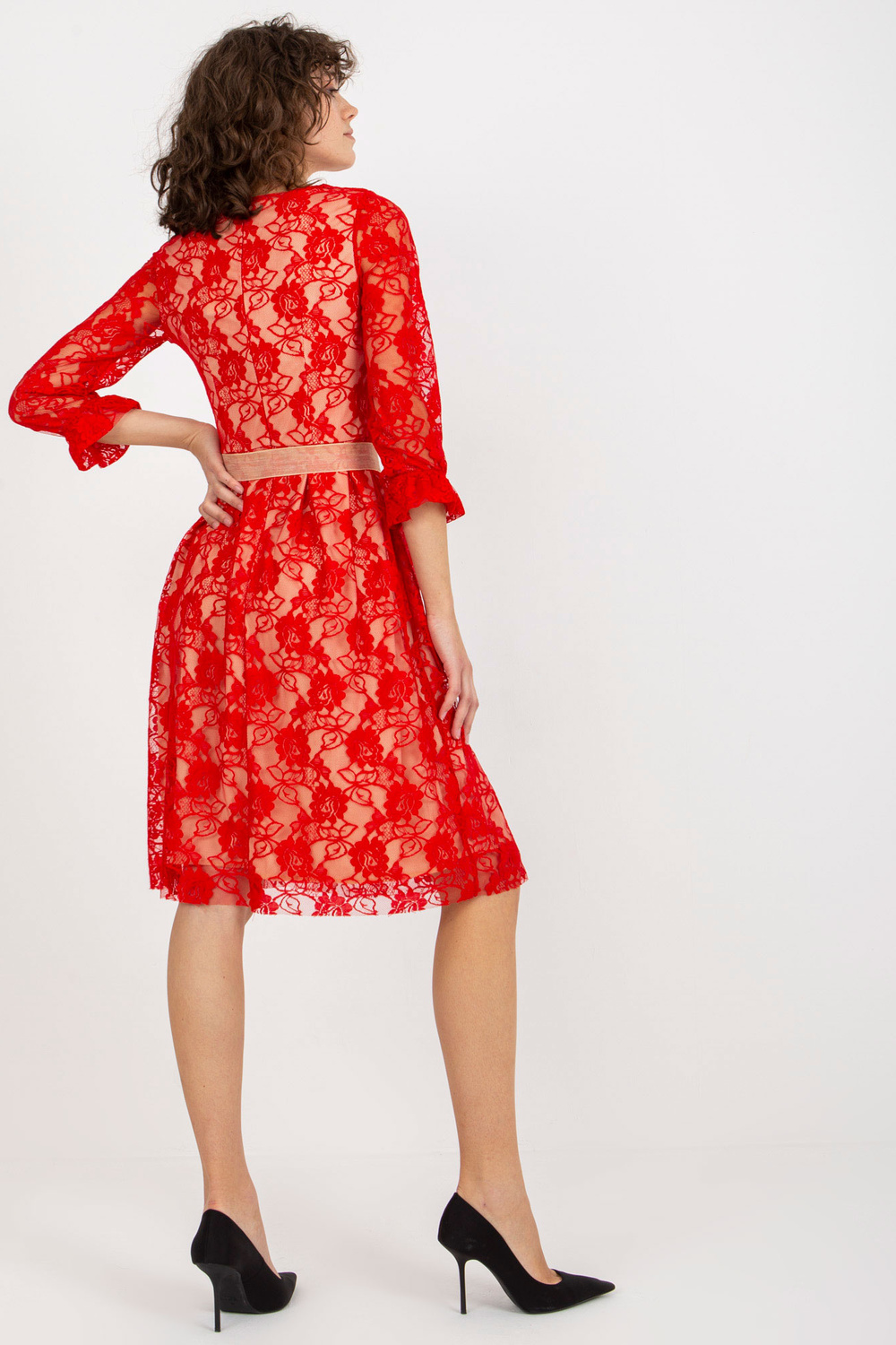 Raudona nėrinių kokteilinė suknelė su midi ilgiu. Prekės kodas: LK-SK-507034.40P Dominuojantis raštas: įvairi medžiagos tekstūra Stilius: Elegantiška proga: vakarui, vakarėliui, pasimatymui, vestuvėms Modelis dėvi 38 dydį. Režimo išmatavimai