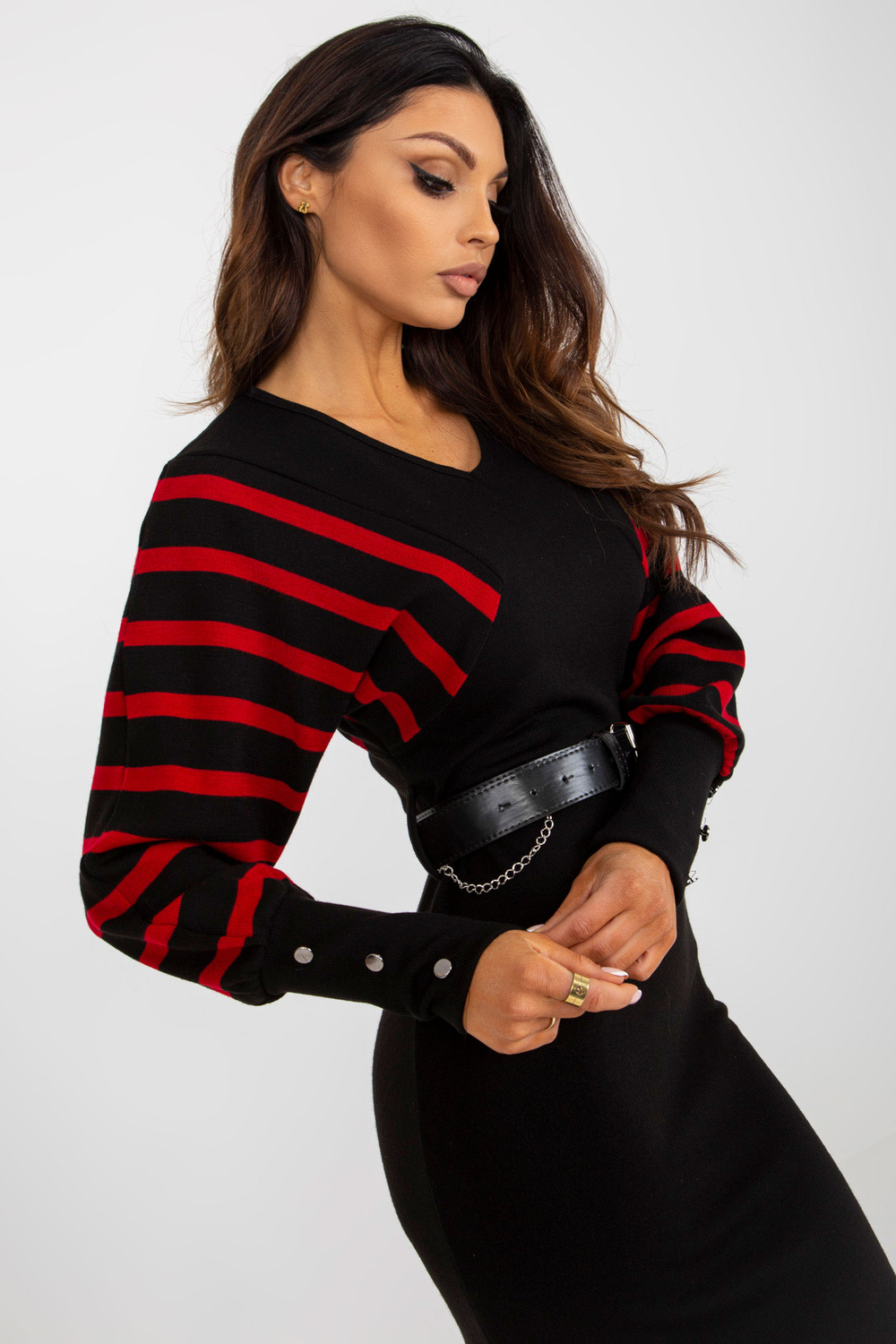 Juoda ir raudona midi megzta suknelė su diržu OCH BELLA.