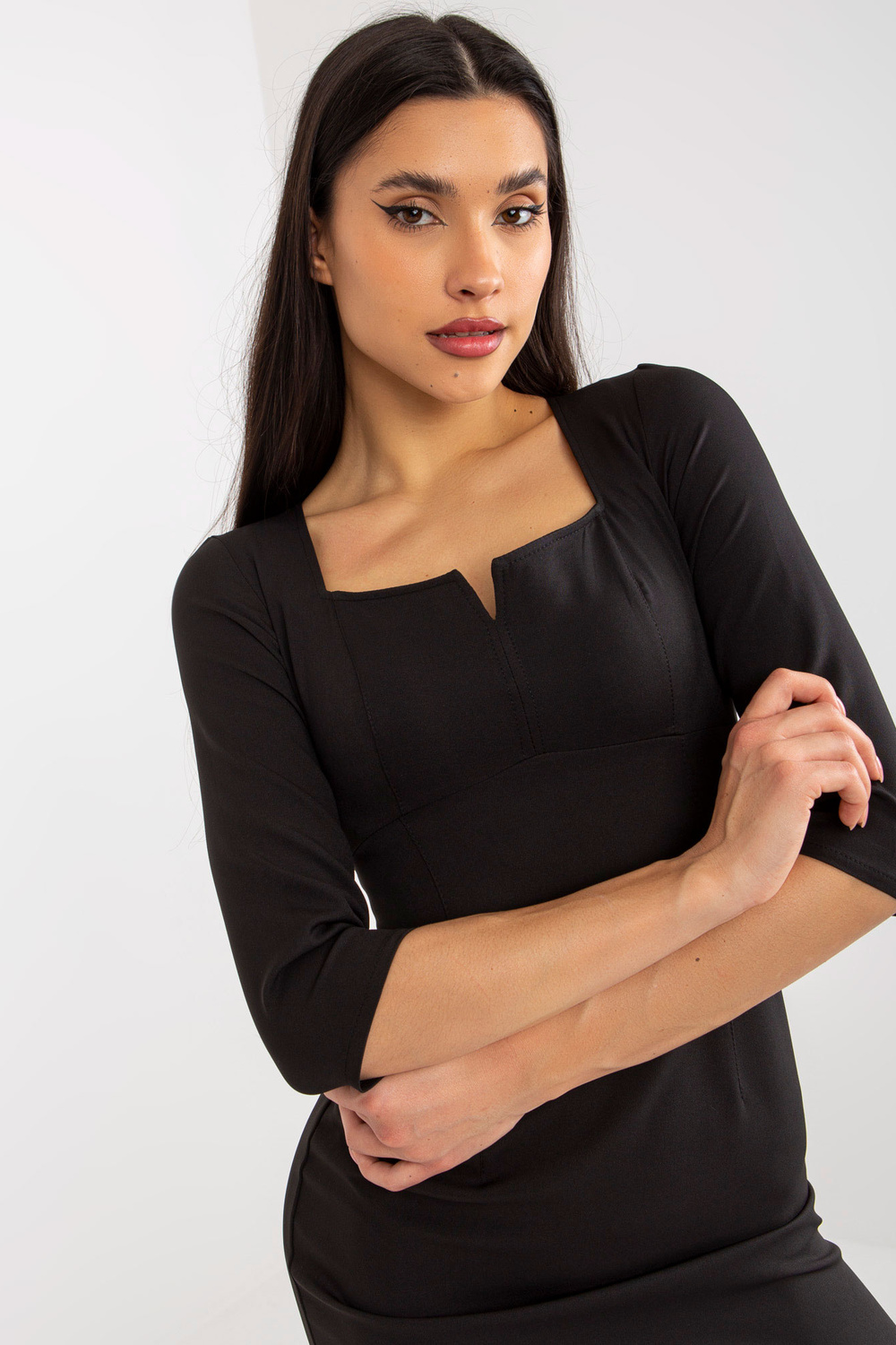 Juoda pieštuko kokteilinė suknelė su mini ilgiu.