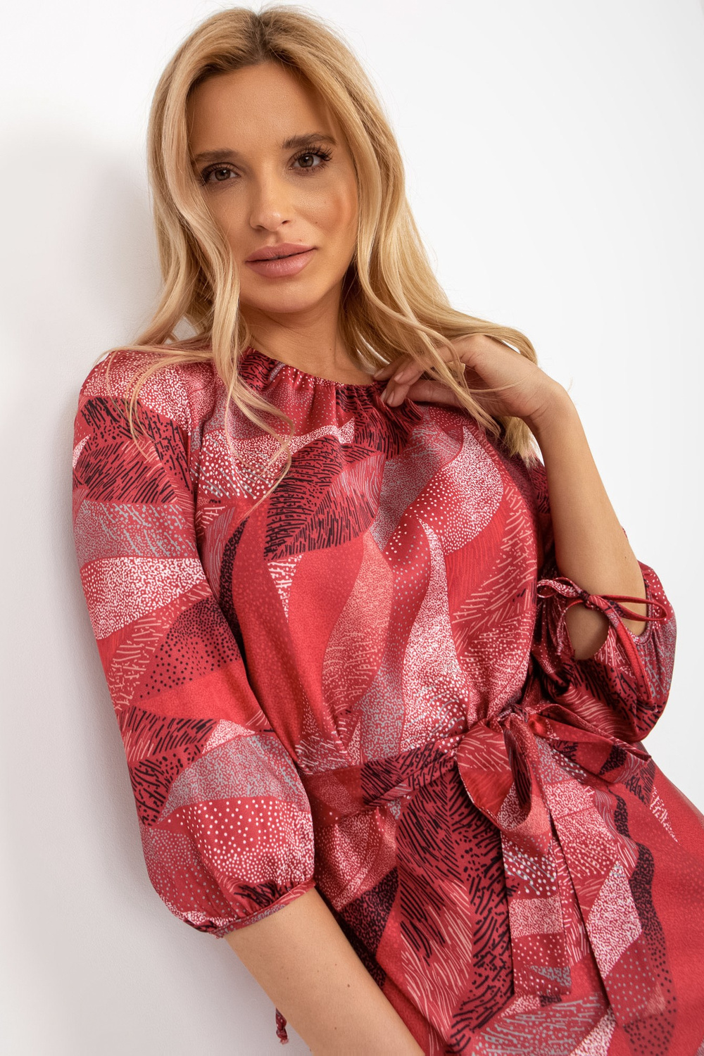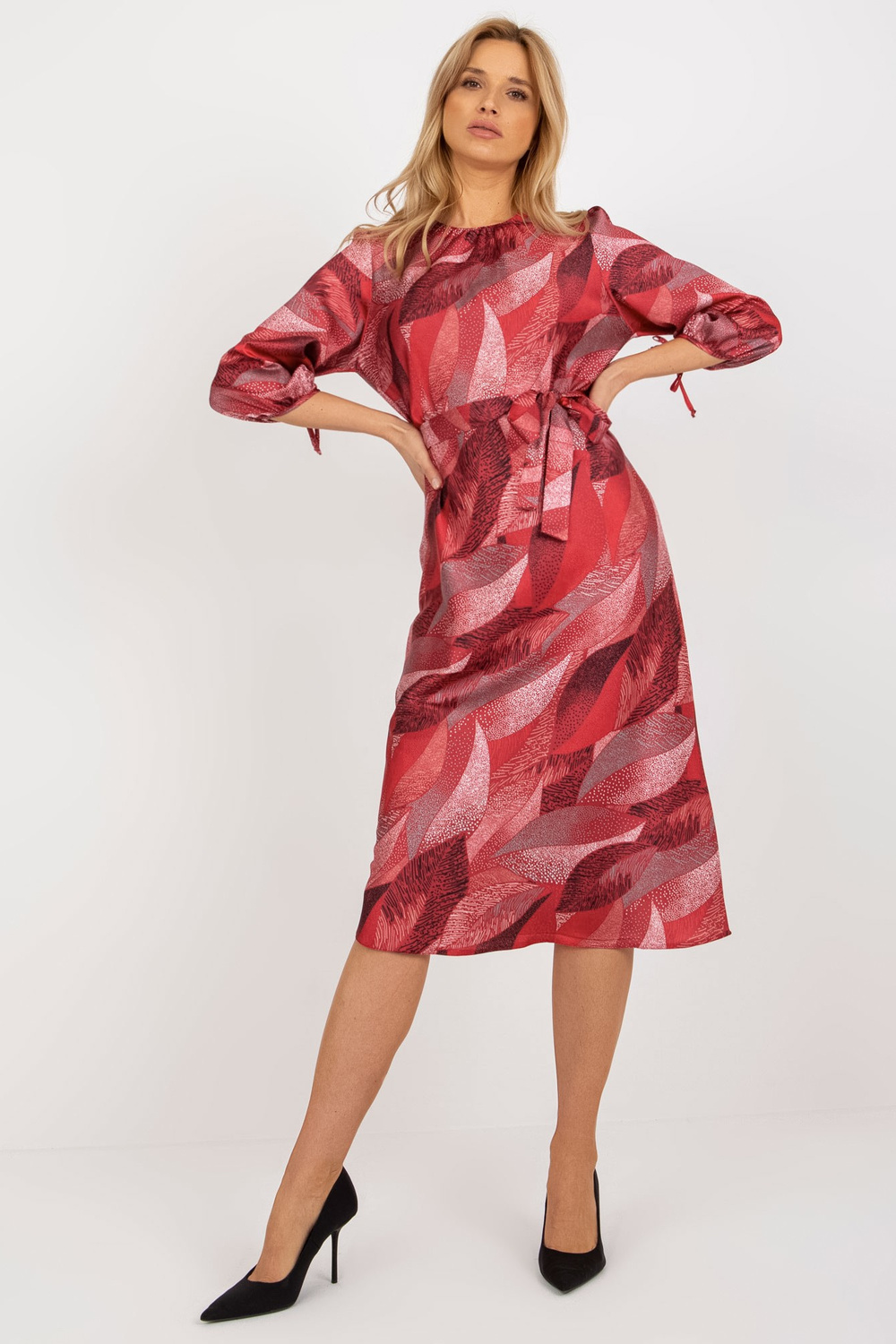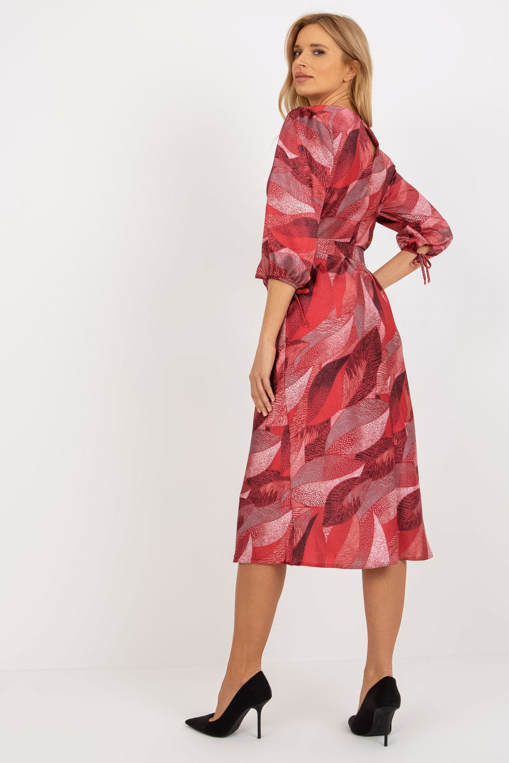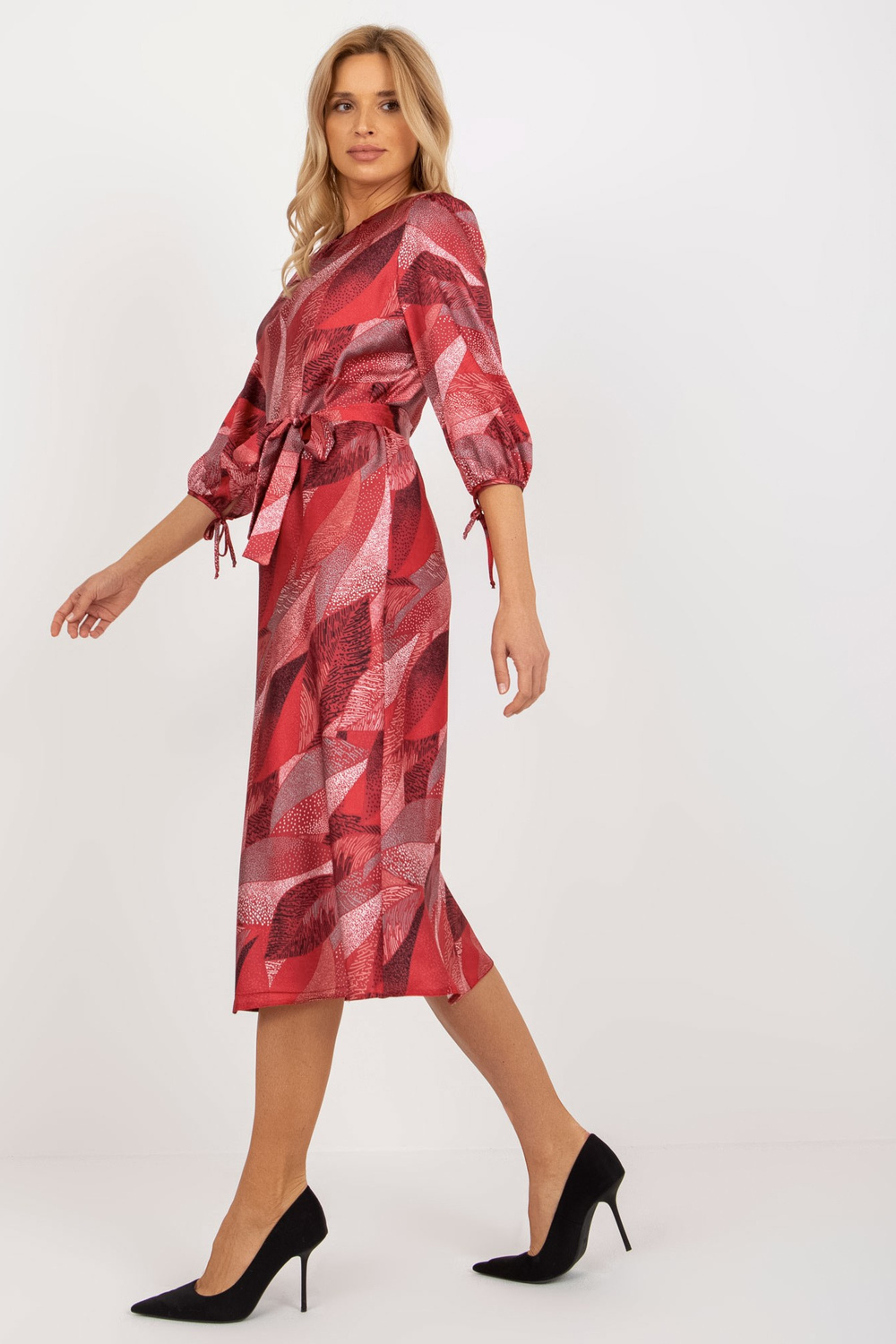 Burgundijos spalvos midi kokteilinė suknelė su raštais ir įrišimu.