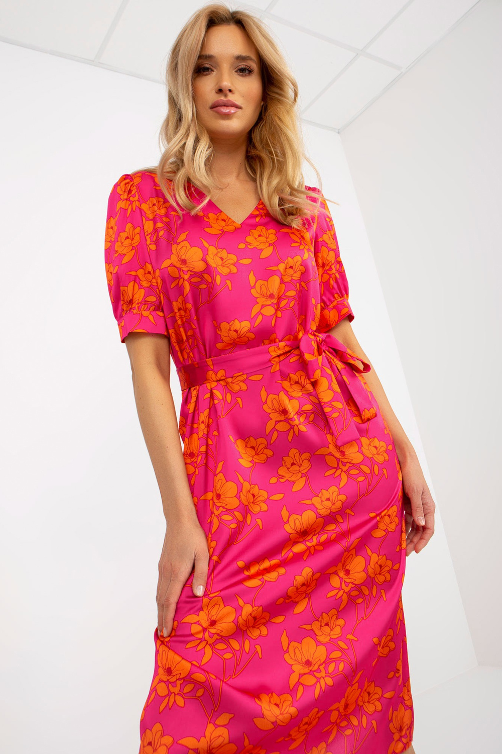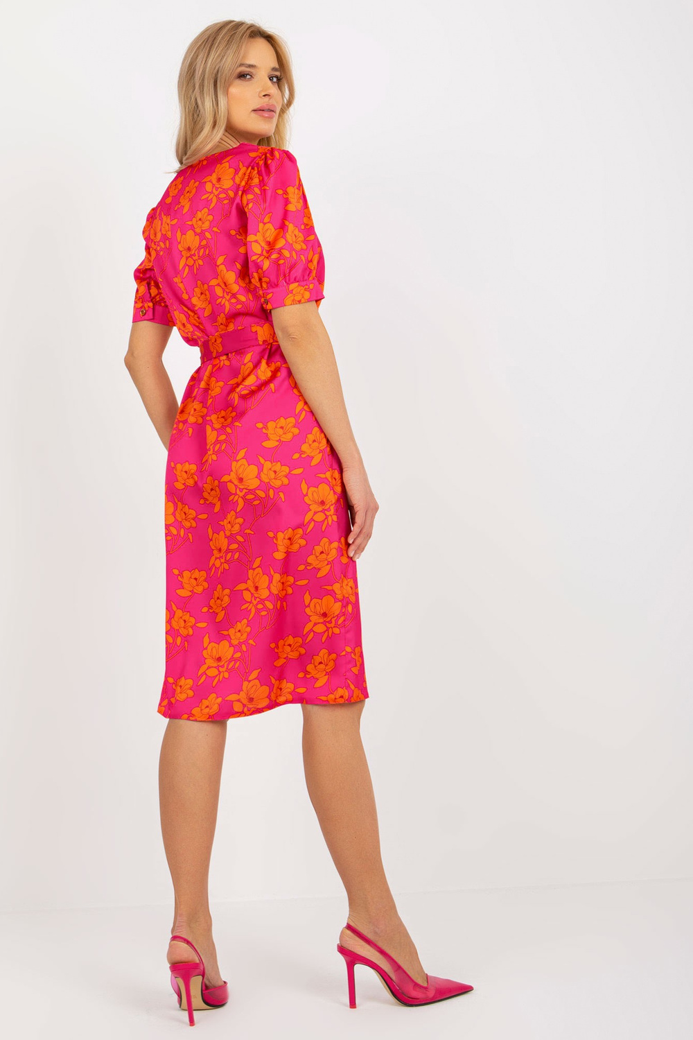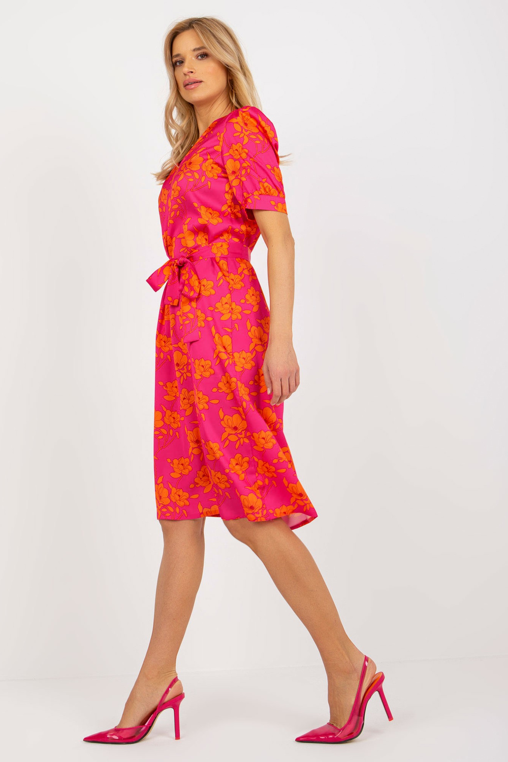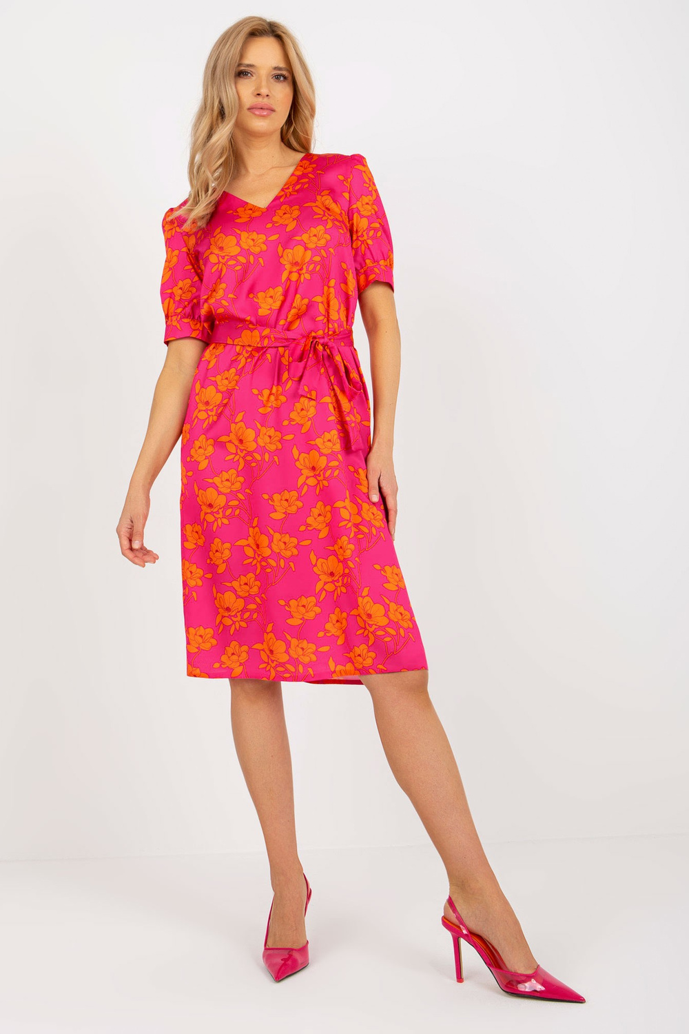 Fuksijos spalvos oranžinė kokteilinė suknelė su V iškirpte