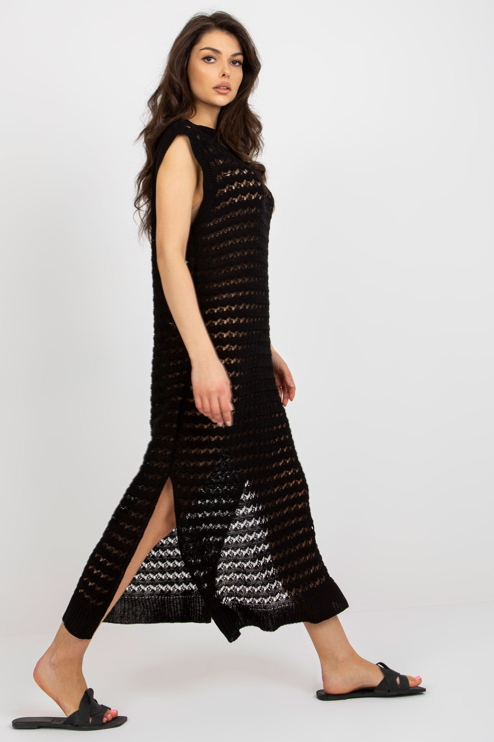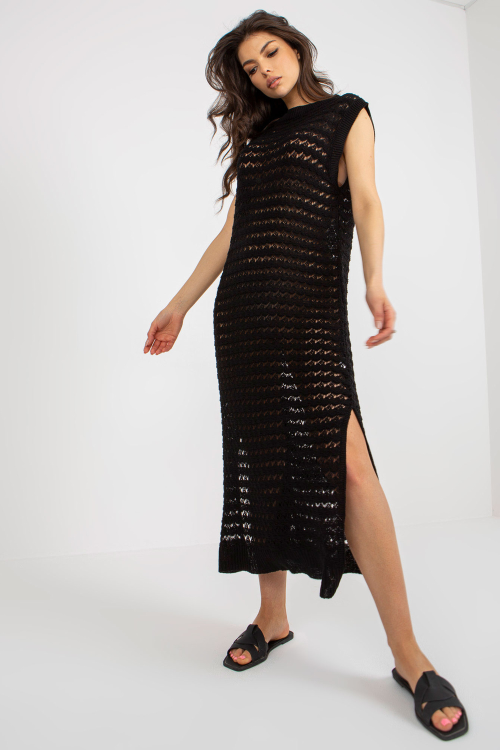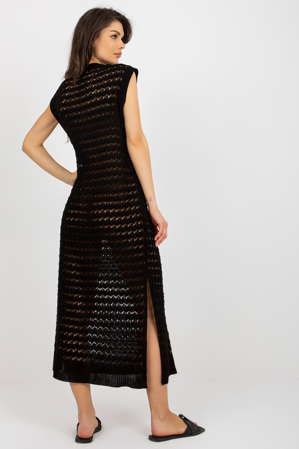 Juoda paplūdimio megzta suknelė su skeltukais.