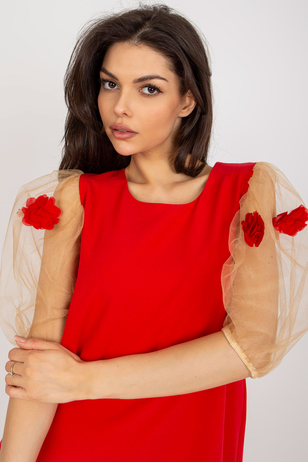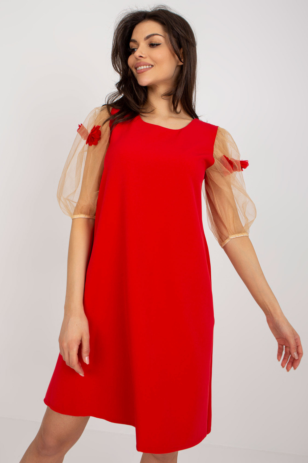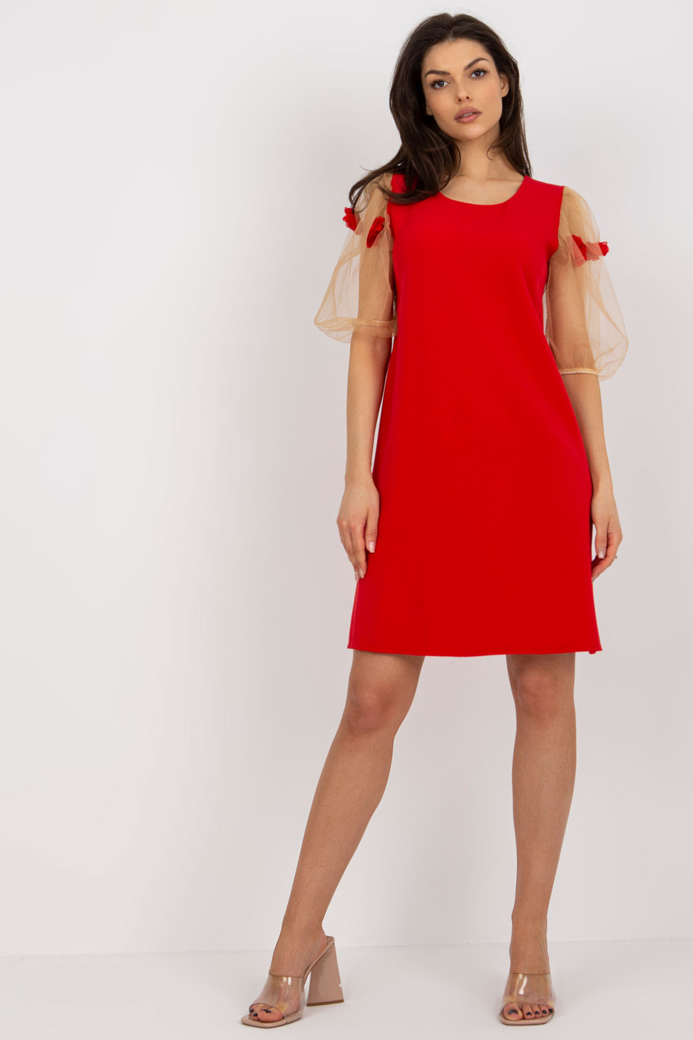 Raudono kupranugario kokteilinė suknelė pūstomis rankovėmis.