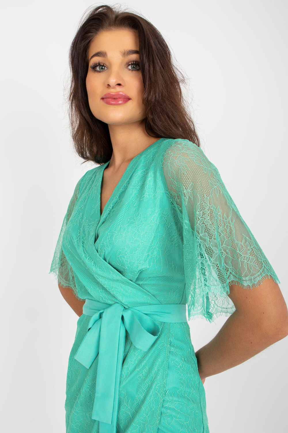 Turkio spalvos nėrinių kokteilinė suknelė su diržu.