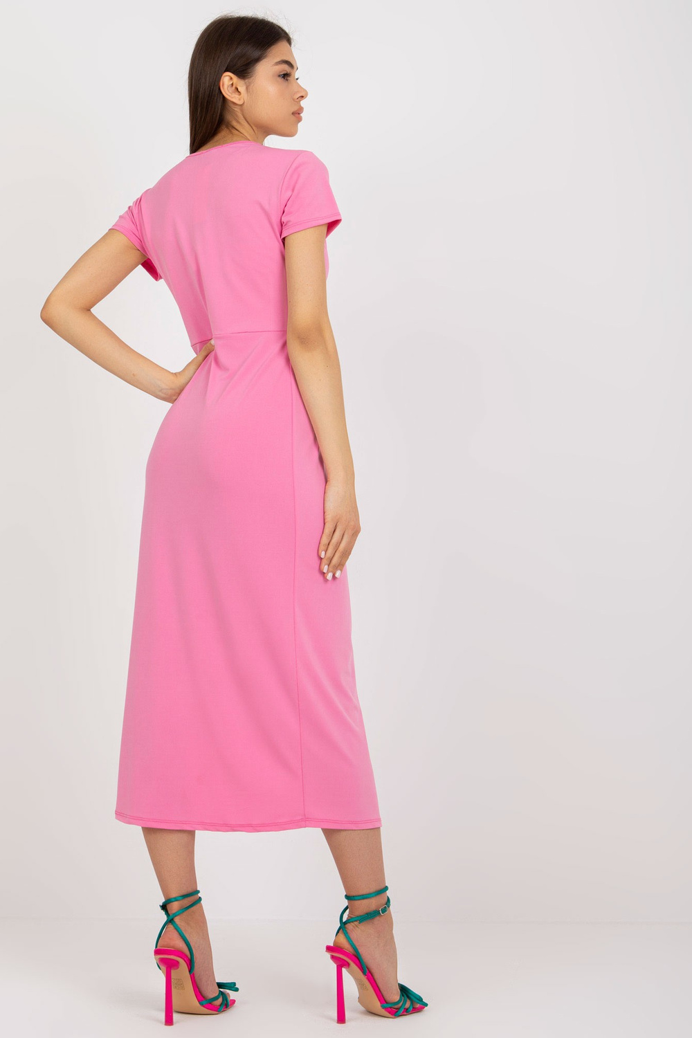 Rožinė moteriška kokteilinė suknelė su mazgu priekyje.