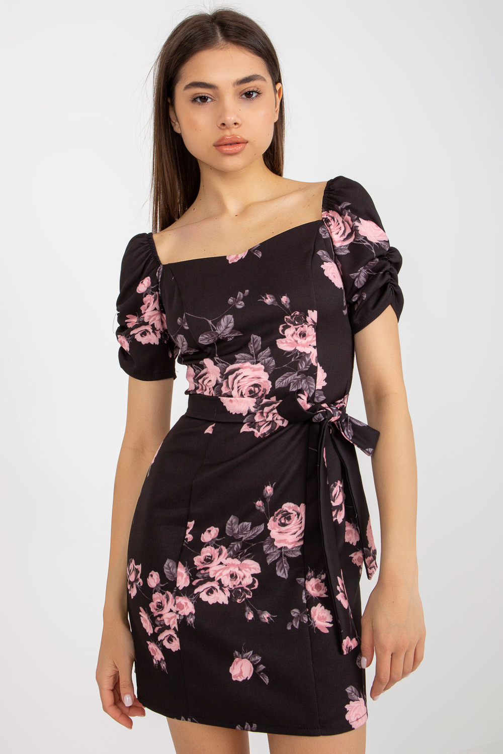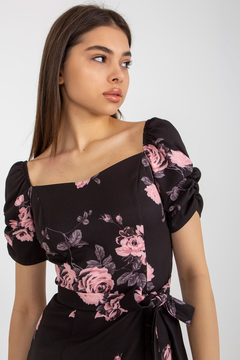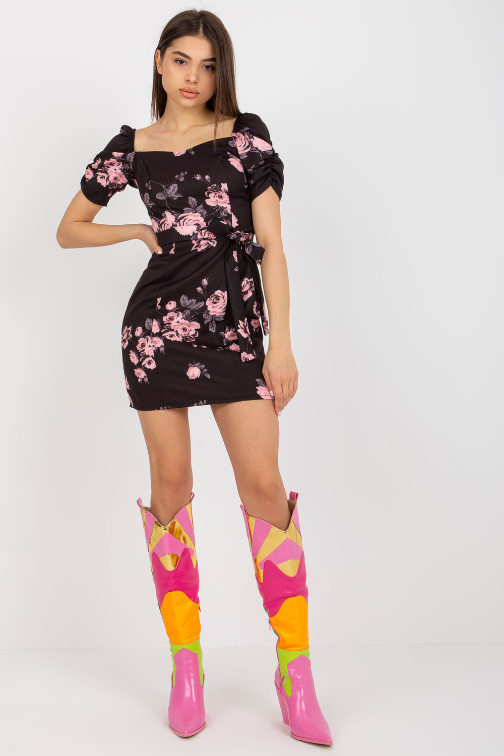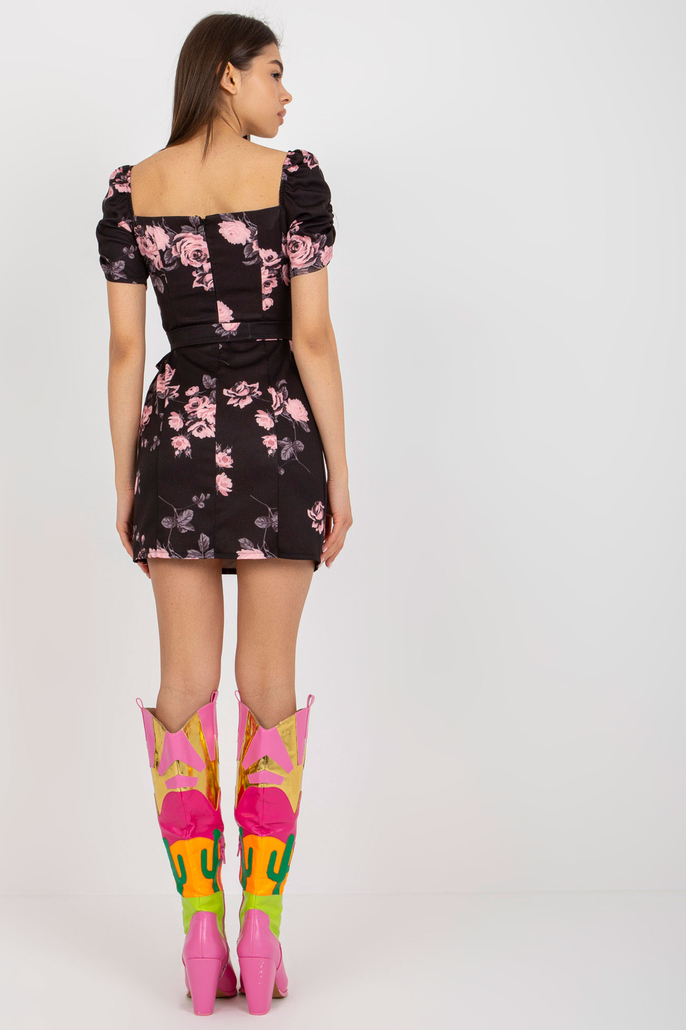 Juodos ir rožinės spalvos kokteilinė suknelė su gėlių pieštuku Ilona.