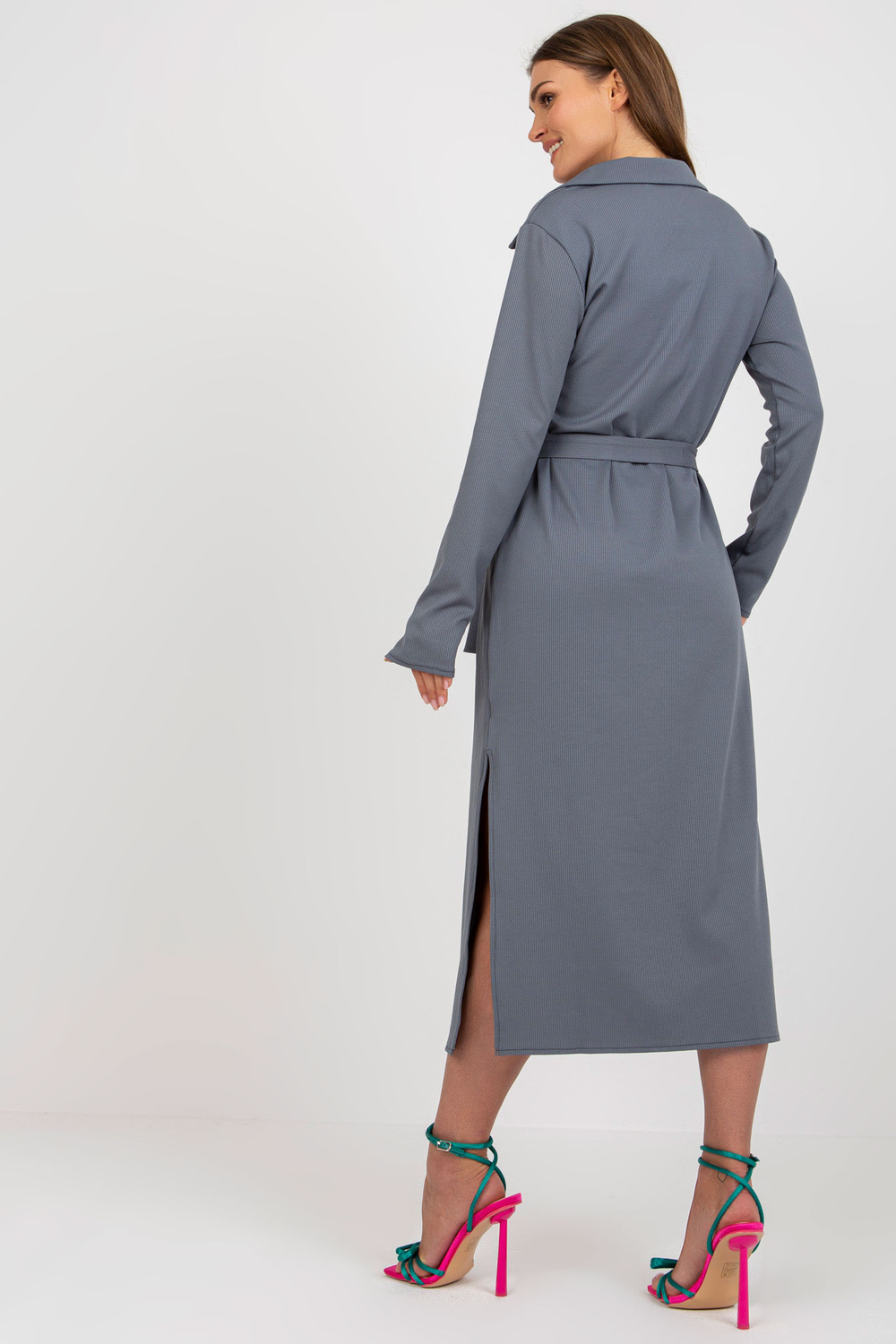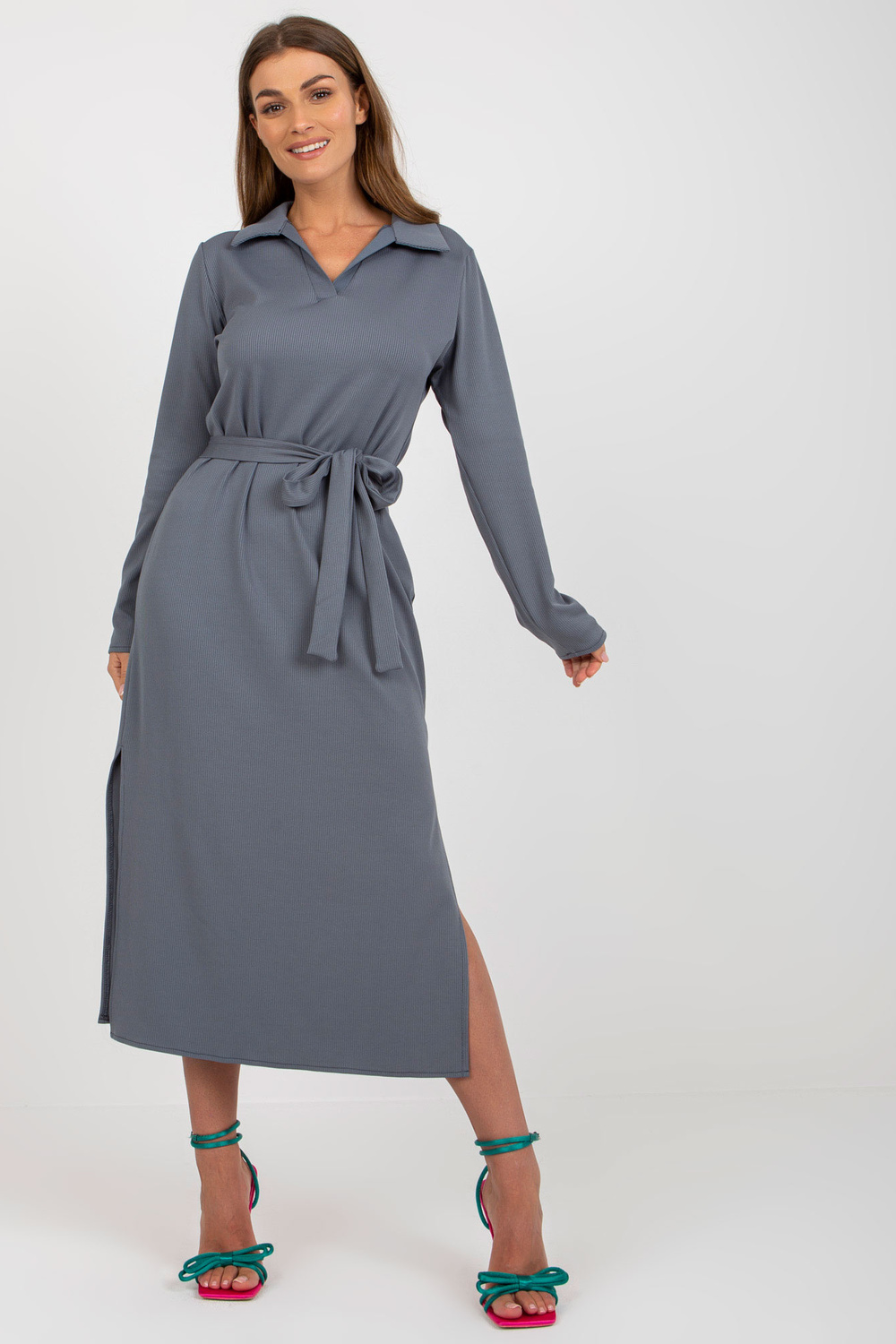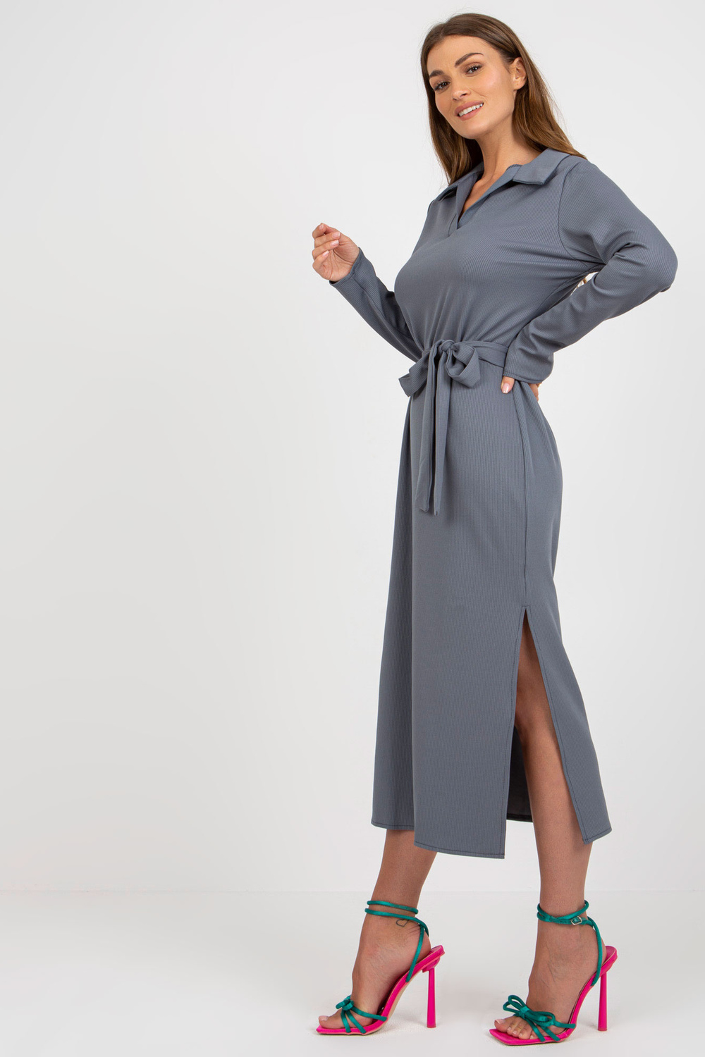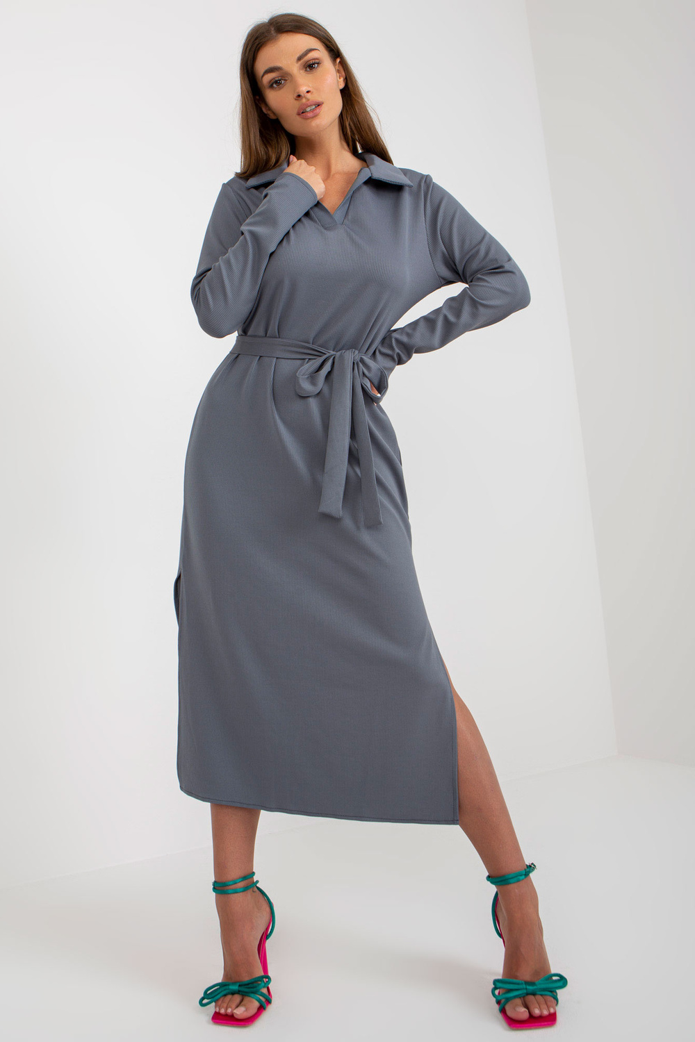 Pilka suknelė su apykakle ir V formos iškirpte.