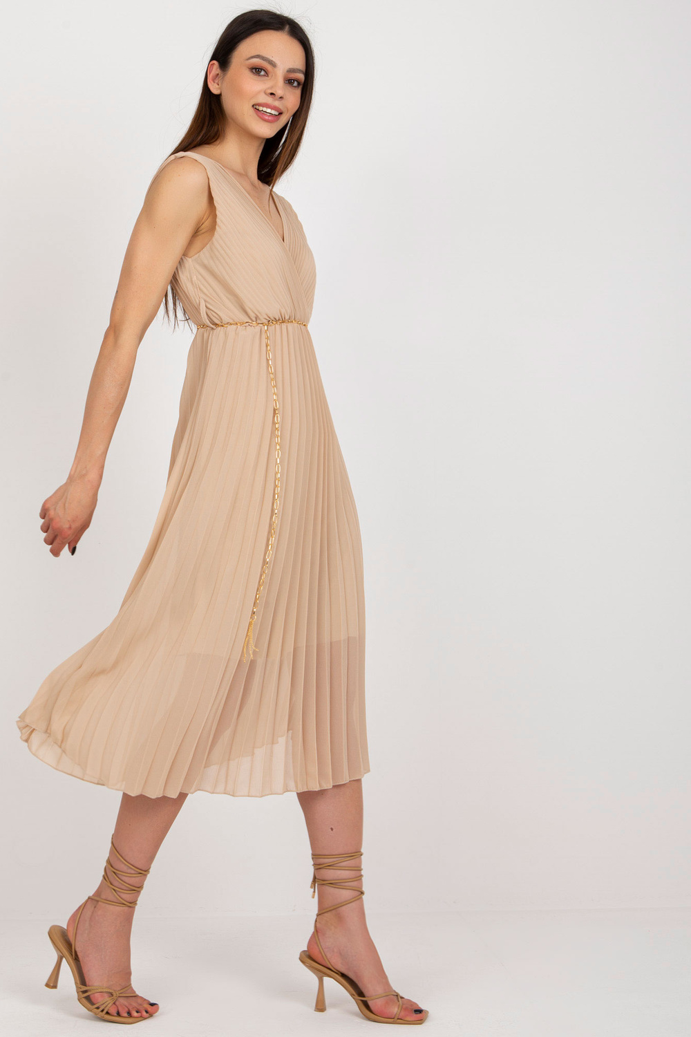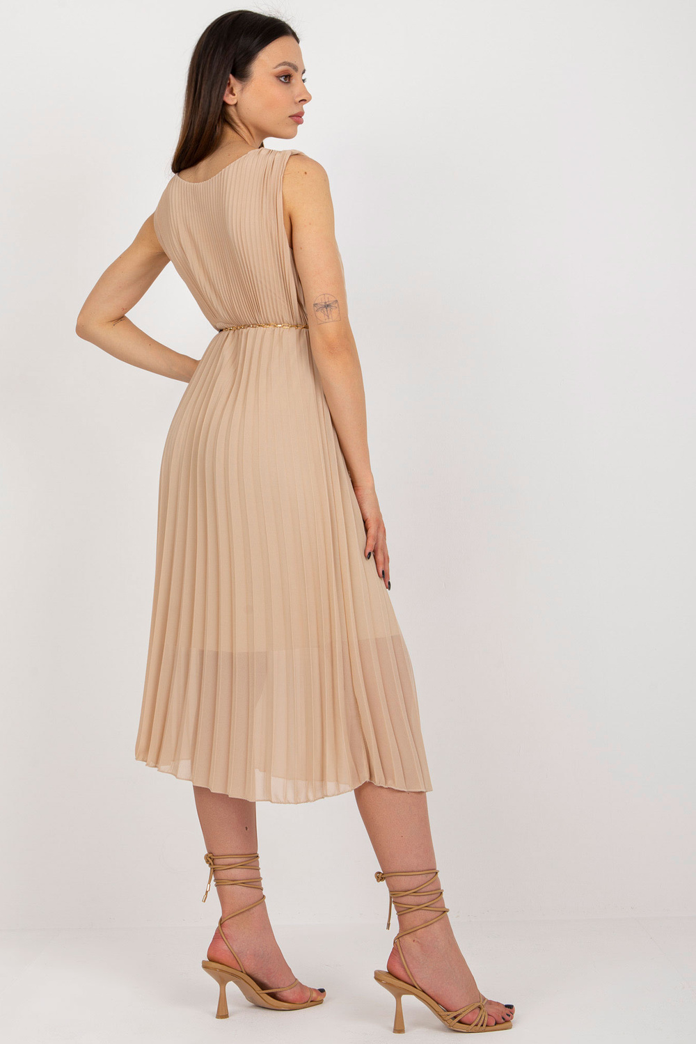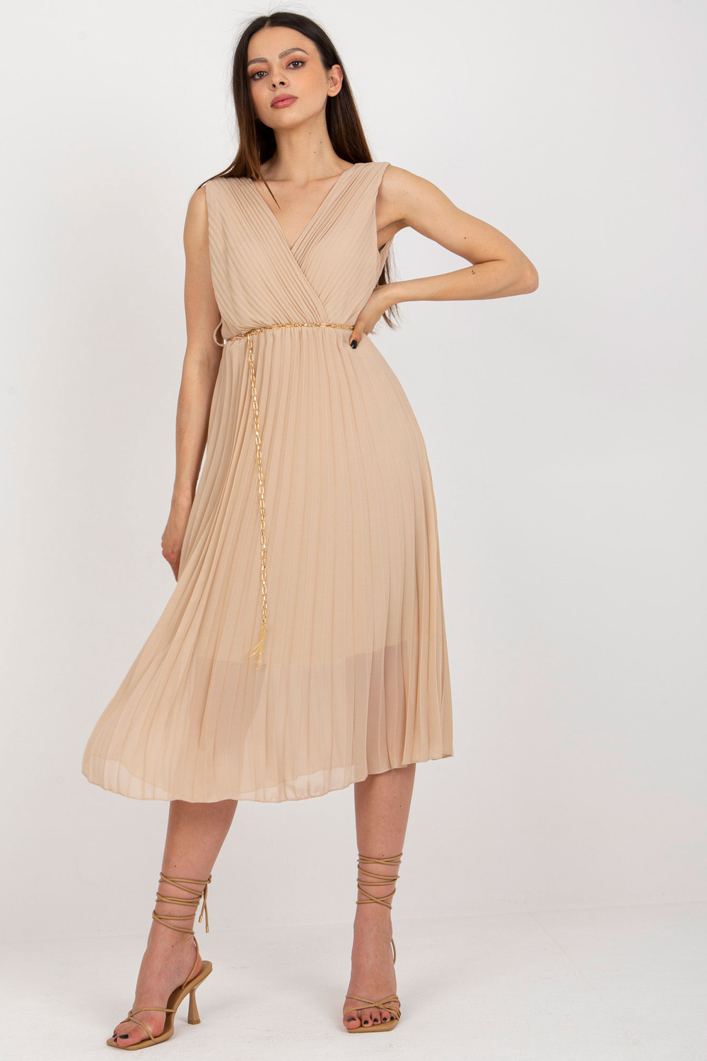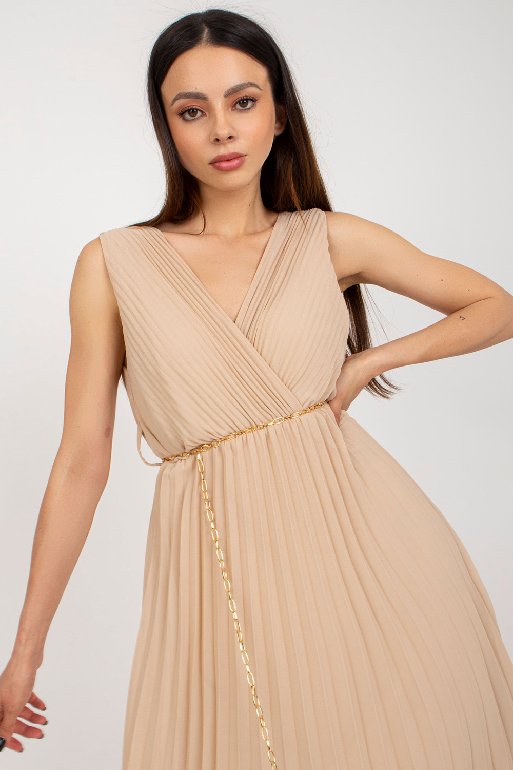 Modelis dėvi vieno dydžio dydį. Modelio išmatavimai: ūgis 175 cm, krūtinė 84 cm, juosmuo 61 cm, klubai 91 cm.
