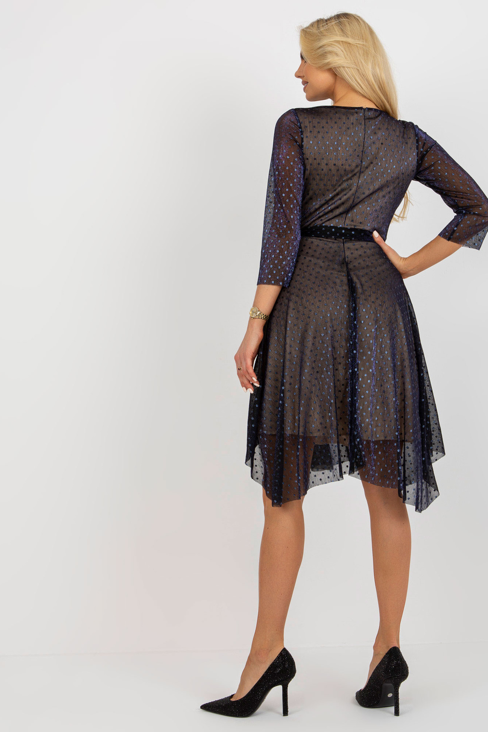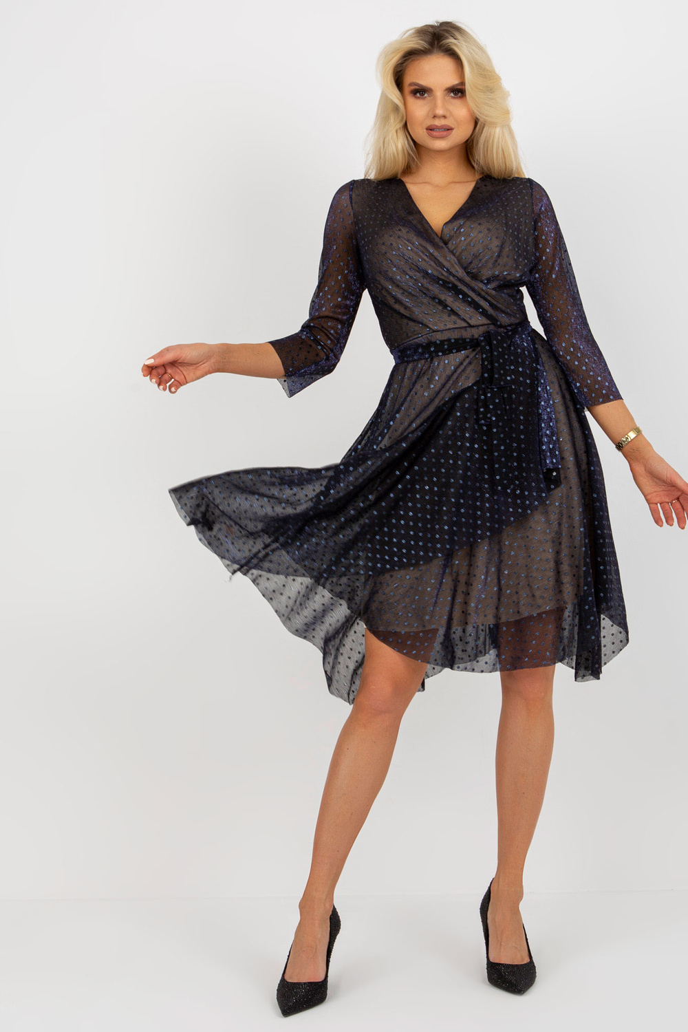 Navy midi kokteilinė suknelė su tviskančiais taškeliais.