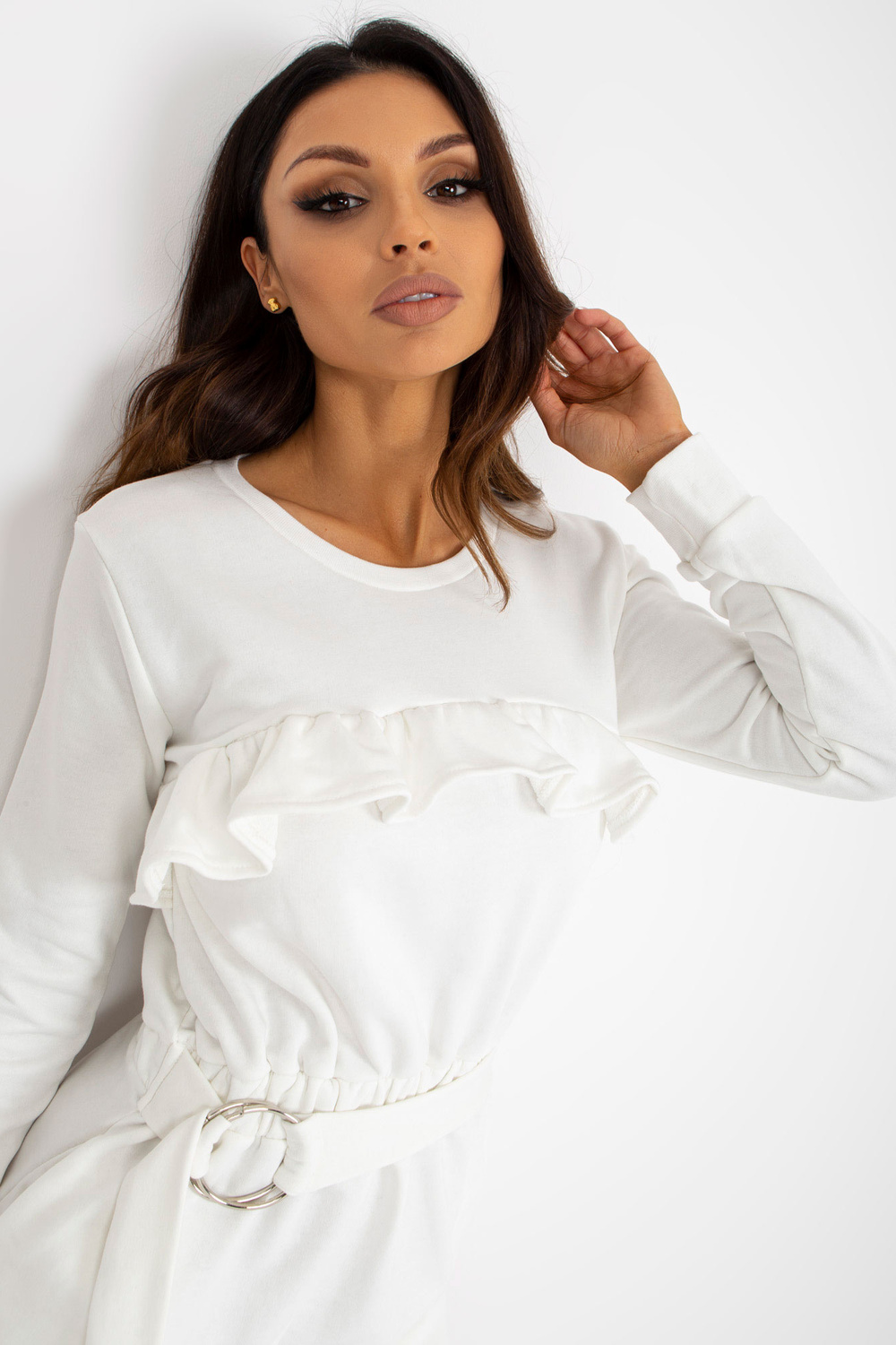 Ecru mini sportinio kostiumo suknelė su raukšlėmis ir diržu.