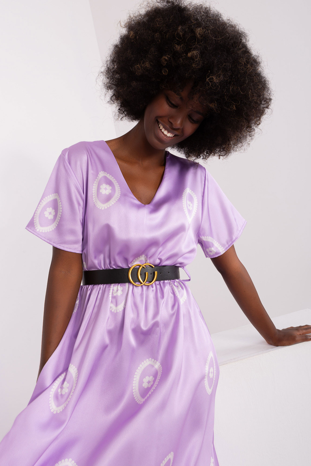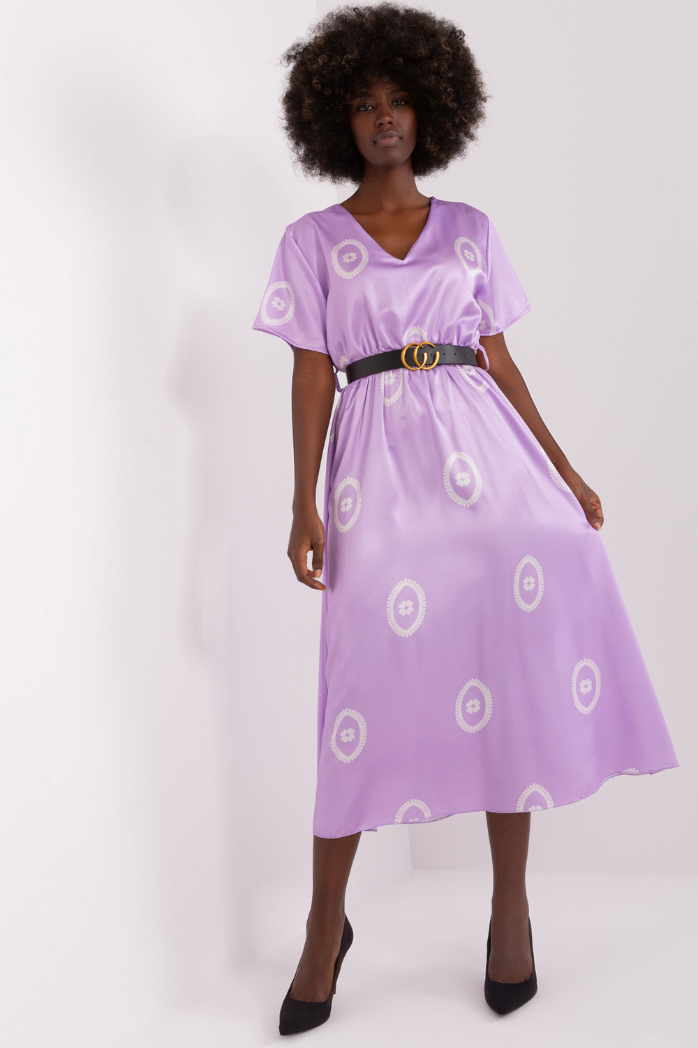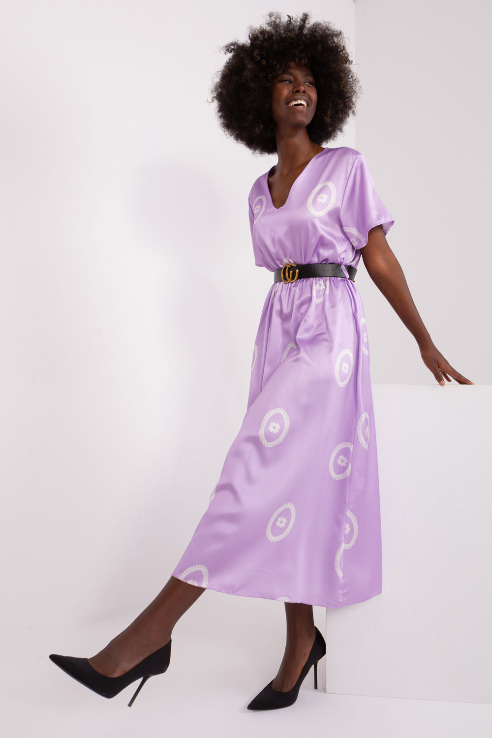 Modelis dėvi vieno dydžio dydį. Modelio matmenys: ūgis 168 cm, krūtinė 82 cm, juosmuo 62 cm, klubai 93 cm.