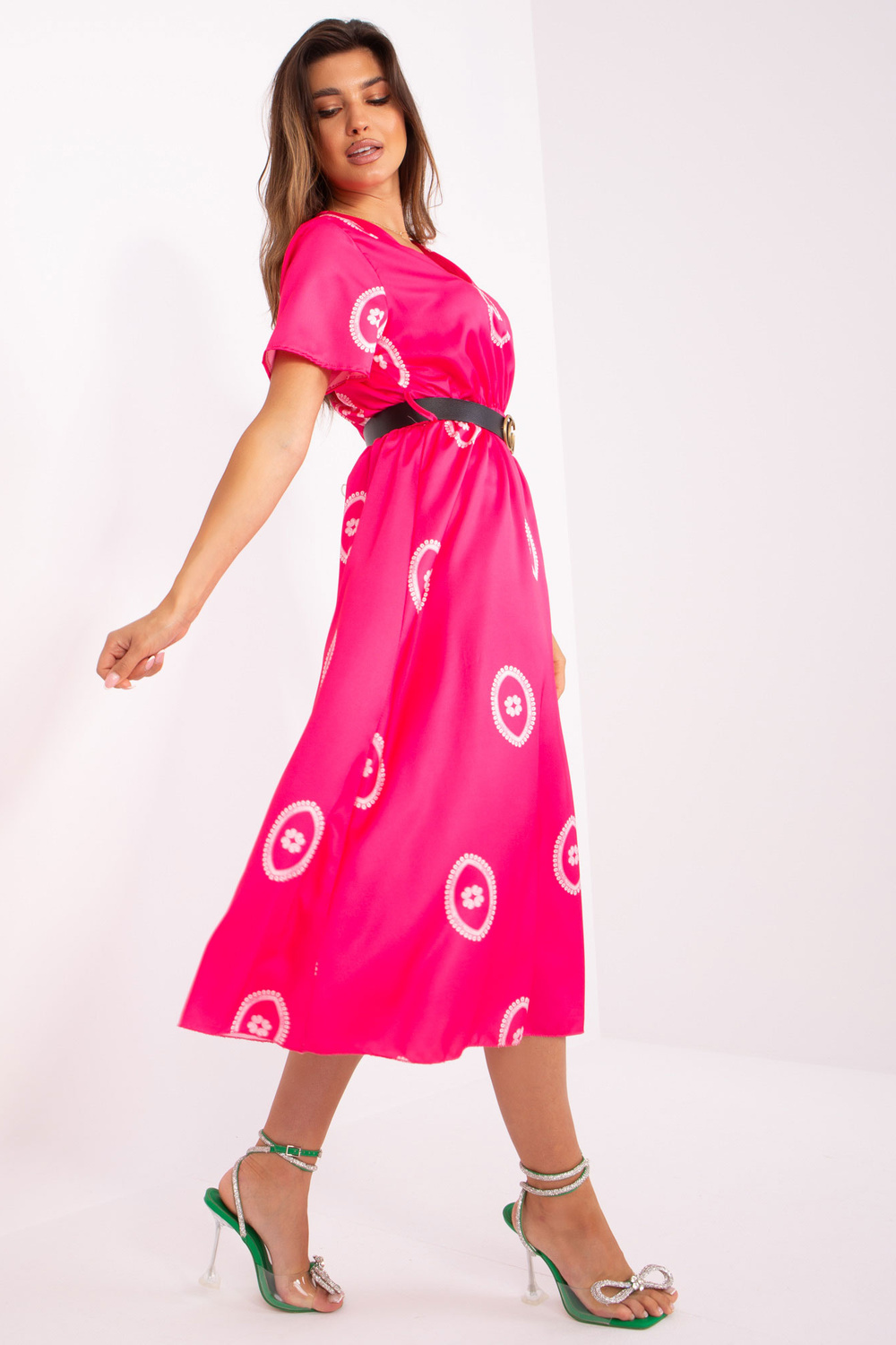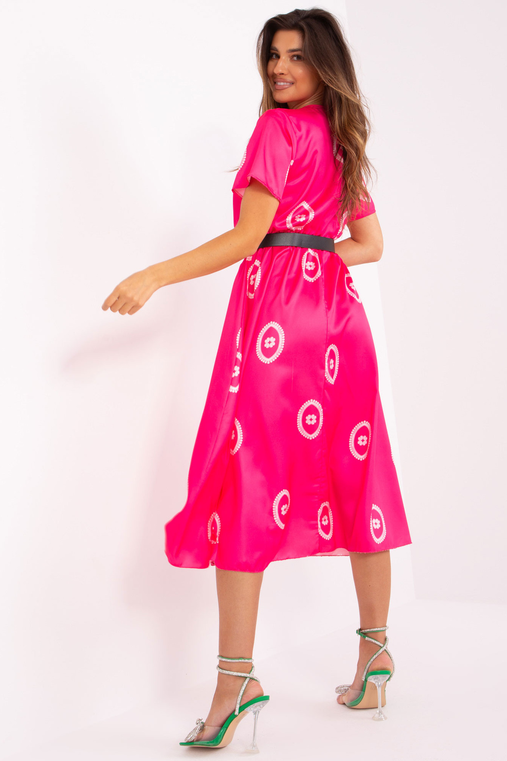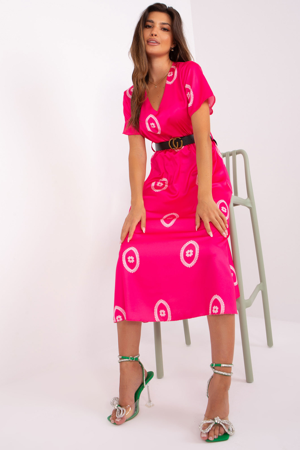 Modelis dėvi vieno dydžio dydį. Modelio matmenys: ūgis 173 cm, krūtinė 89 cm, juosmuo 65 cm, klubai 91 cm.