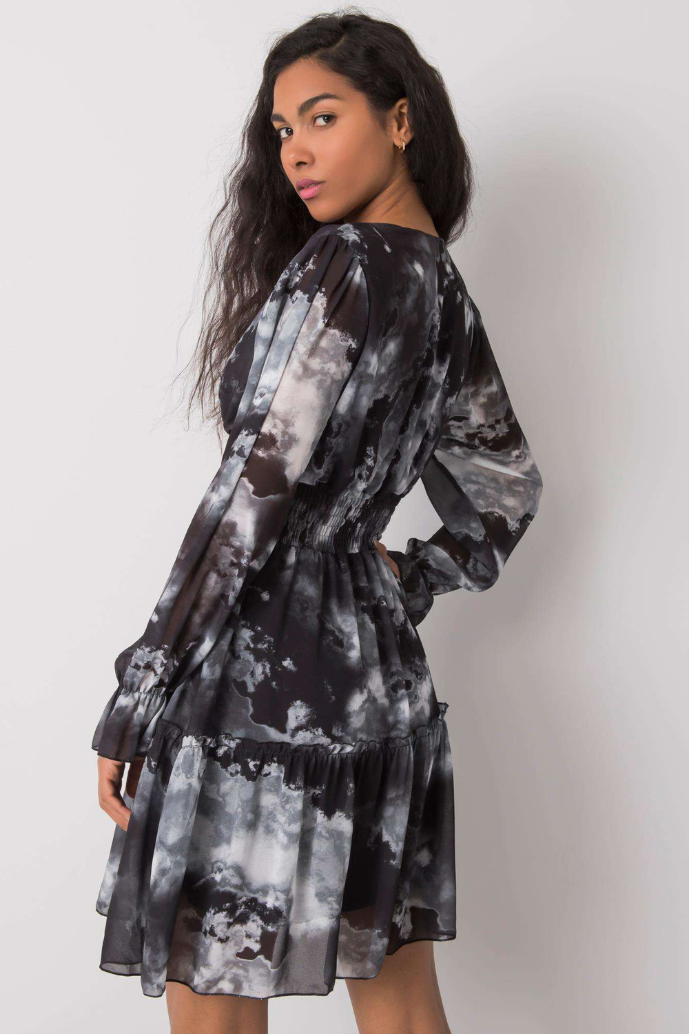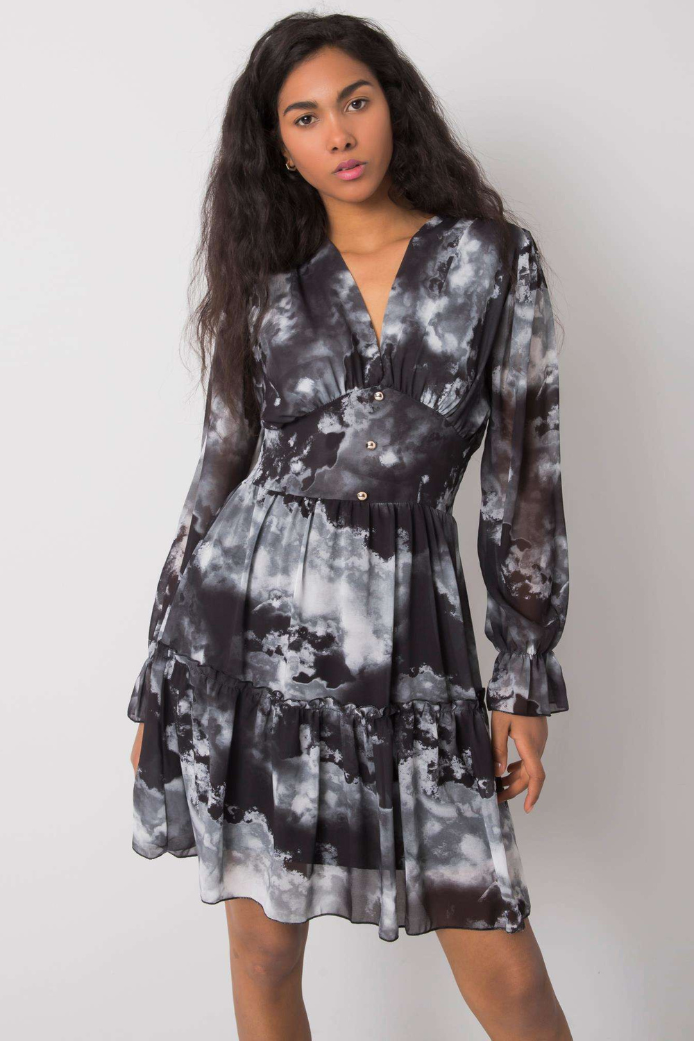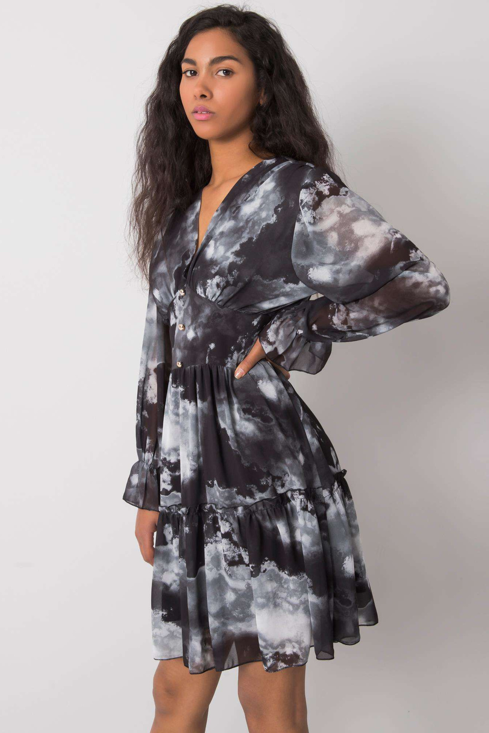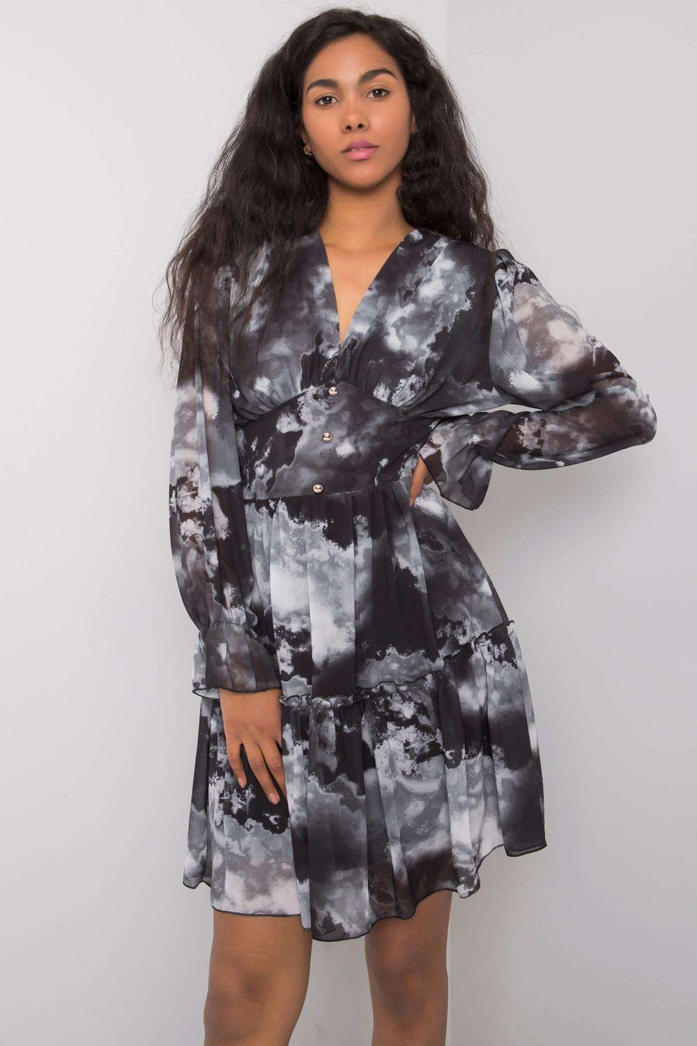 Modelis dėvi vienas dydis. Modelio matmenys: aukštis 174 cm, krūtinė 84 cm, juosmuo 60 cm, klubai 90 cm.