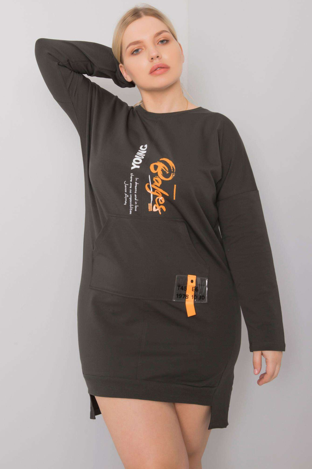 < p> Modelis dėvi vieno dydžio dydį. Modelio matmenys: aukštis 172 cm, krūtinė 102 cm, juosmuo 77 cm, klubai 118 cm.Vieno dydžio suknelės matmenys matuojami plokščiai: plotis po pažastimis - 56 cm, bendras ilgis - 89 cm, rankovių ilgis - 58 cm