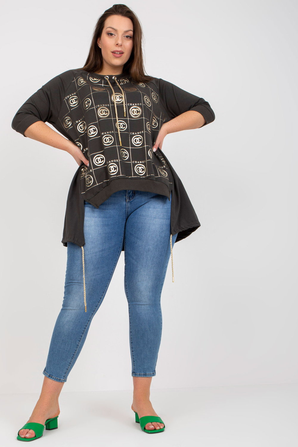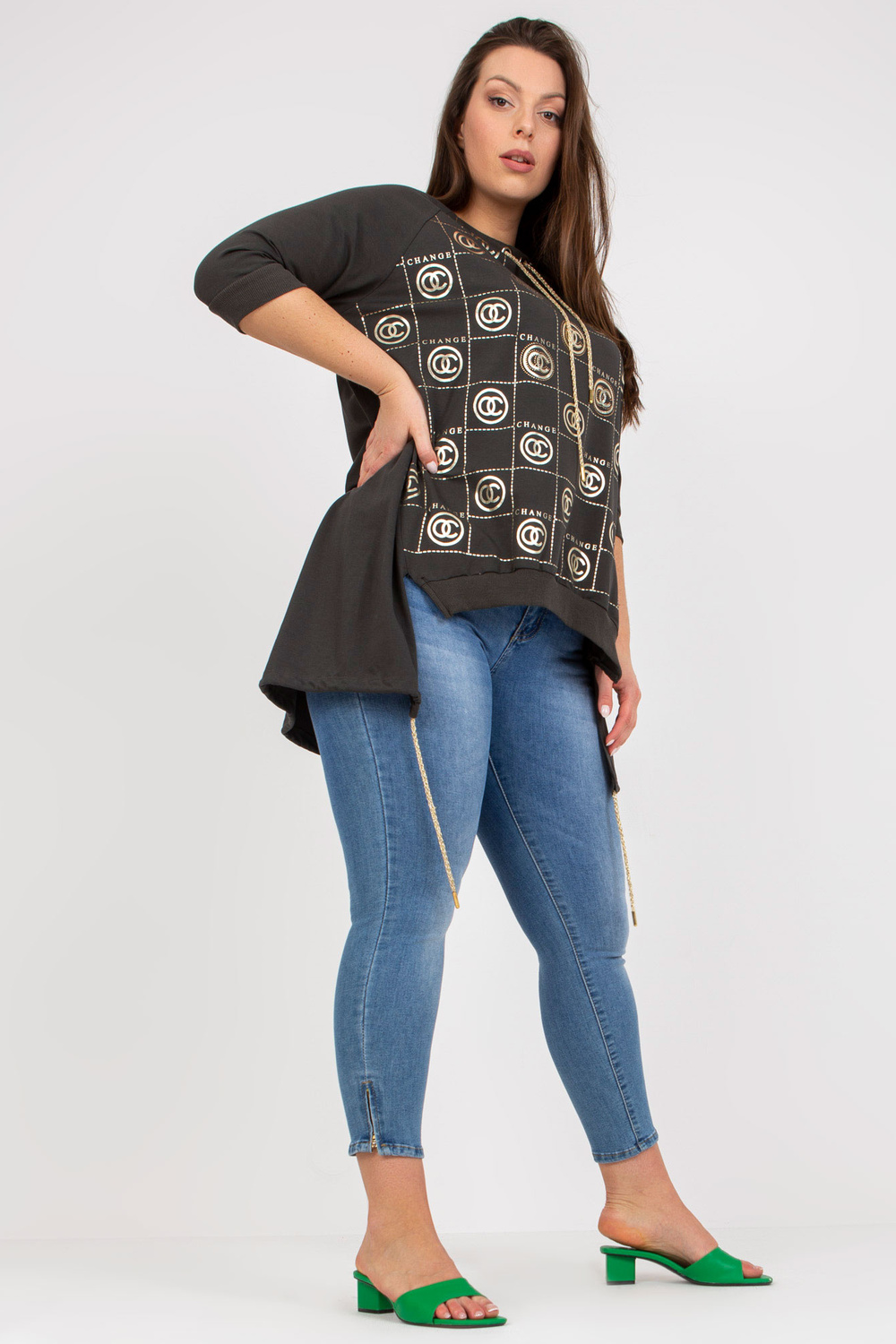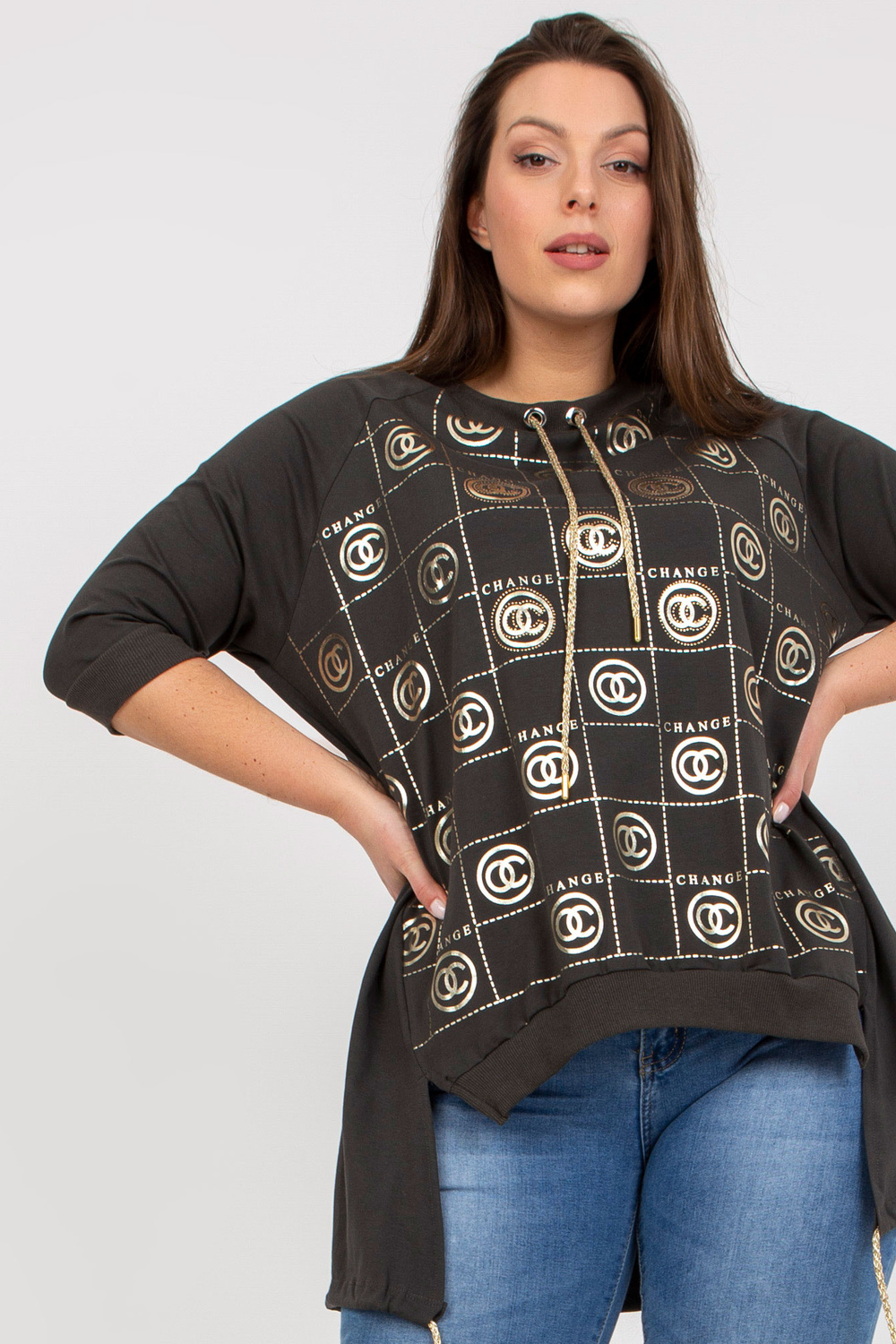 Chakiasimetriška plius dydžio palaidinė su raštu .