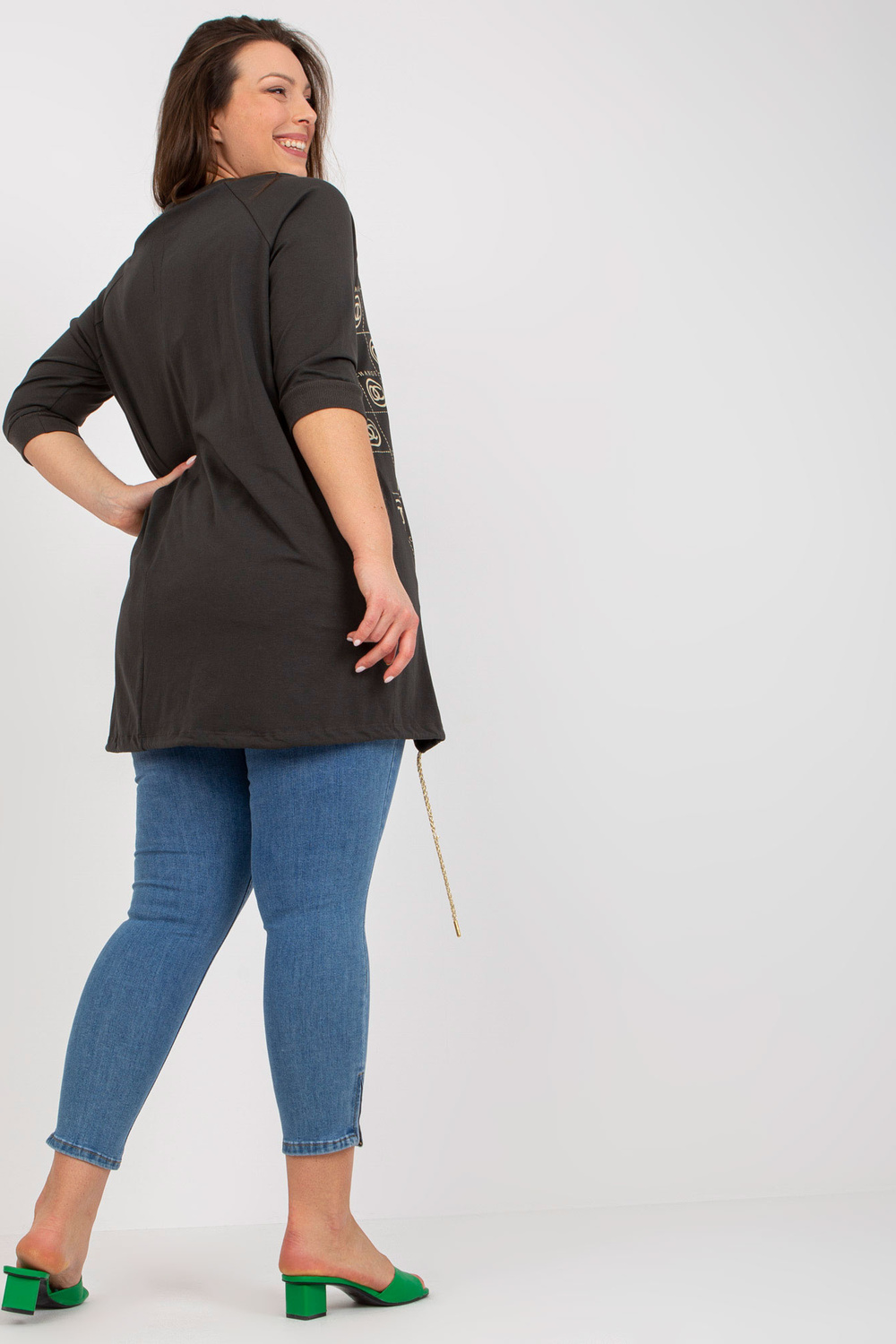Khaki spalvos asimetrinė plius dydžio palaidinė su raštu
