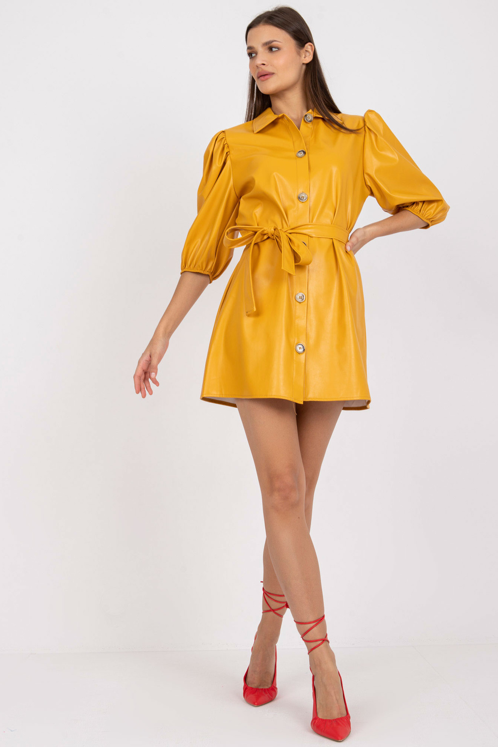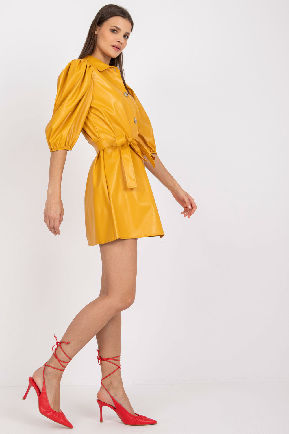 Geltonmarškinė laisvalaikio suknelė iš odos .