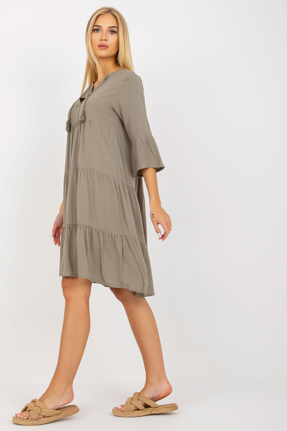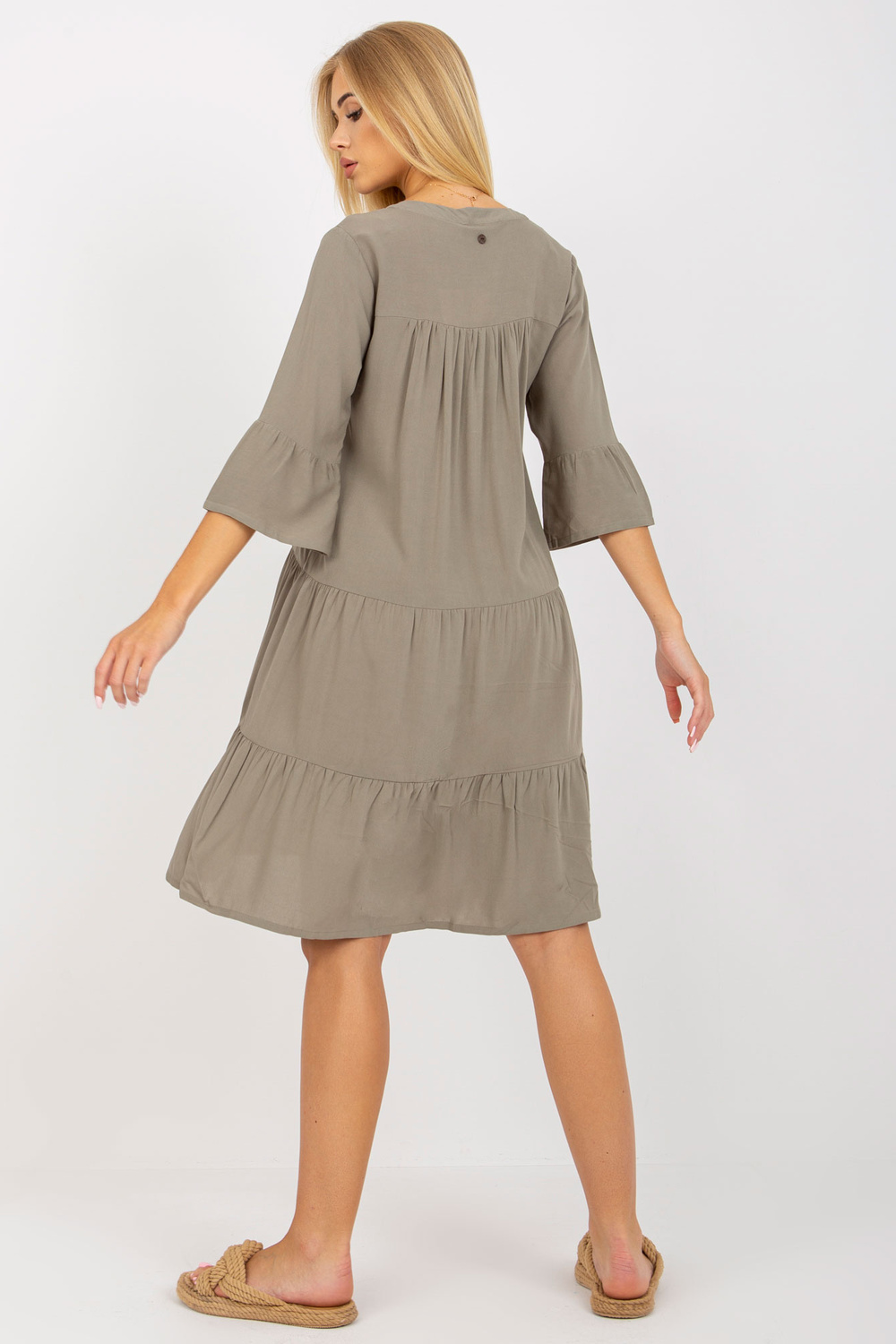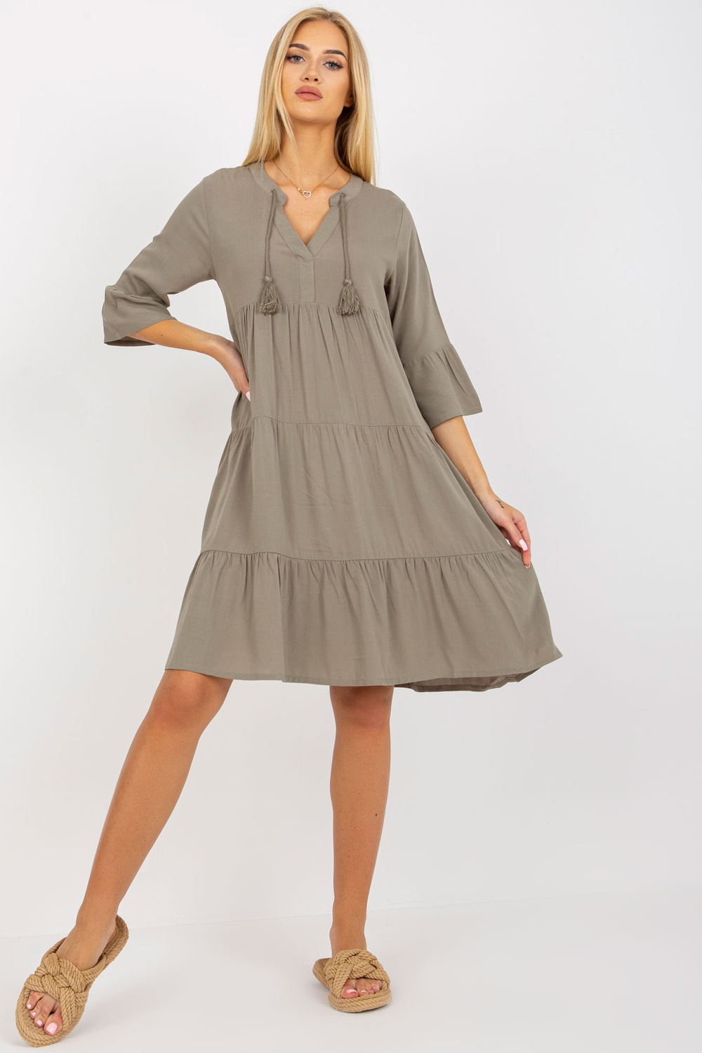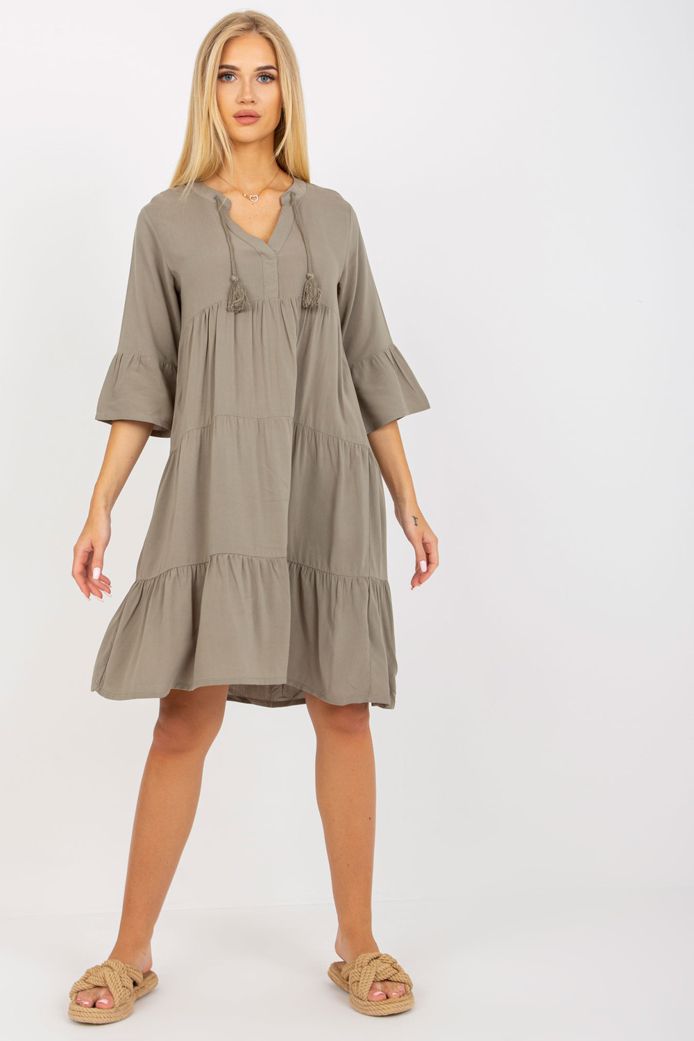 Chaki spalvos viskozės suknelė su raukiniais ir V formos iškirpte .
