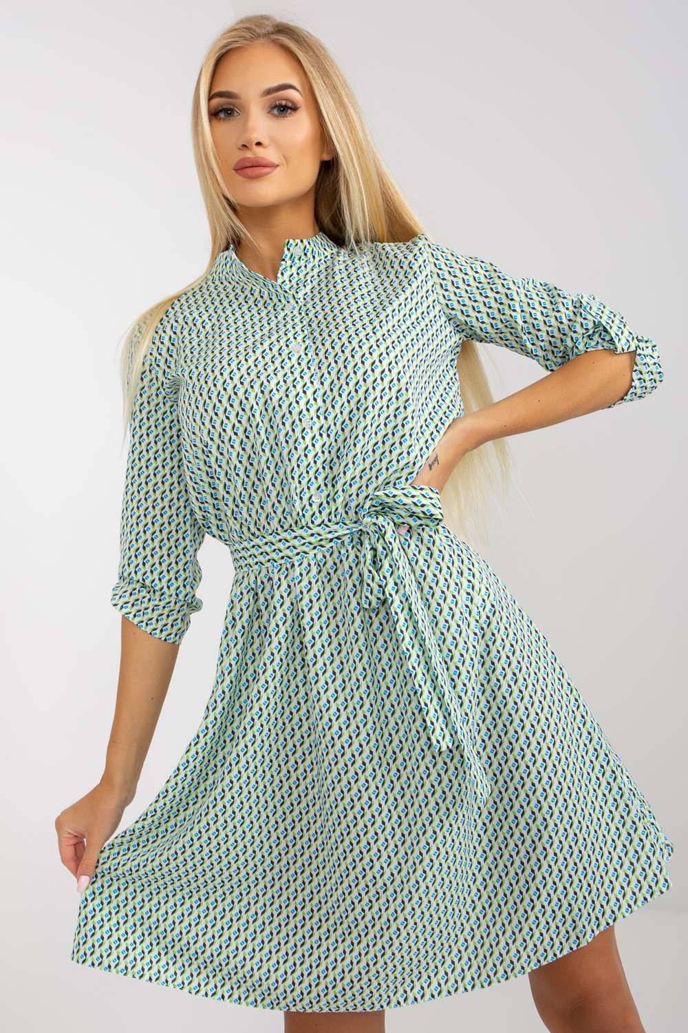 Balta-žalia laisvalaikio suknelė su sagomis . medžiagasudėtis: 35% medvilnė, 25% poliesteris, 20% viskozė, 20% elastanas skalbimo būdas: skalbimas mašinoje 30°C Gaminio kodas: LK-SK-508938.28X dominuojantis raštas: spausdinimas Stilius: kasdienė proga: kasdien, vasarai