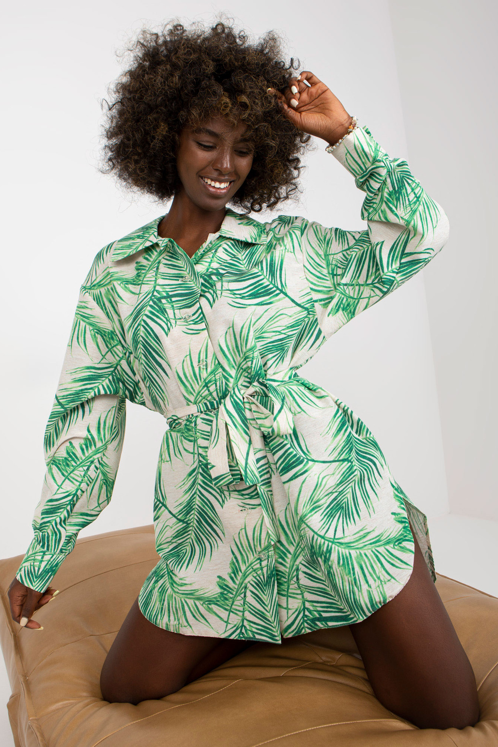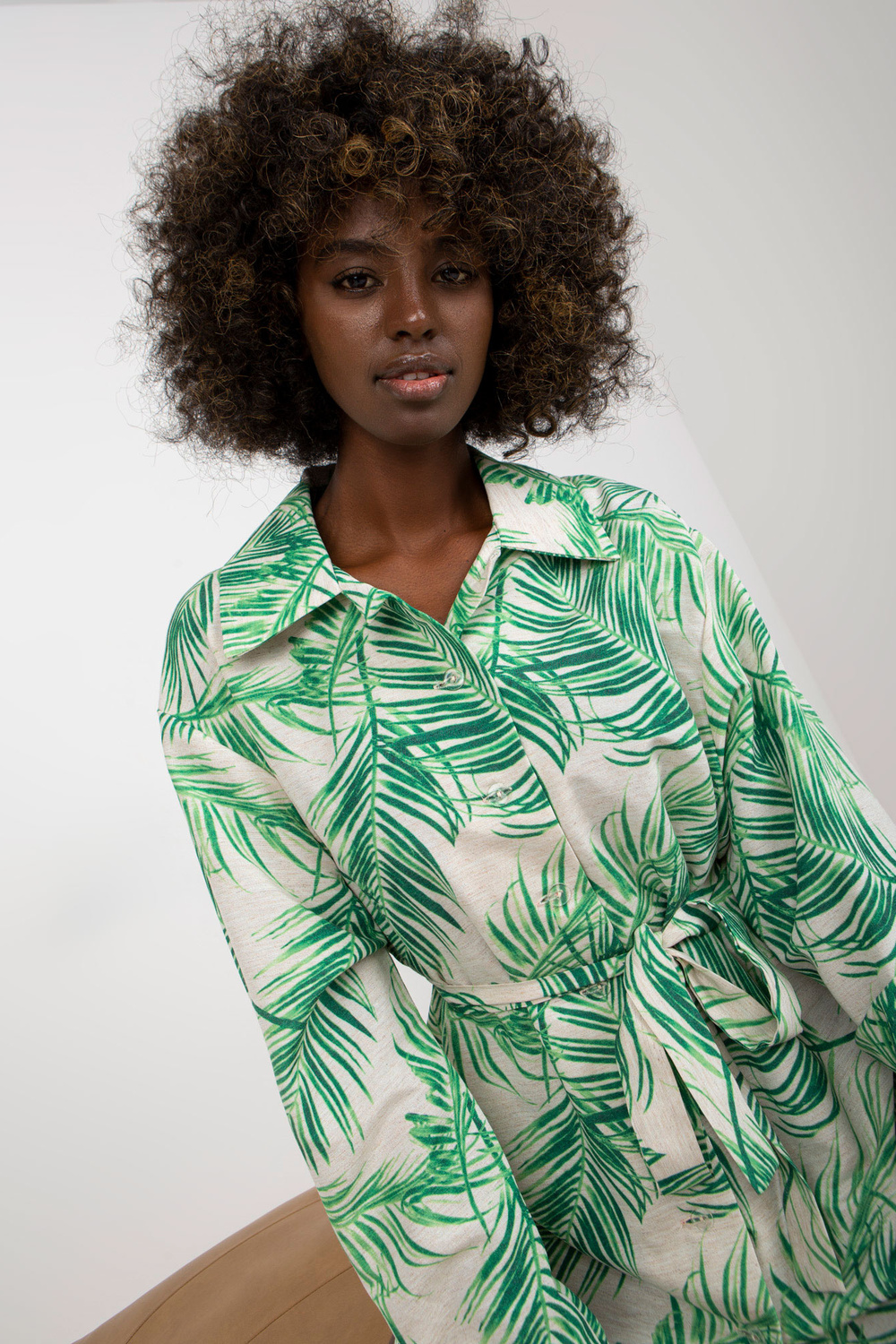 Žalios ir smėlio spalvos lininė suknelė su raštu .