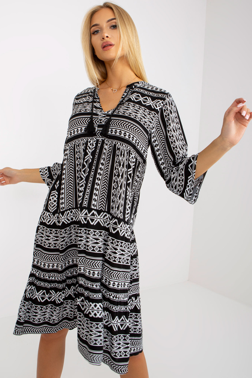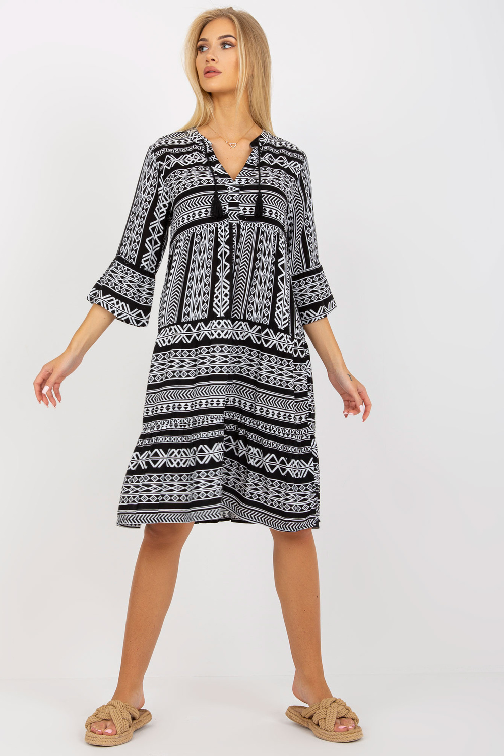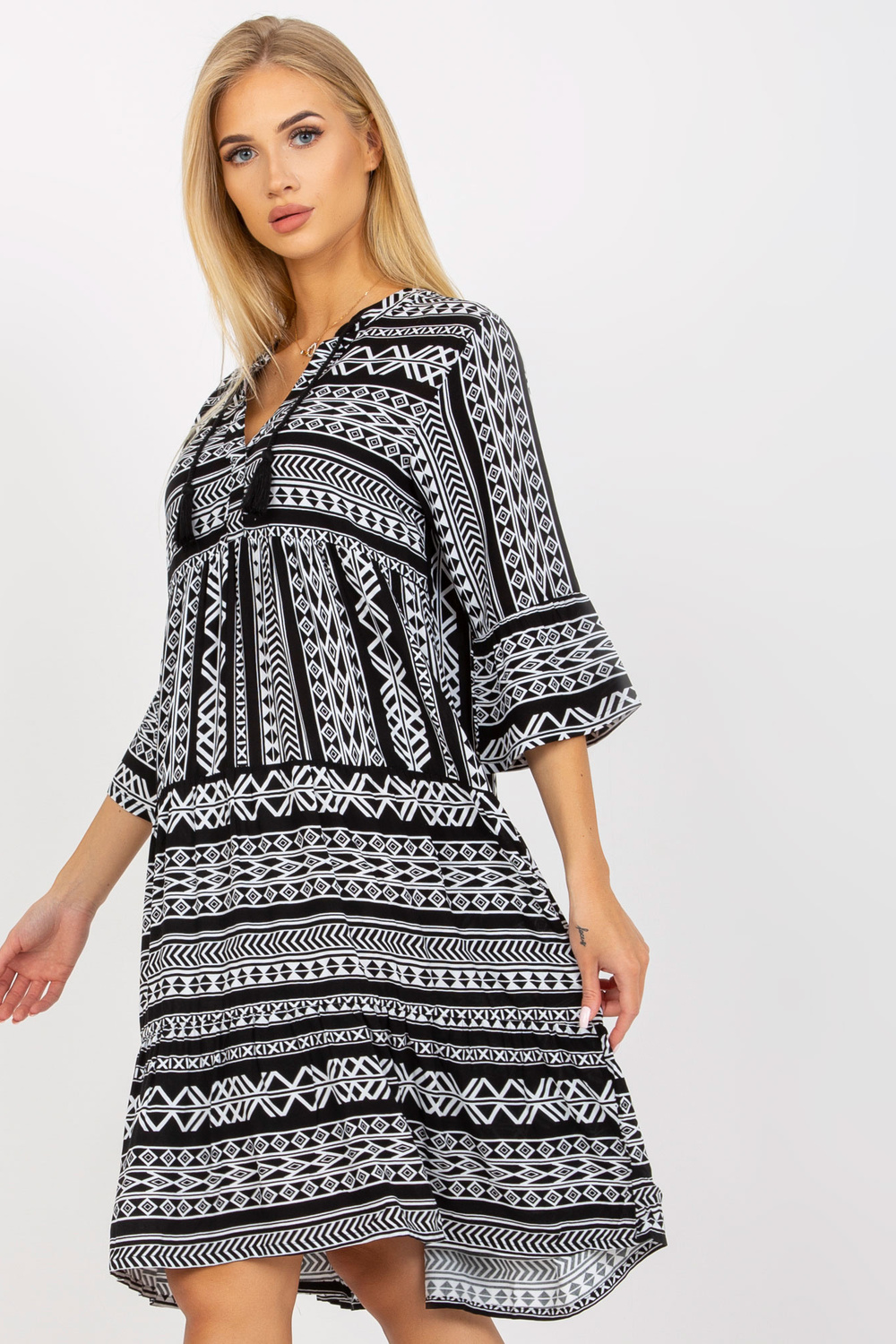 Juoda raštuota suknelė su raukiniais ir 3/4 rankovėmis .