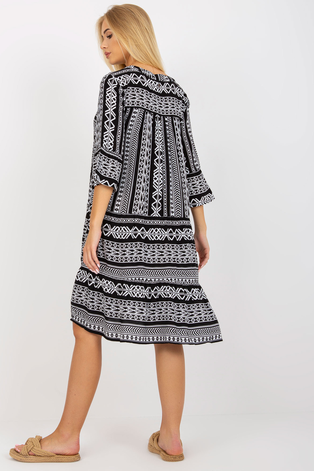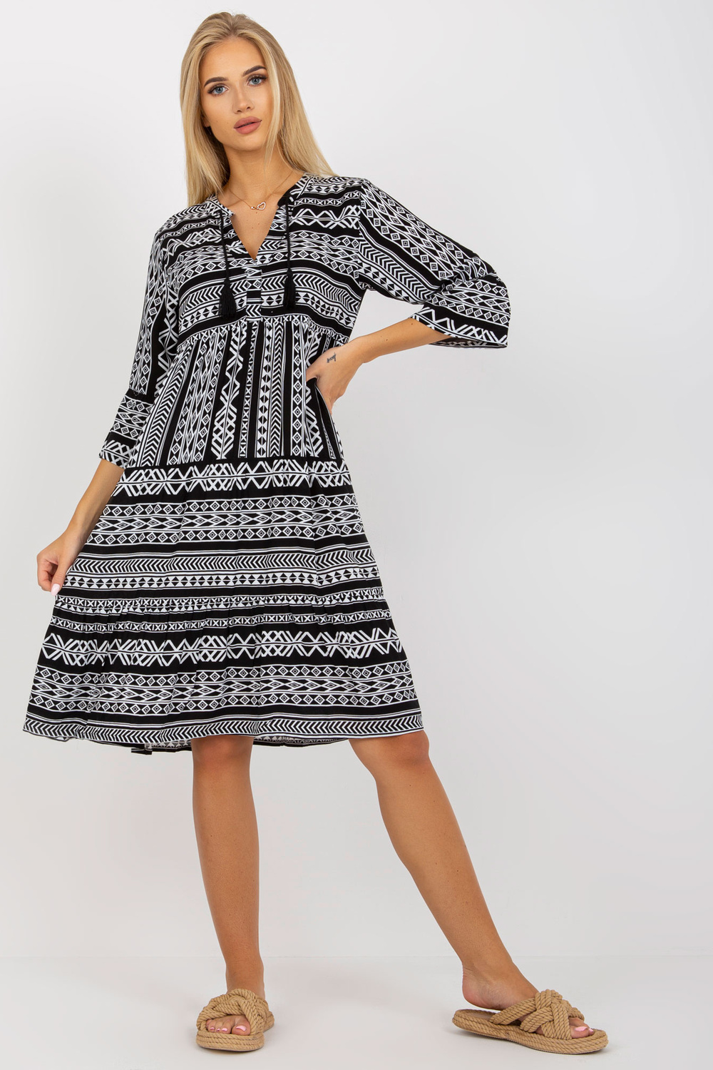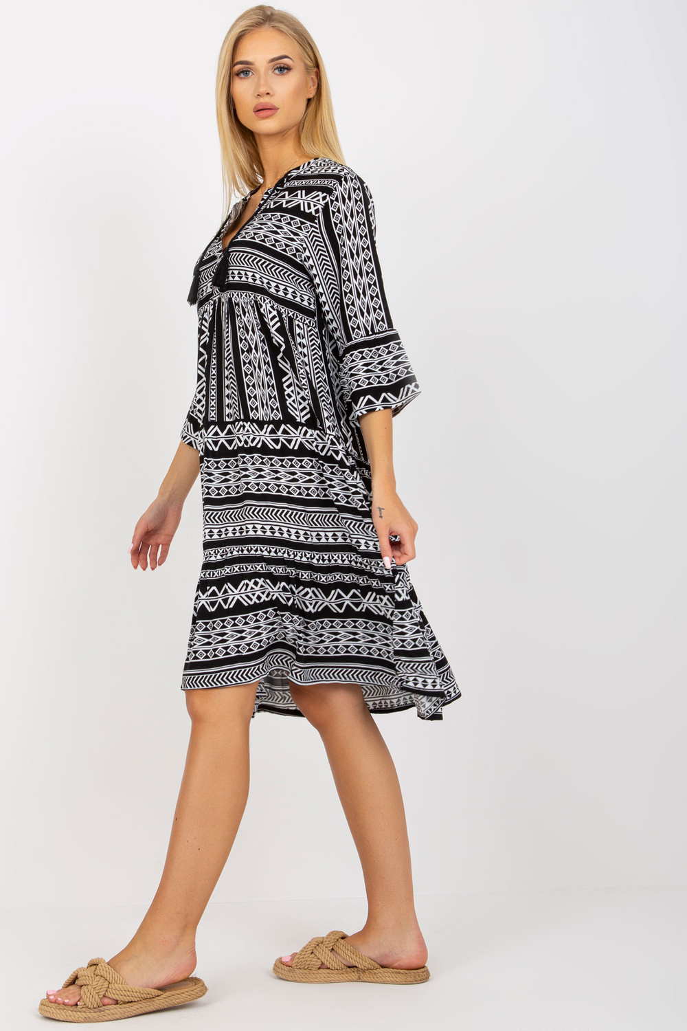 Juoda raštuota suknelė su raukiniais ir 3/4 rankovėmis .